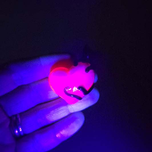 Each Clingy Kitty is grabbing onto a solid heart and features a hidden bale, making it easy to wear on a chain or cord. They come boxed with a ball chain & sticker.
