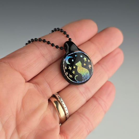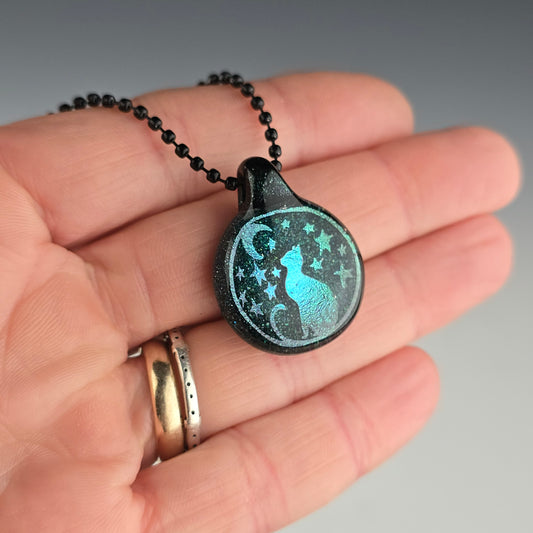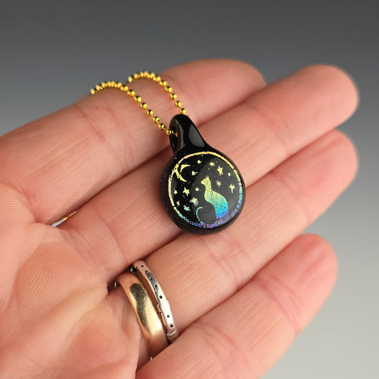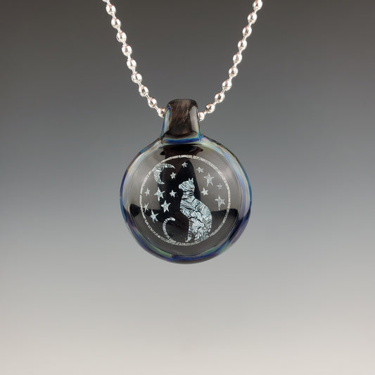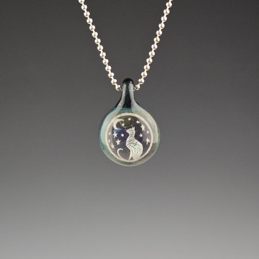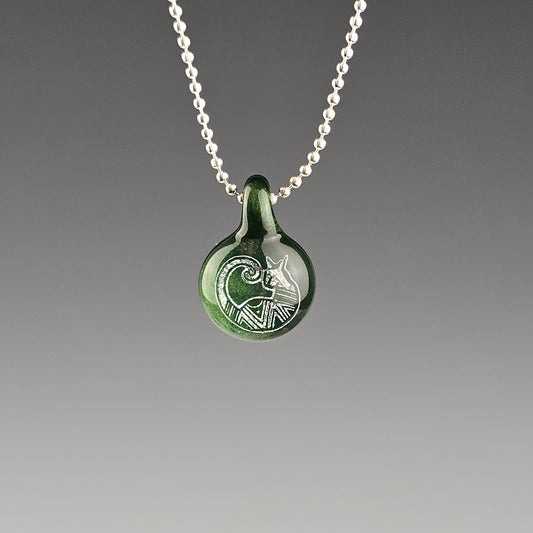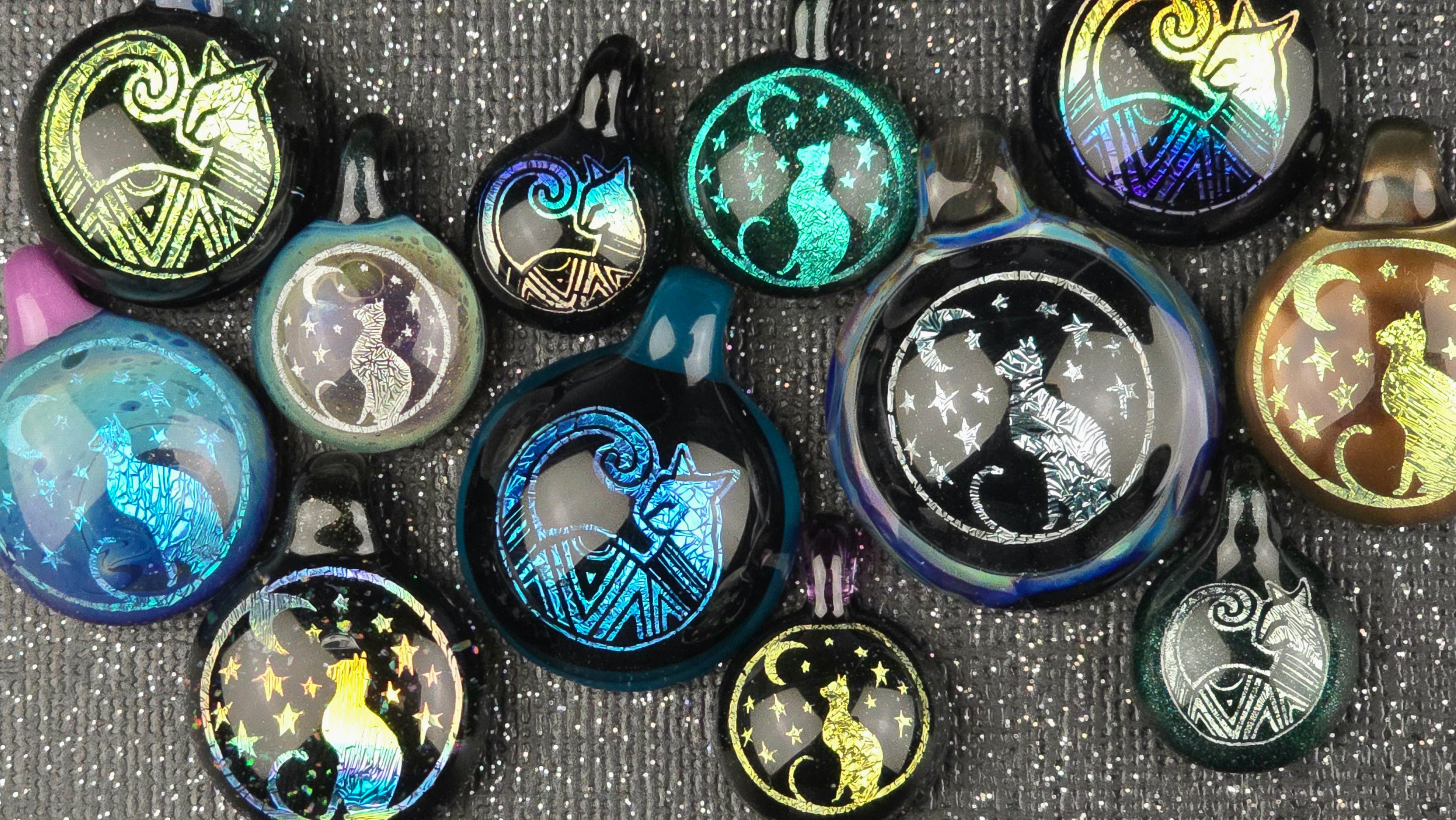 Once the designs are etched, the glass is carefully cut into "chips", which are then sent back to me to begin the handcrafting process. Each chip is heated up and melted between a clear glass lens and a colored backing. Finally, I add a loop (or bale) and anneal the piece in a kiln at 1050°F for strength and durability.