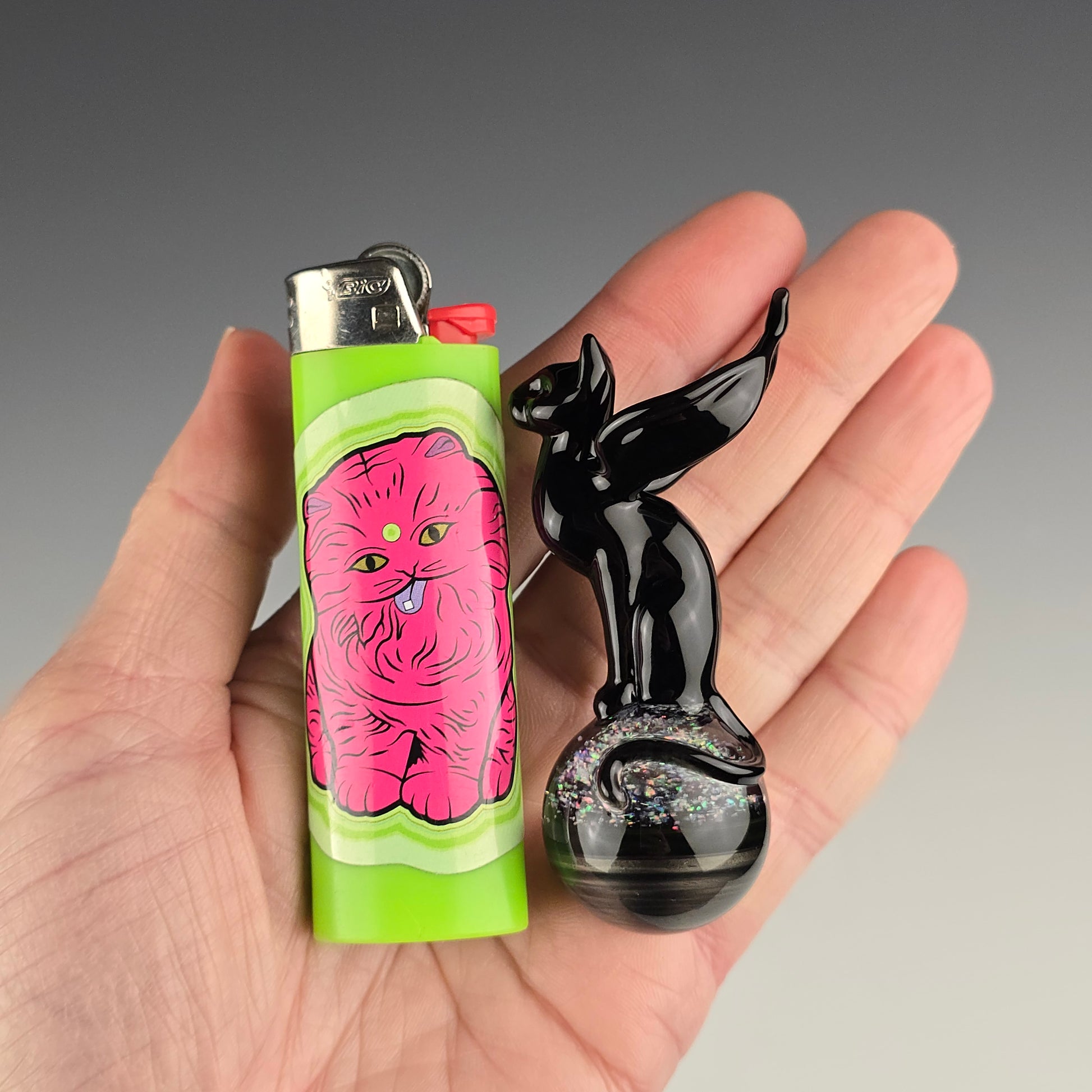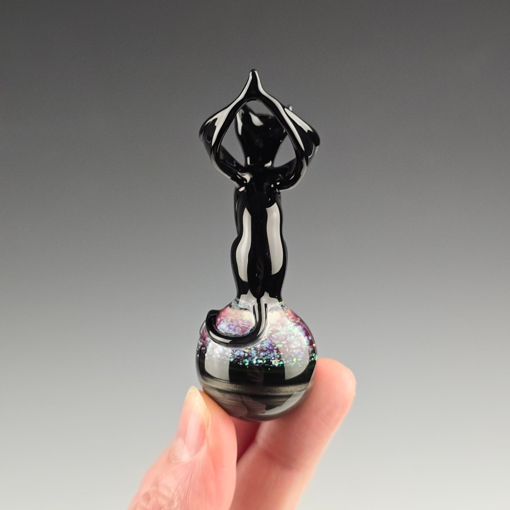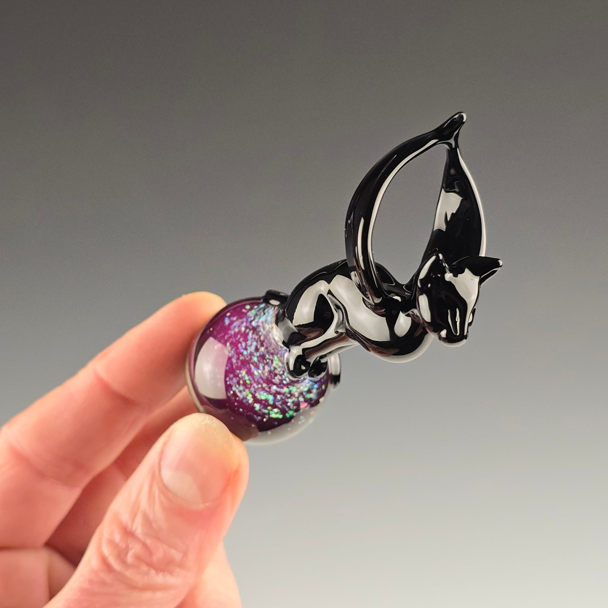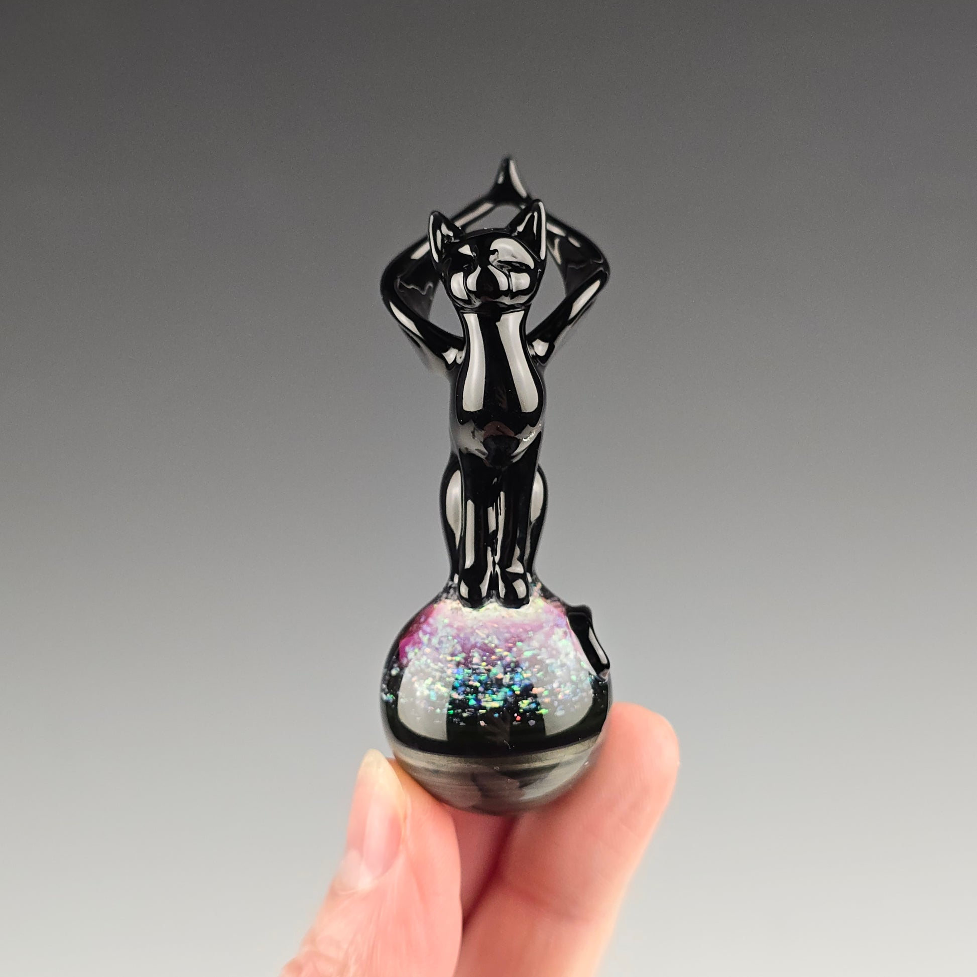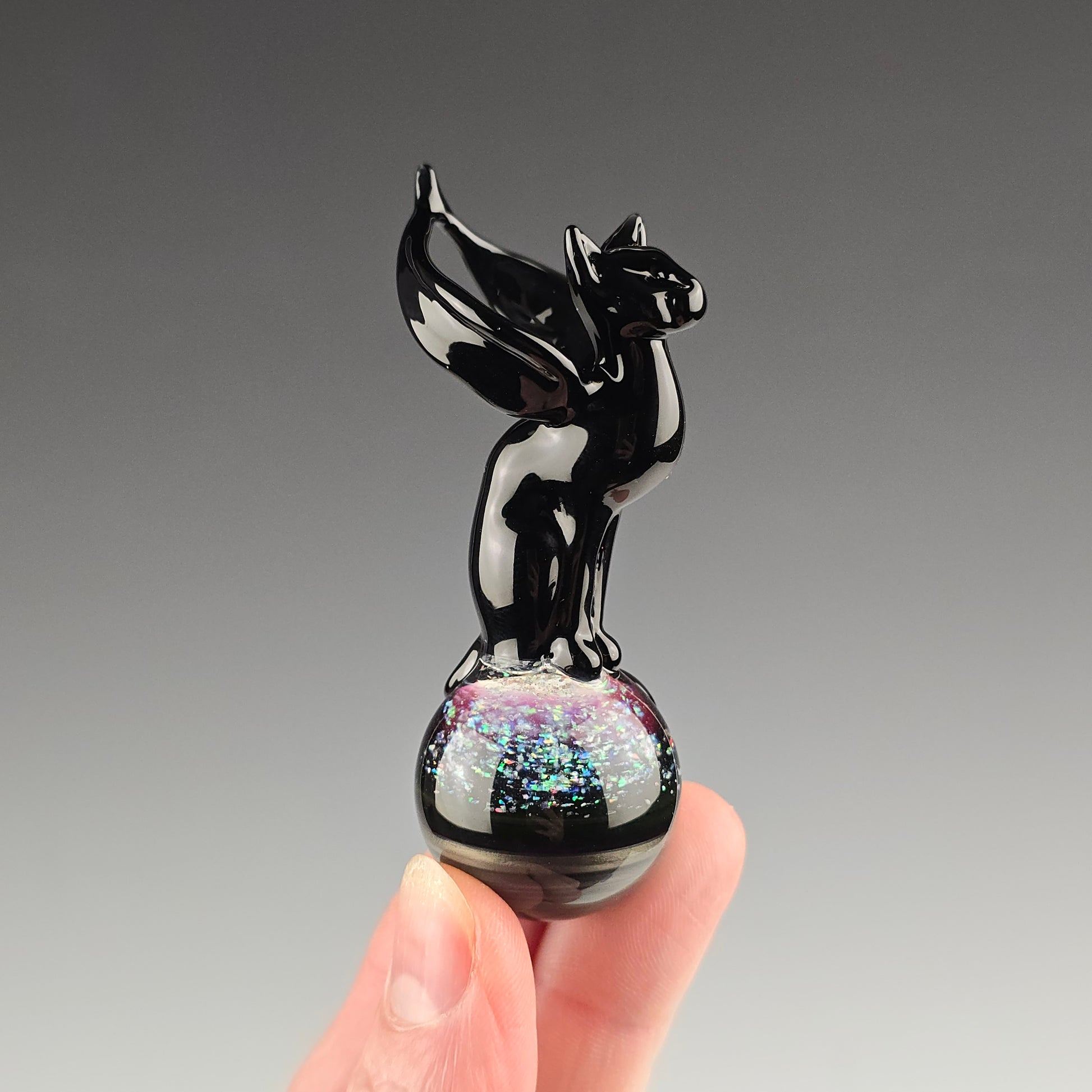This winged Angel Kitty is made with Onyx and sits atop a 26.75mm marble made with Electrum, Royal Jelly and crushed opals in clear. Comes boxed with stickers. Will be signed and dated with a titanium pen.
