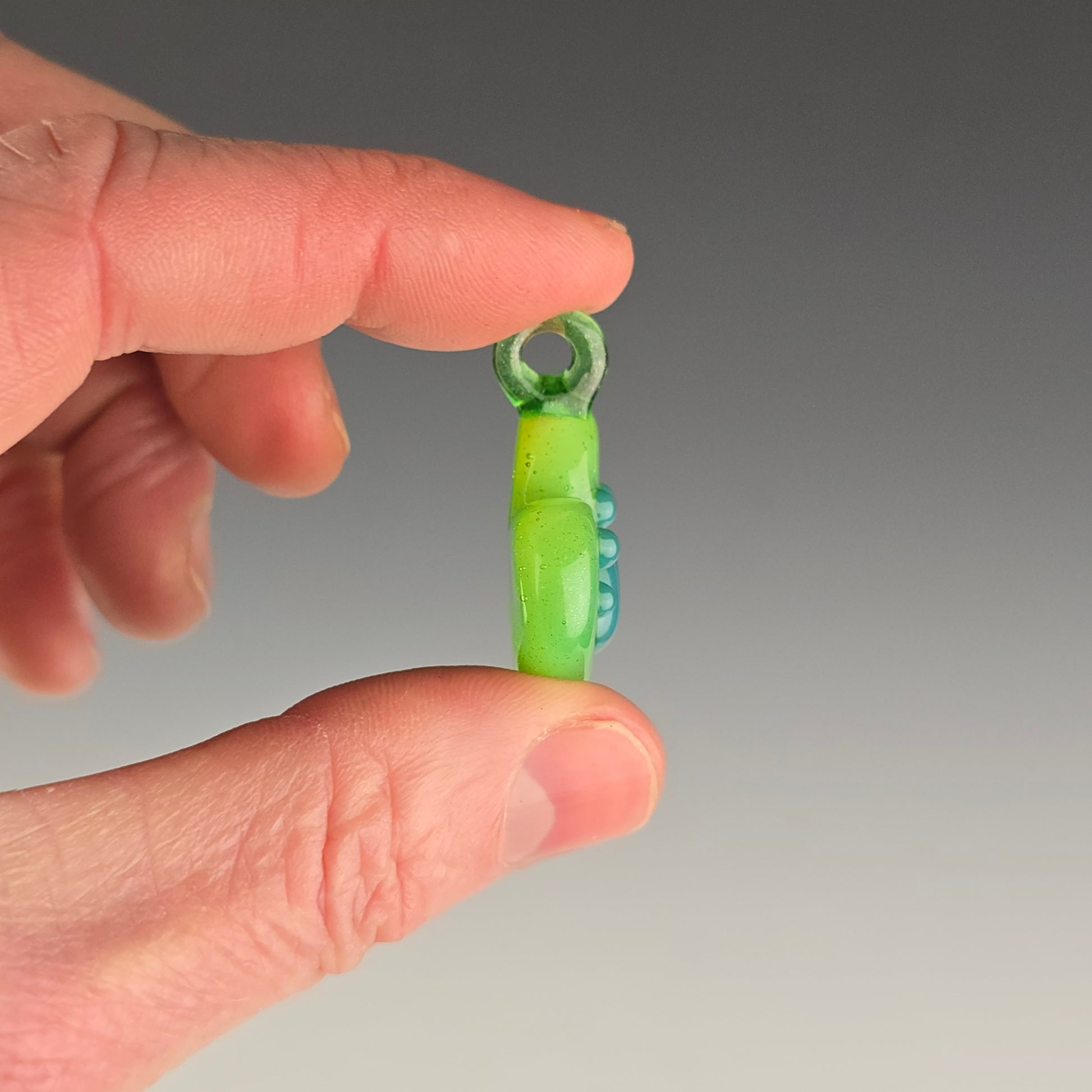 All pendants are individually handcrafted from COE 33 borosilicate glass—no molds are used. Each piece is shaped by hand using graphite tools and then kiln-annealed at 1050°F to ensure strength and durability.