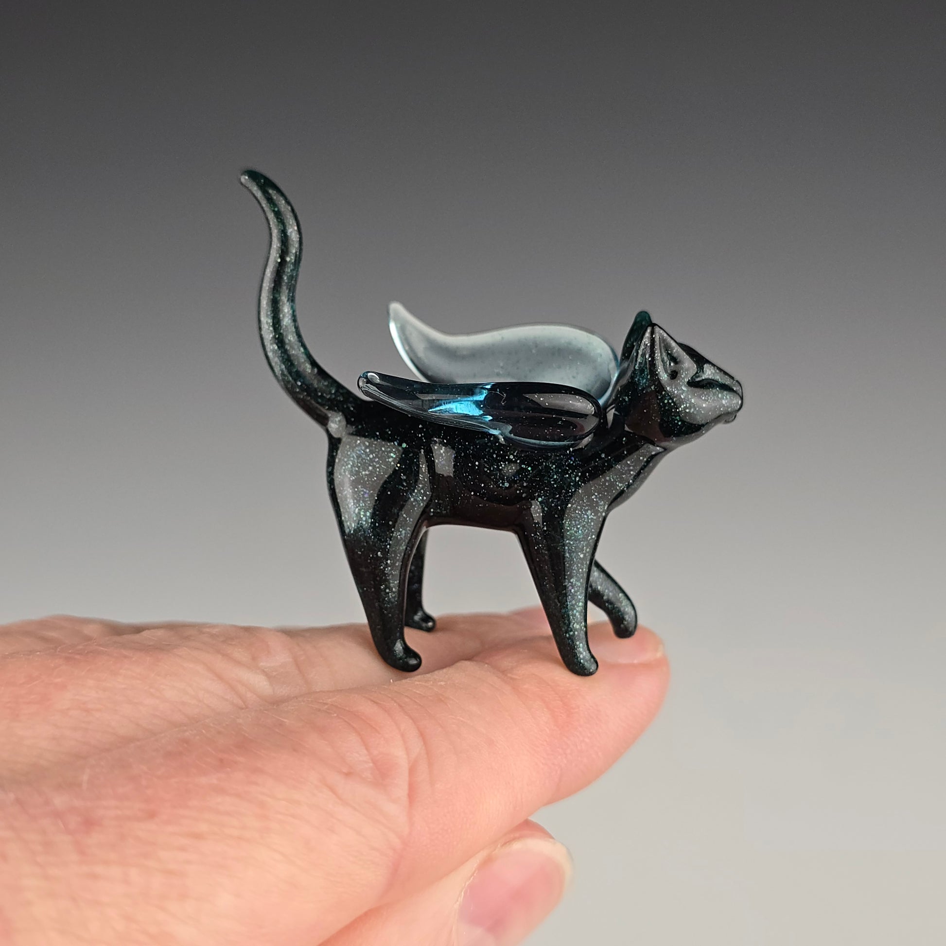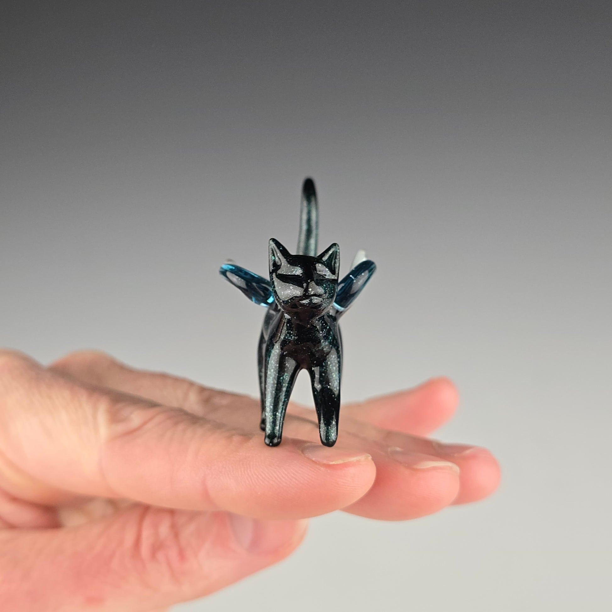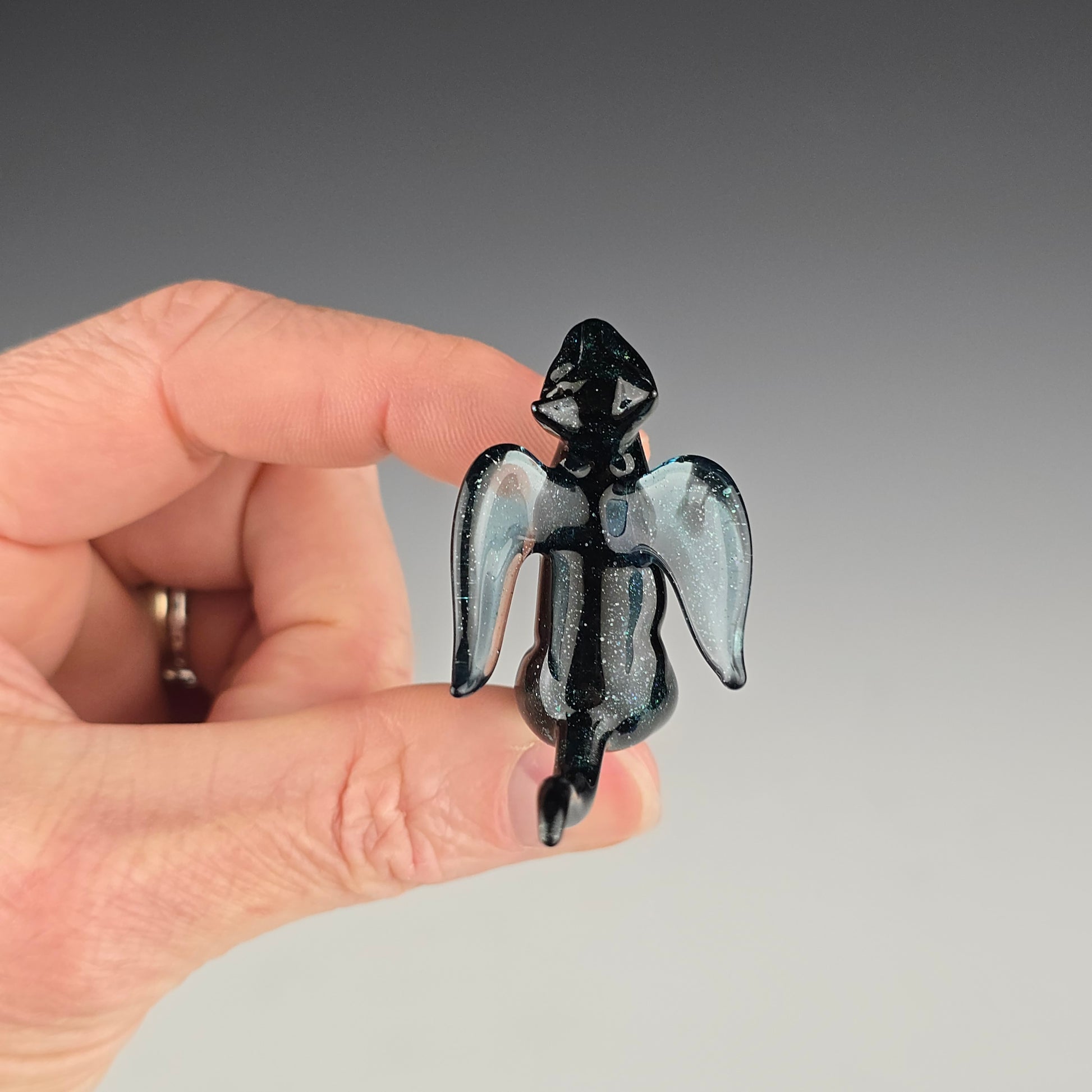 This little angel is made with Blue Leprechaun, which is a very sparkly dark blue. The wings are made of Blue Stardust. This is a small glass sculpture, see photos for size reference.