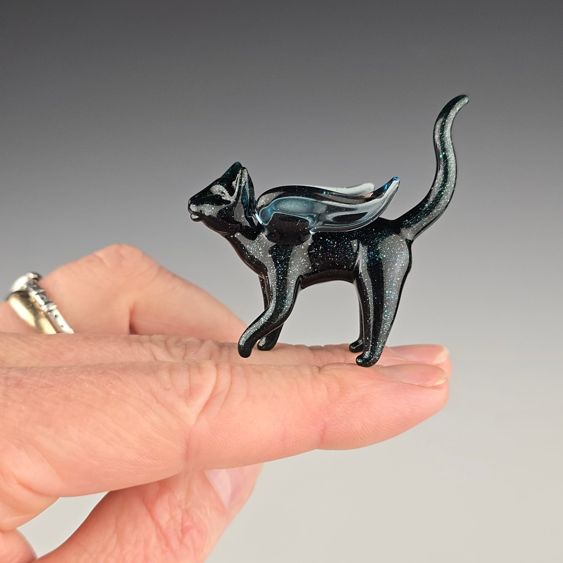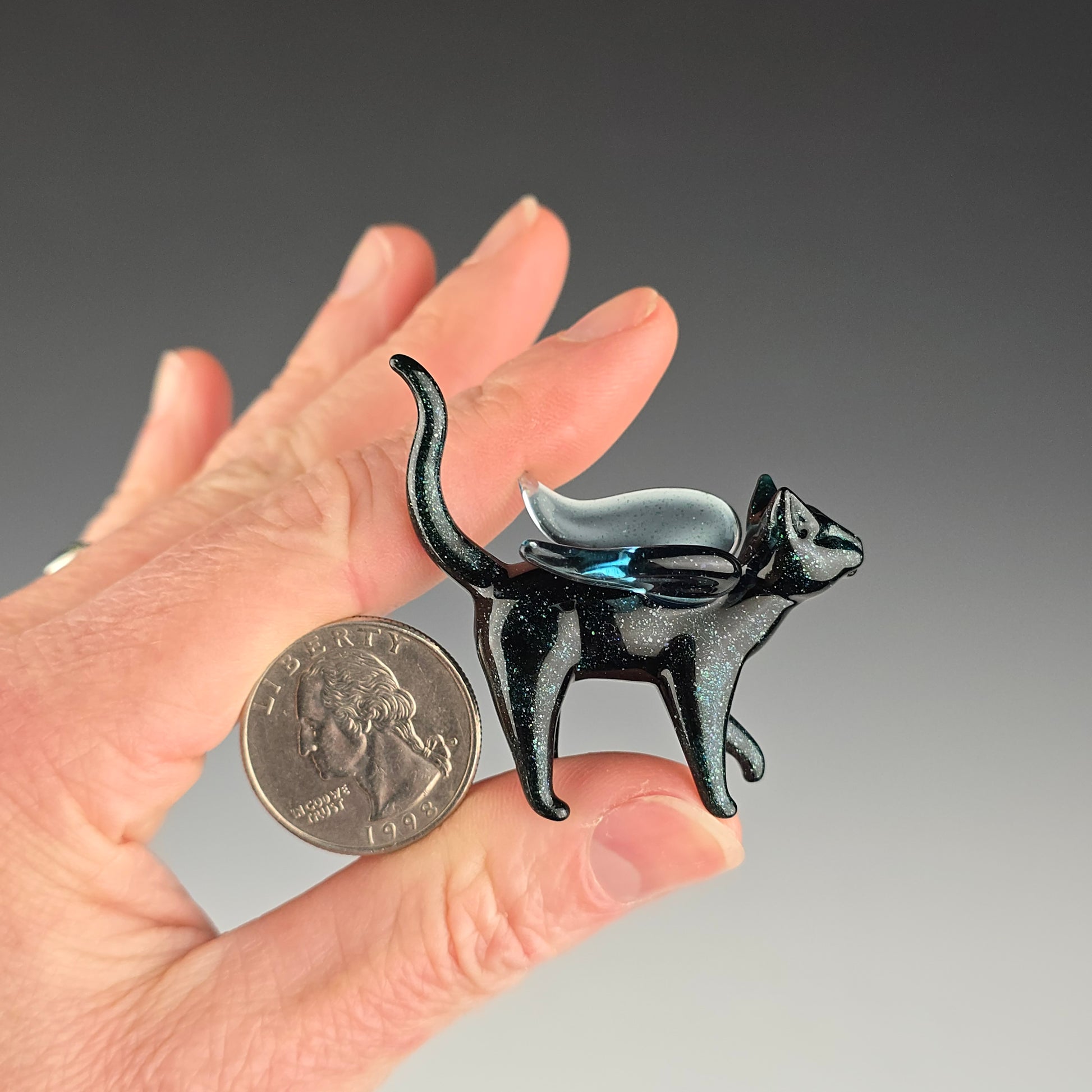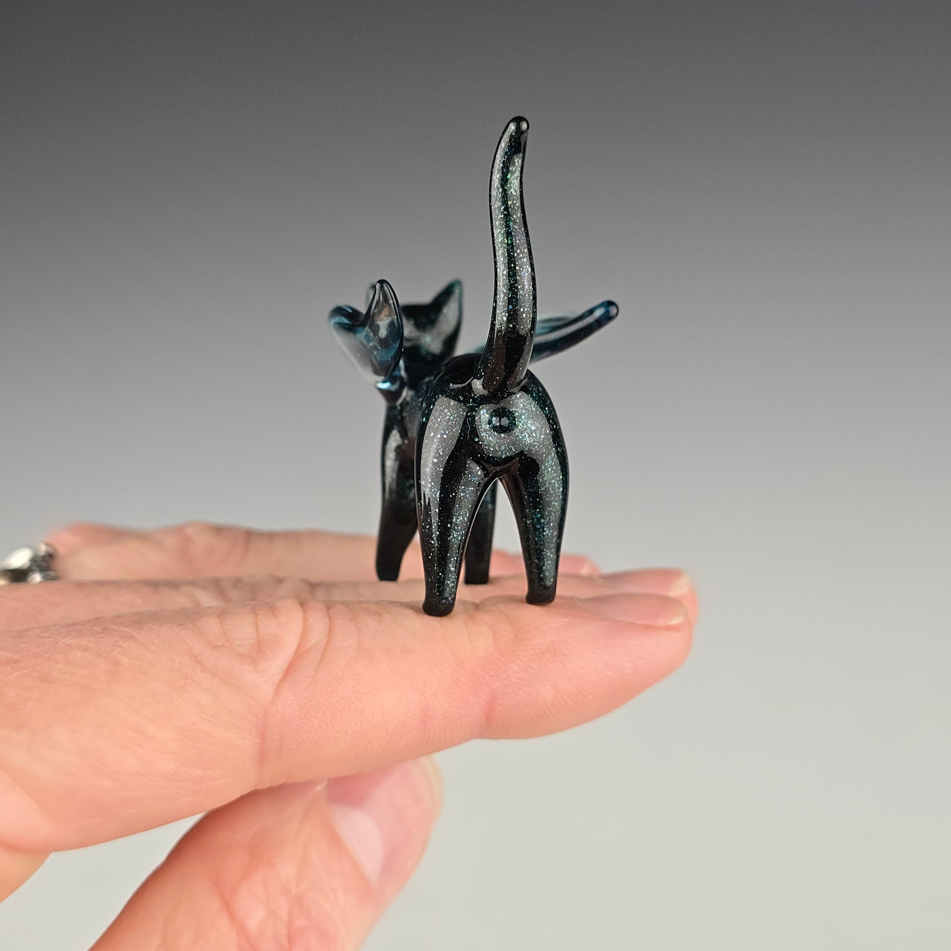 This little angel is made with Blue Leprechaun, which is a very sparkly dark blue. The wings are made of Blue Stardust. This is a small glass sculpture, see photos for size reference.
