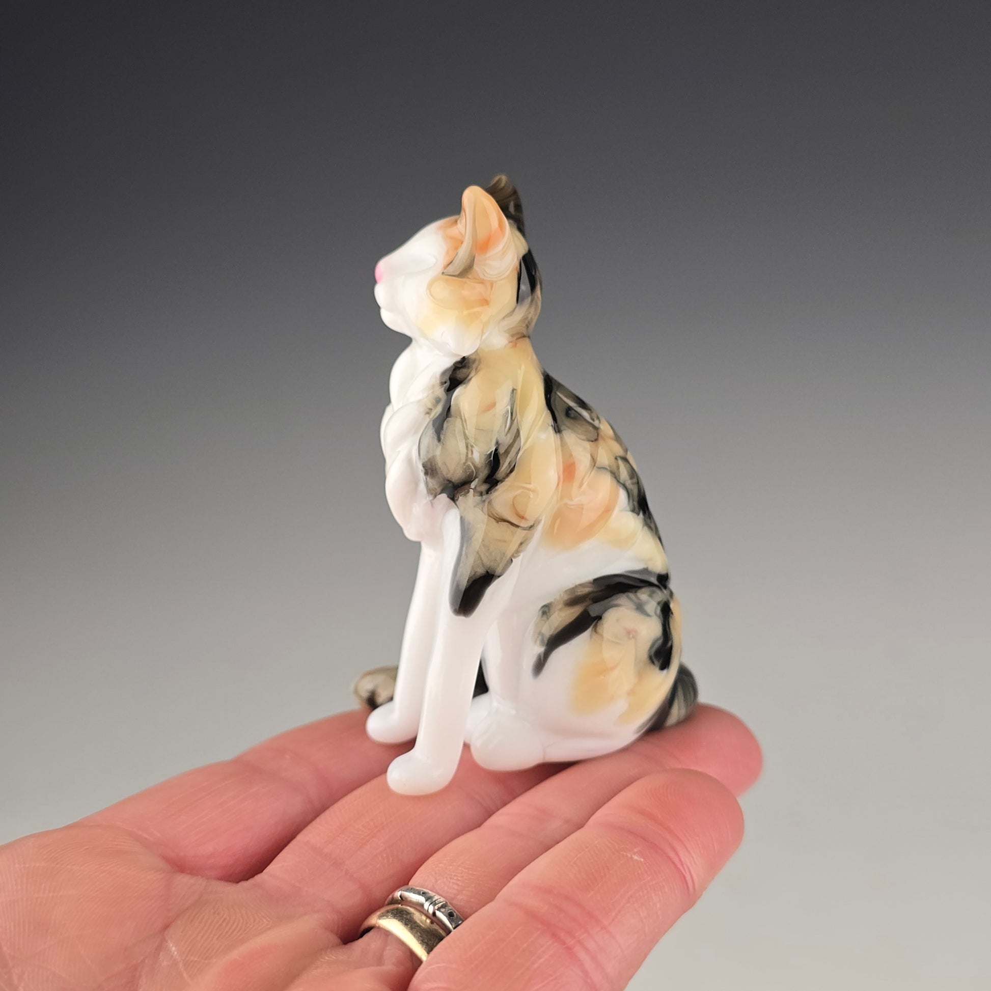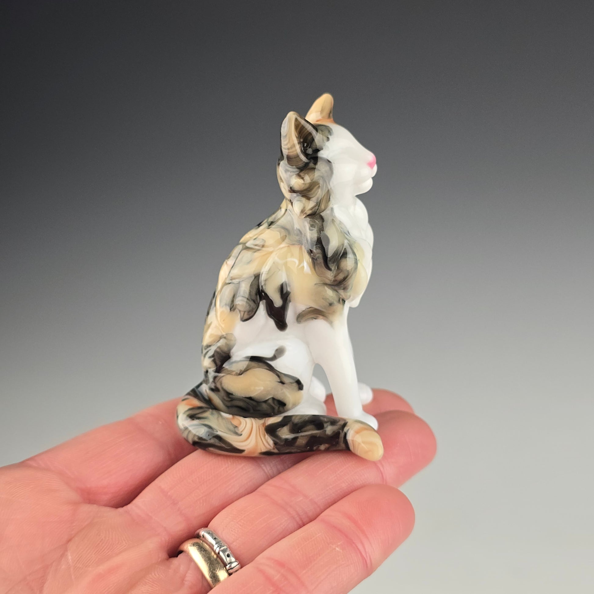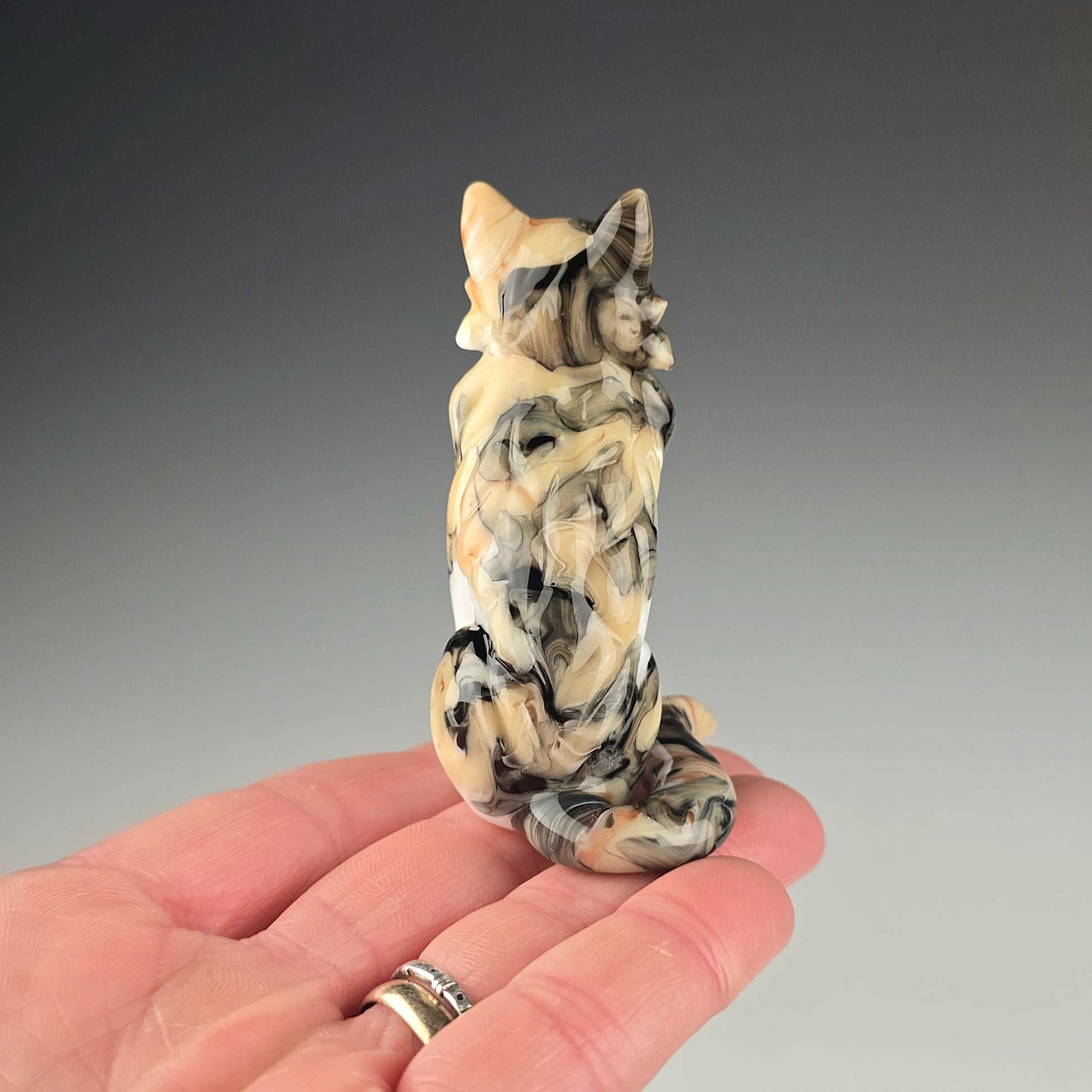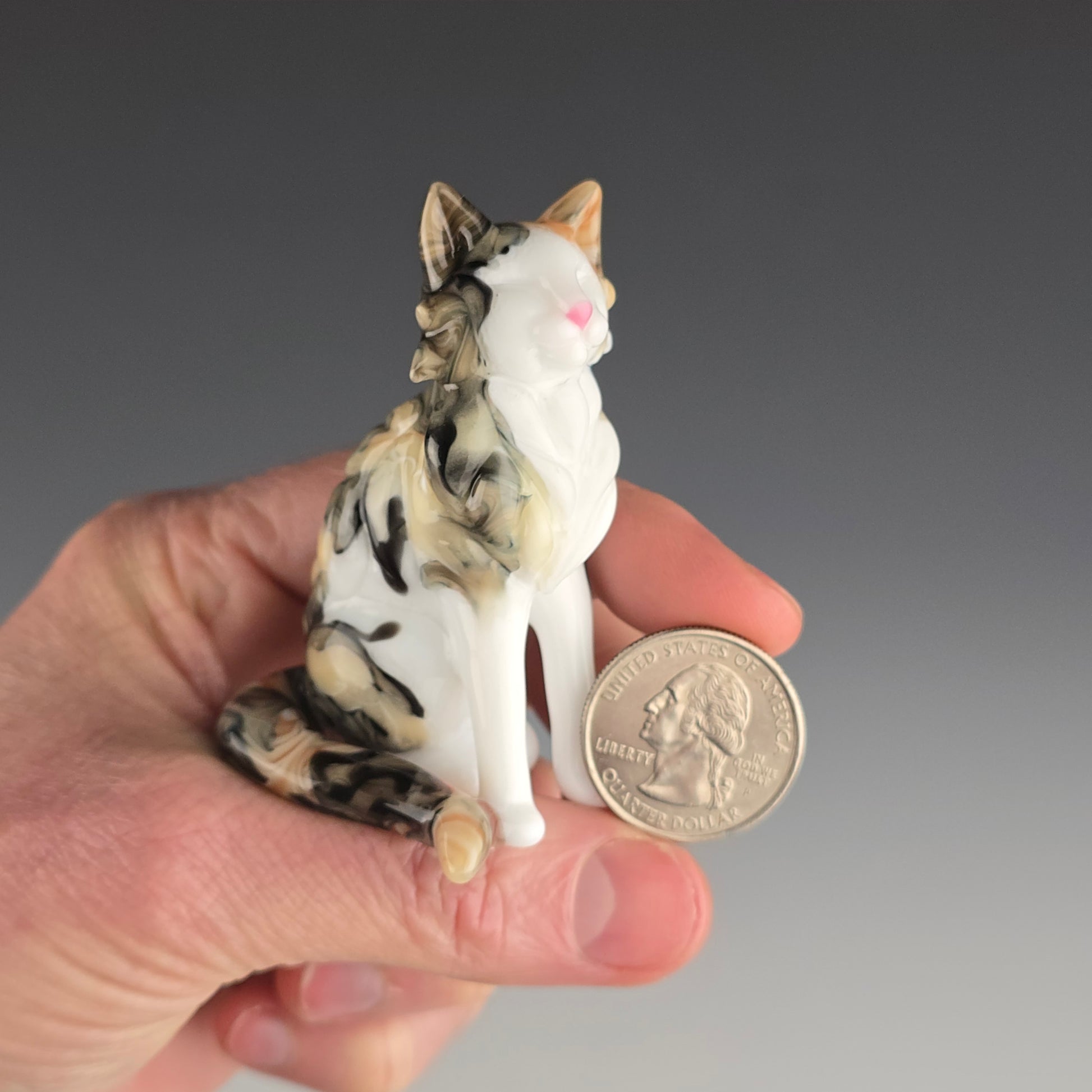 This small sculpture was inspired by a Calico Norwegian Forest Cat. This is my first attempt at a "fluffy" cat sculpture. I will be signing, dating and marking it as Fluffy #1 with a titanium pen, on the bottom of the sculpture. See photos for size reference.