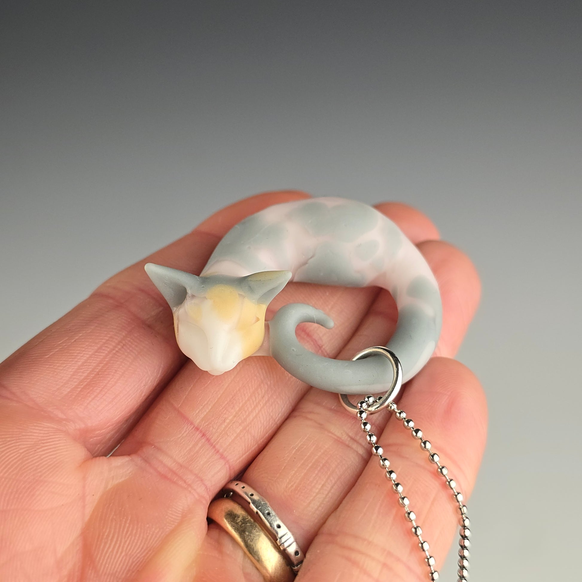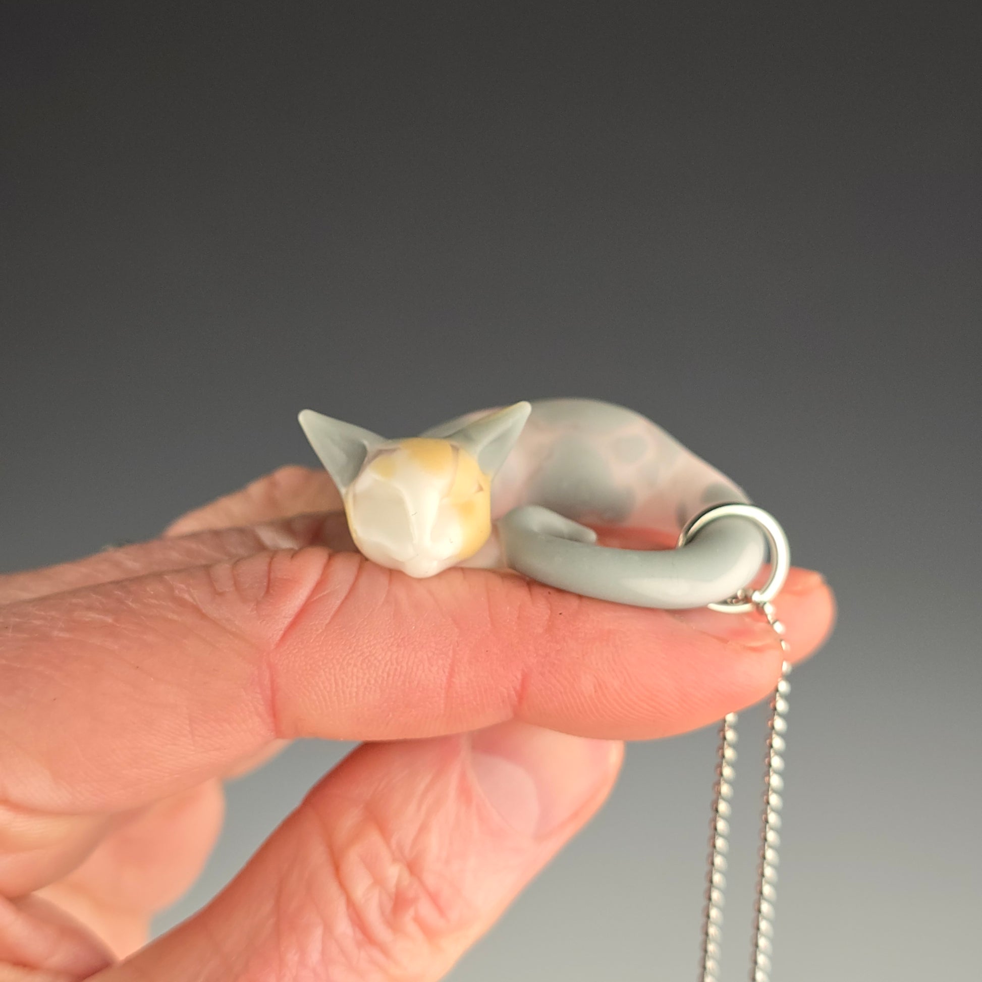 Your Sleeping Kitty will come in a faux fur lined "Kitty Bed" box with a ball chain & sticker. If you prefer a different colored ball chain than the one photographed, please let me know in the special instruction box at the bottom of the cart page before checkout. Available colors: black, bronze, silver, gold and white silver. I can also replace the ball chain with colored hemp string or suede if you have metal sensitivities. The Argentium jump rind can also be removed upon request.