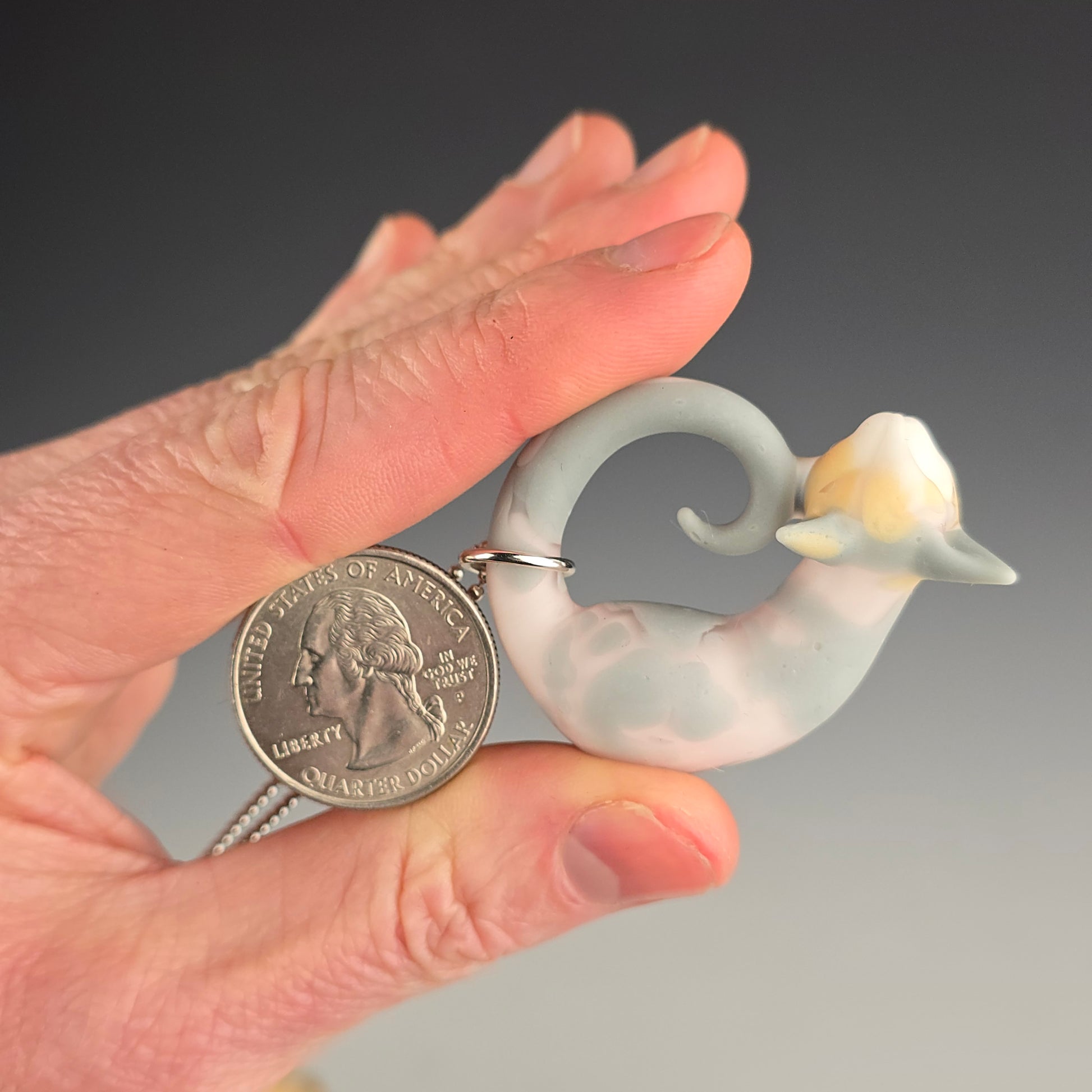 I forgot to take a photo of this kitty hanging on the chain, but will try to add one soon. Small sized pendant. This sleeping kitty is designed as a Calico Sphynx. This pendant has been sandblasted which gives it a matte appearance. It is then rubbed with mineral oil, to reduce the appearance of fingerprints. See photos for size reference. Pendant comes signed and dated with a titanium pen.