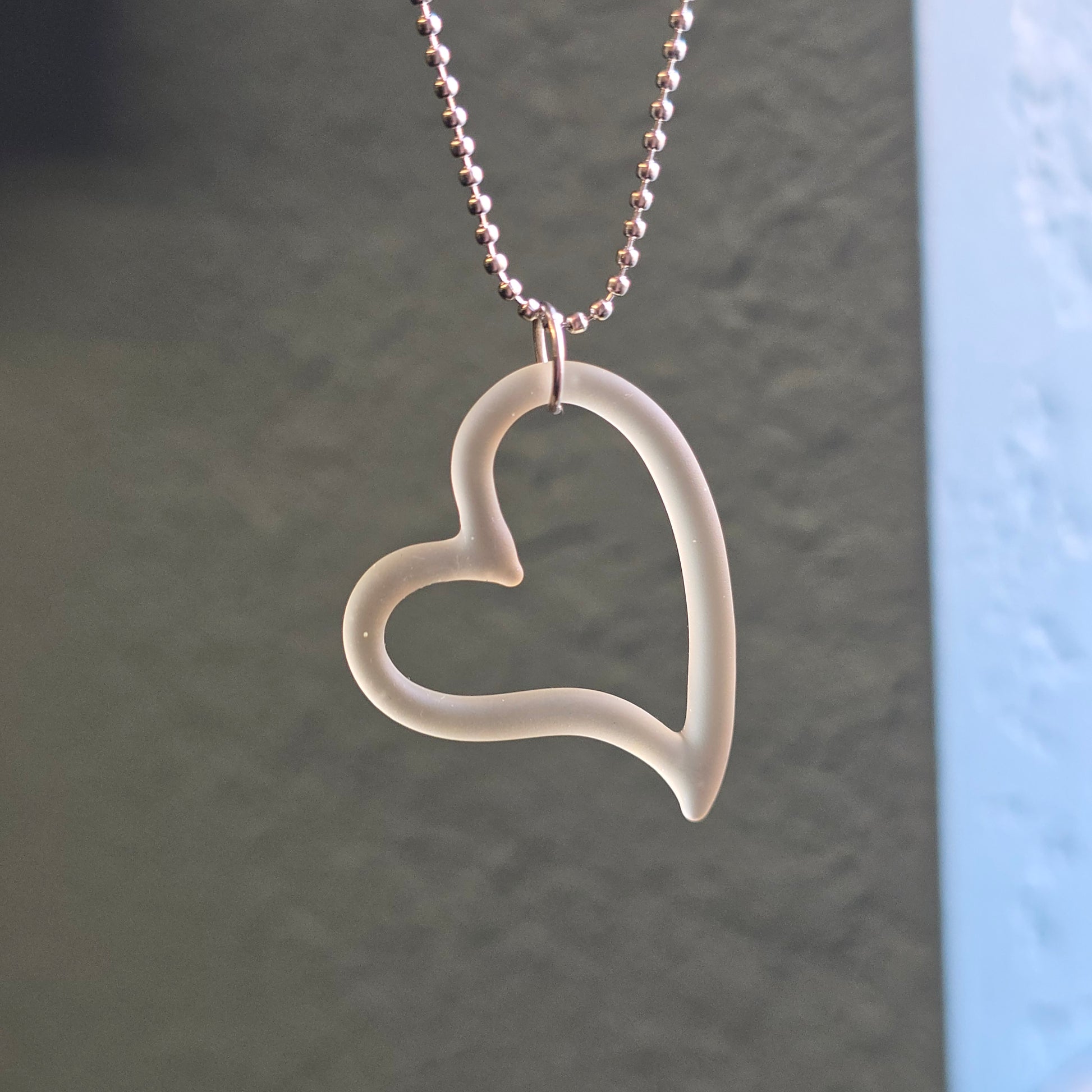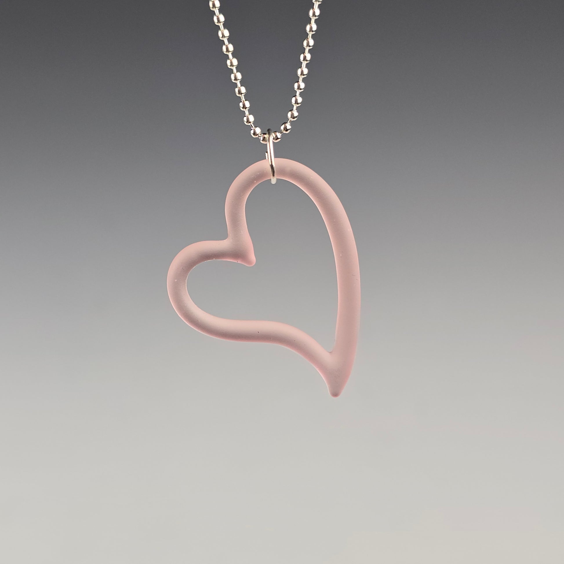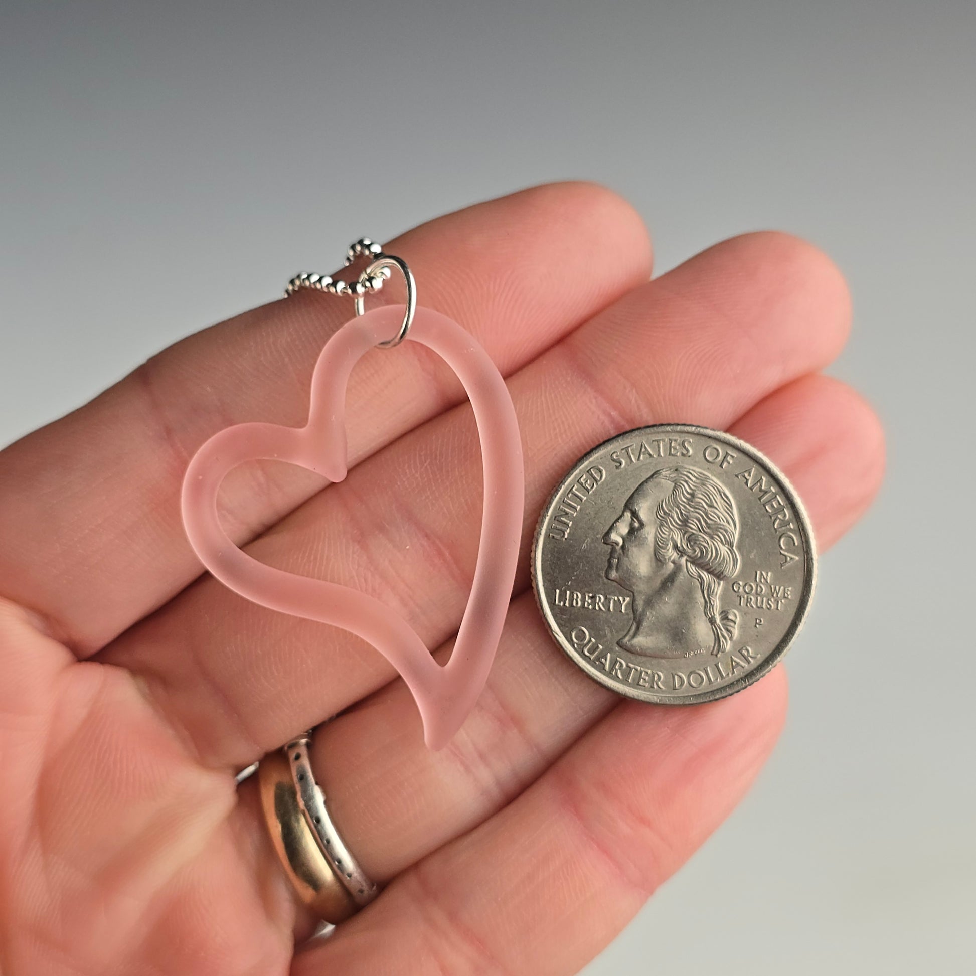 Made with CFL reactive Serum so this heart shifts from pink to champagne depending on the light source. This pendant has been sandblasted which gives it a matte appearance. It is then rubbed with mineral oil, to reduce the appearance of fingerprints. See photos for size reference.