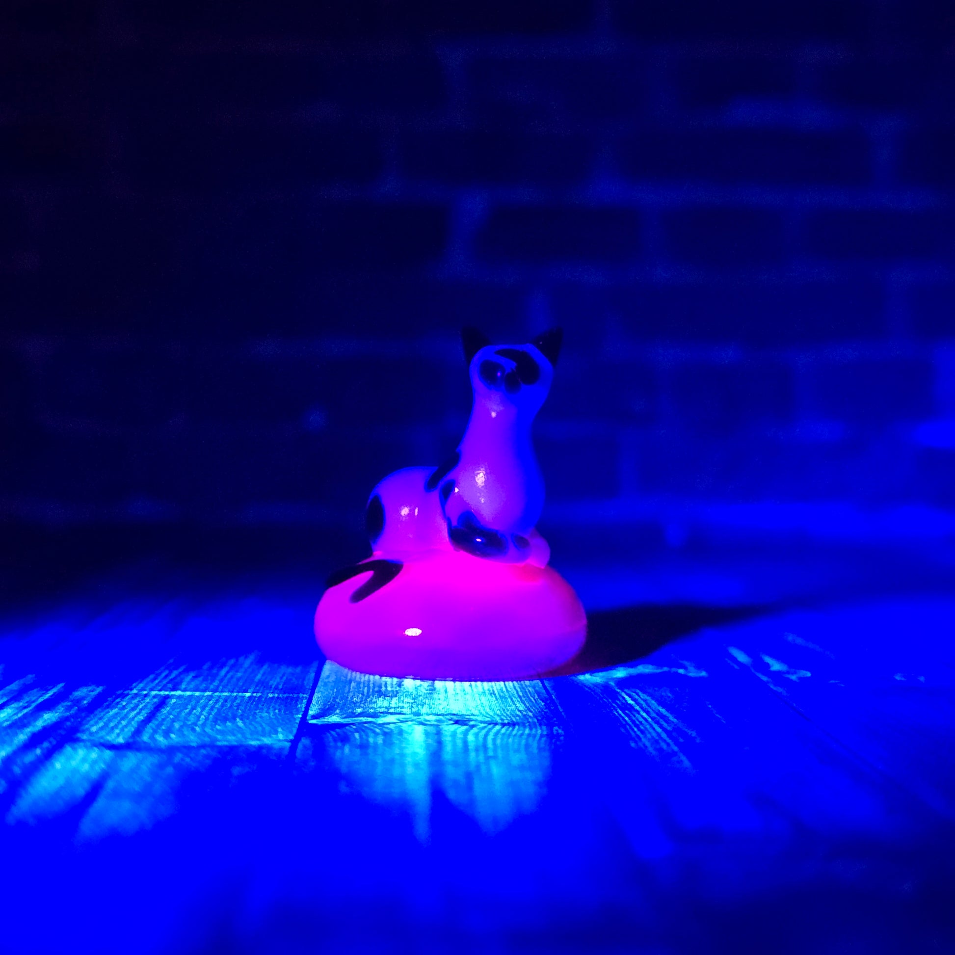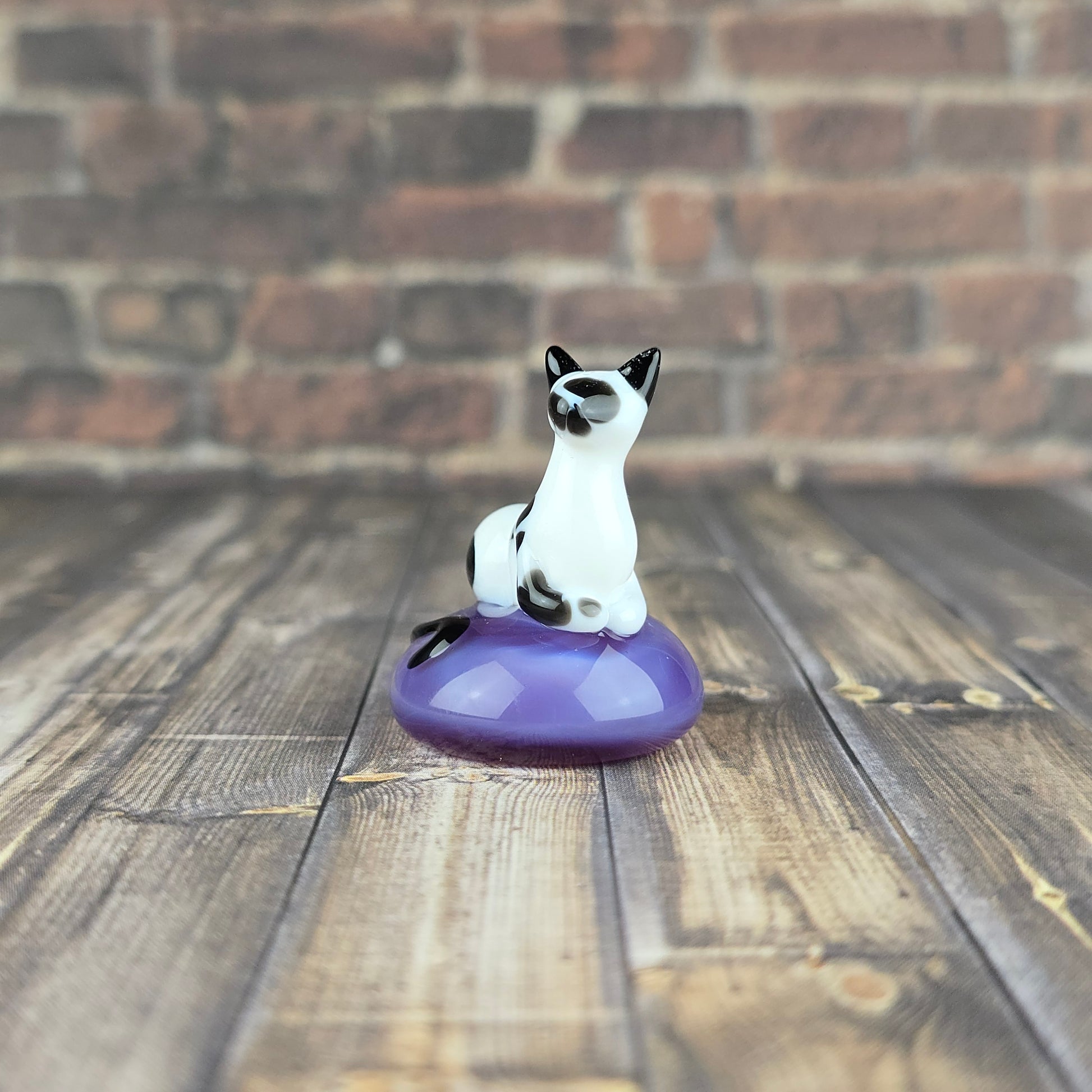 Black and White "Cow" Kitty loafing on a Purple Stargazer bed. See photos for size reference. Will come boxed with a sticker.