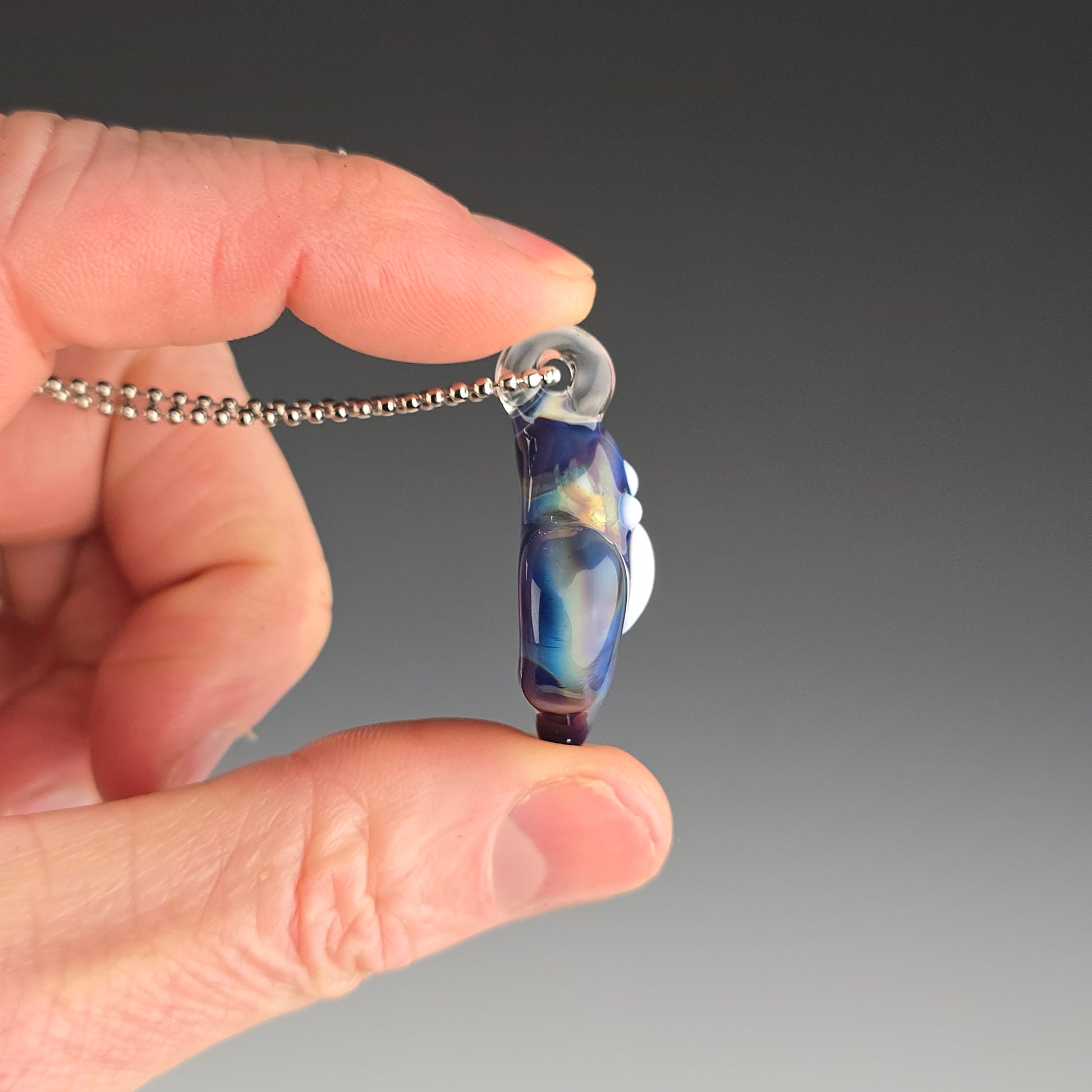 All pendants are individually handcrafted from COE 33 borosilicate glass—no molds are used. Each piece is shaped by hand using graphite tools and then kiln-annealed at 1050°F to ensure strength and durability.