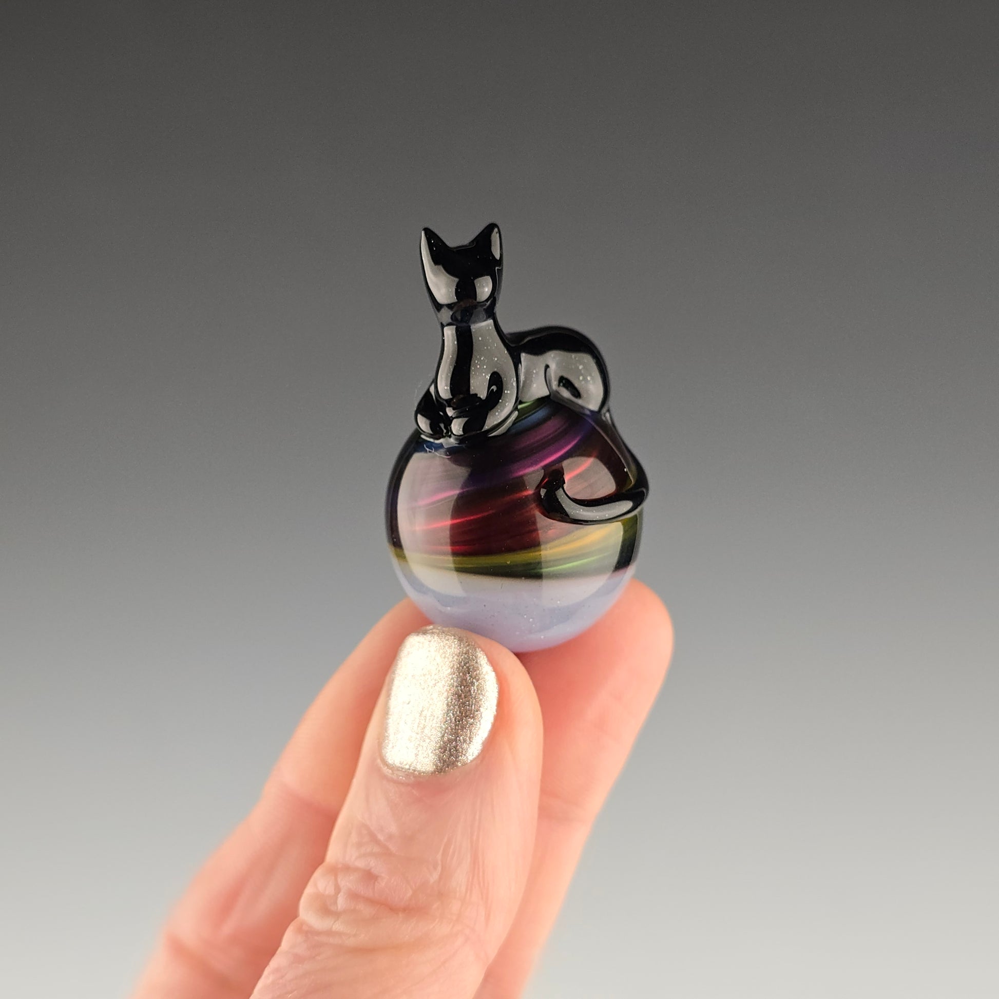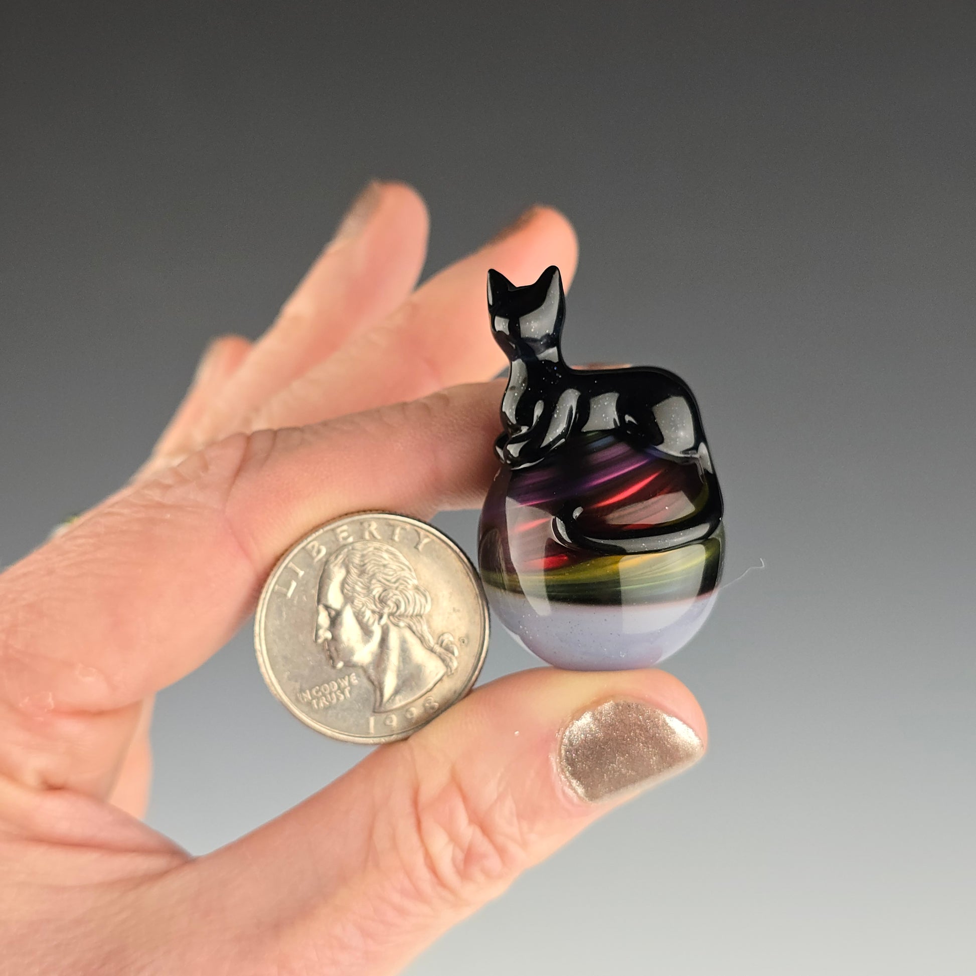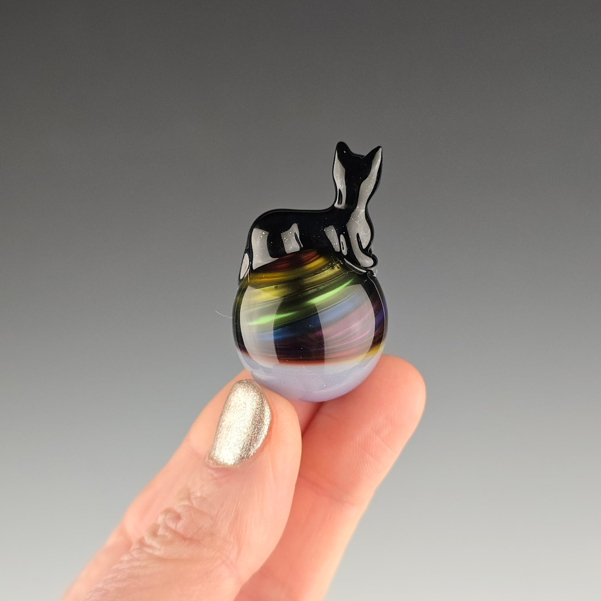 This 25mm Meowble is made with my Metallic Rainbow prep & a section of sparkly pale purple. The loaf is made with Galaxy Black so there is a slight shimmer to it. Comes boxed with a sticker & rubber grommet to use as a marble stand.