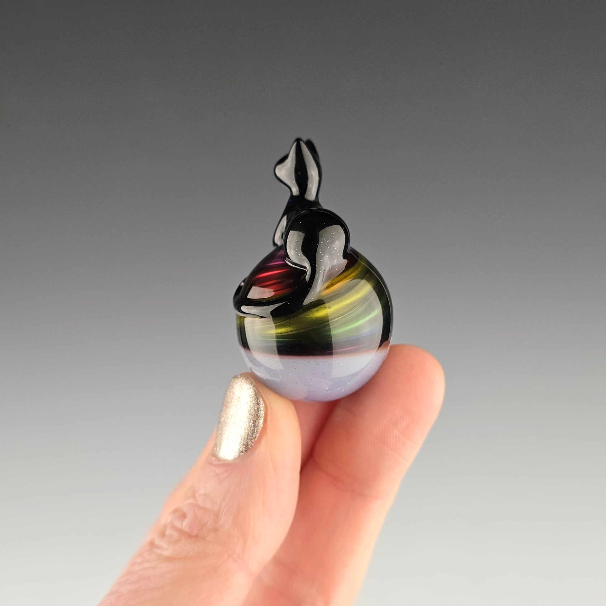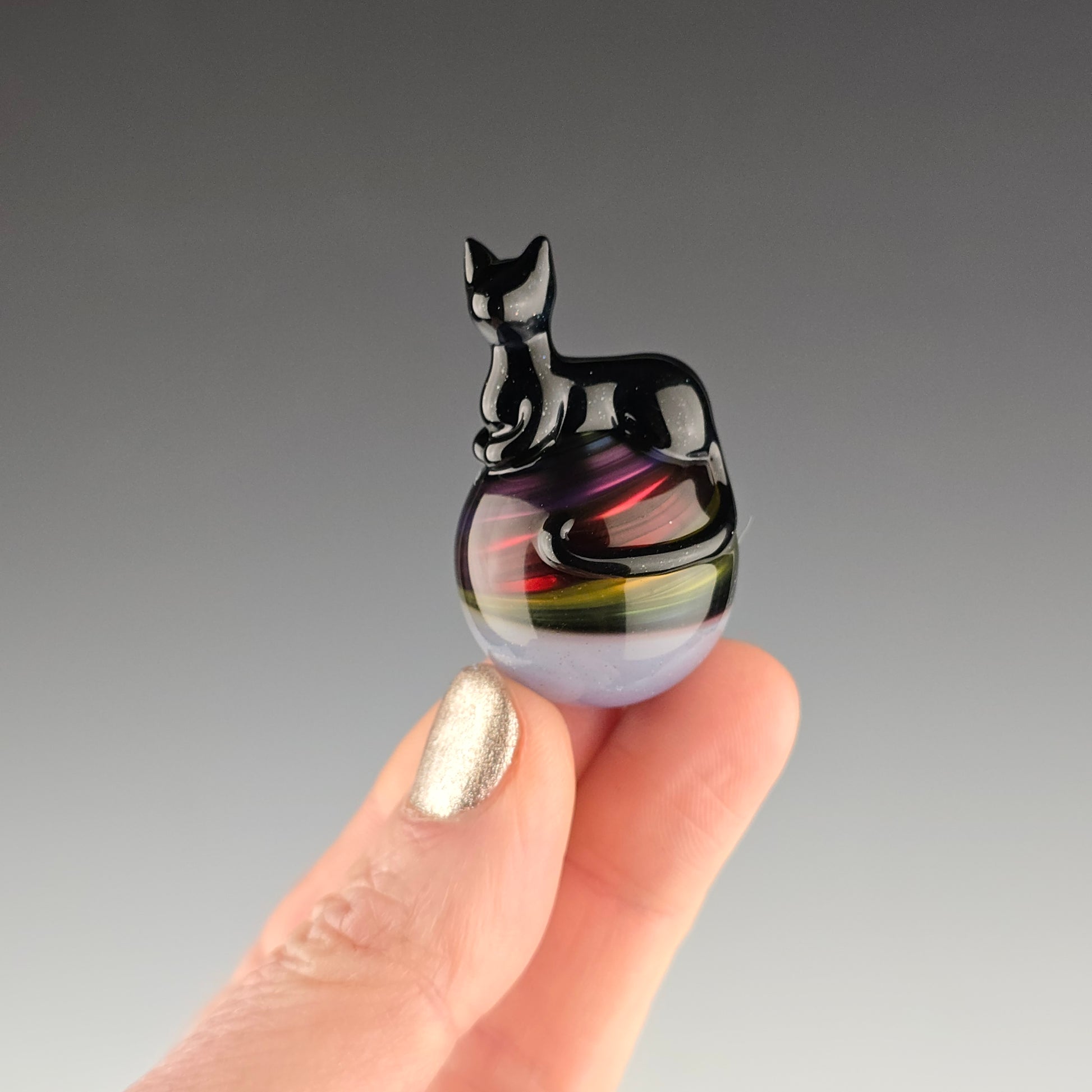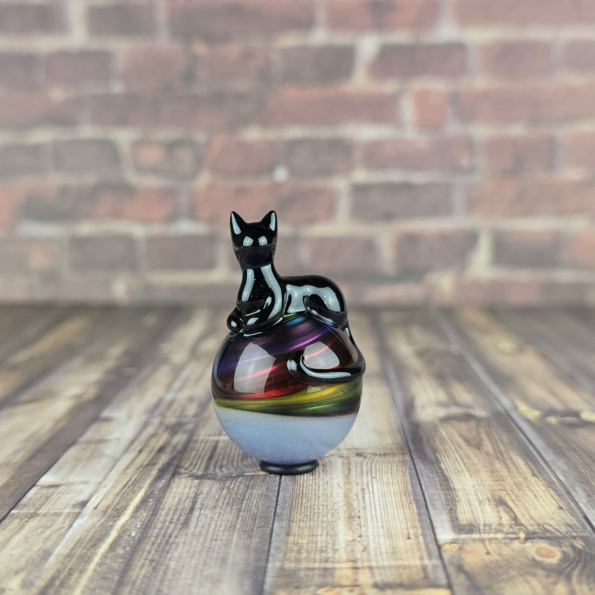 This 25mm Meowble is made with my Metallic Rainbow prep & a section of sparkly pale purple. The loaf is made with Galaxy Black so there is a slight shimmer to it. Comes boxed with a sticker & rubber grommet to use as a marble stand.