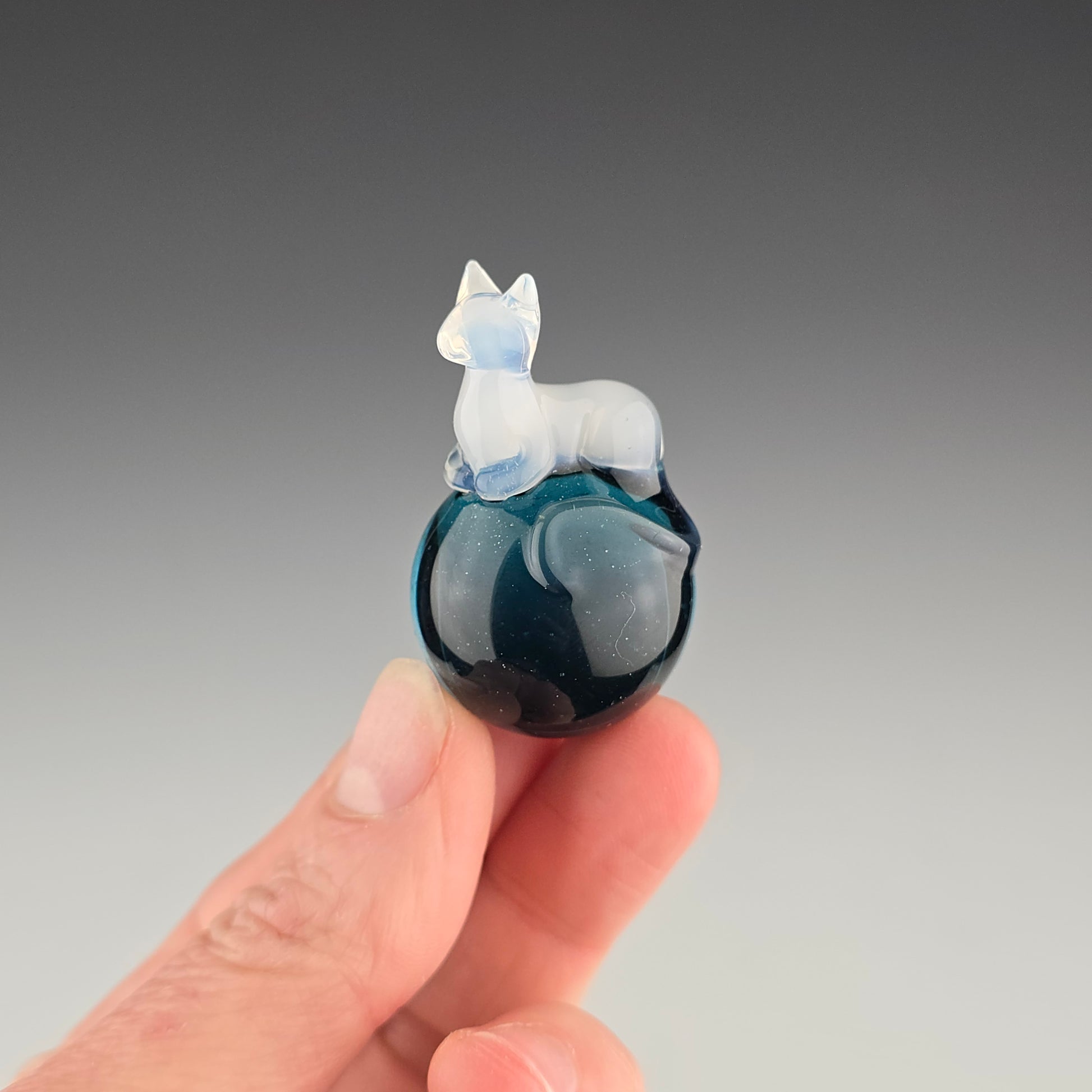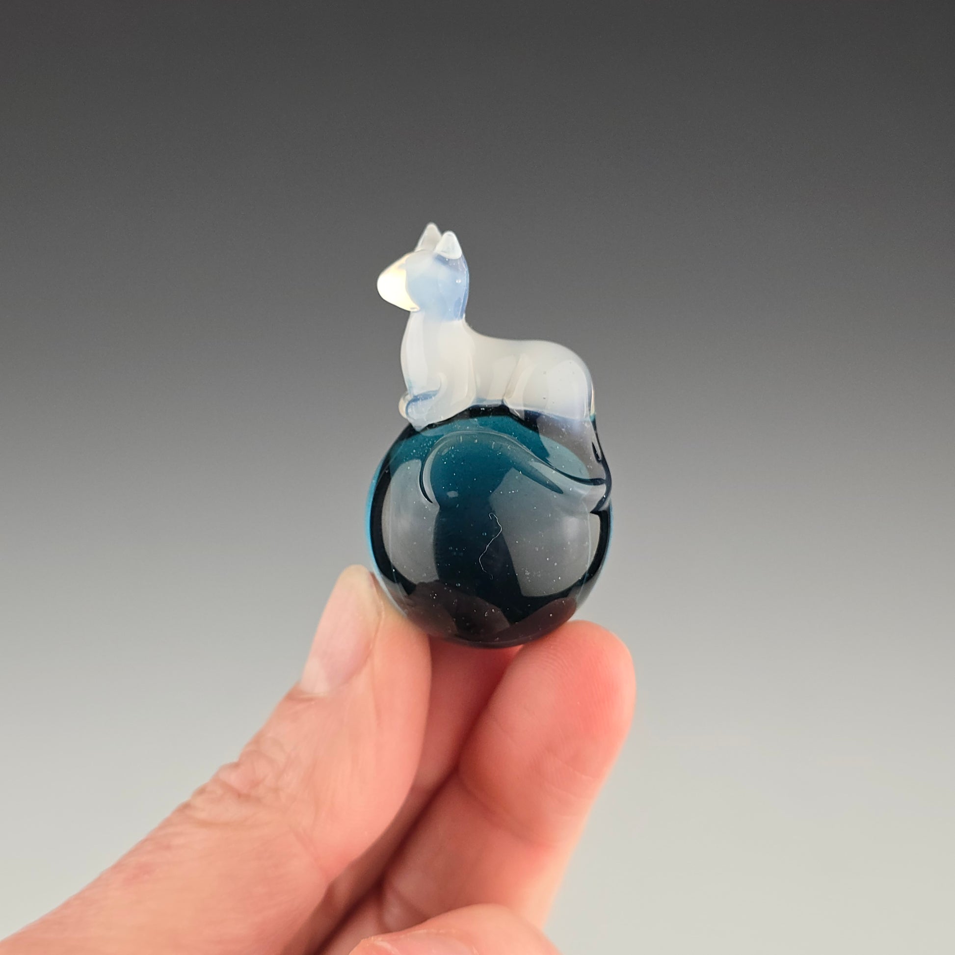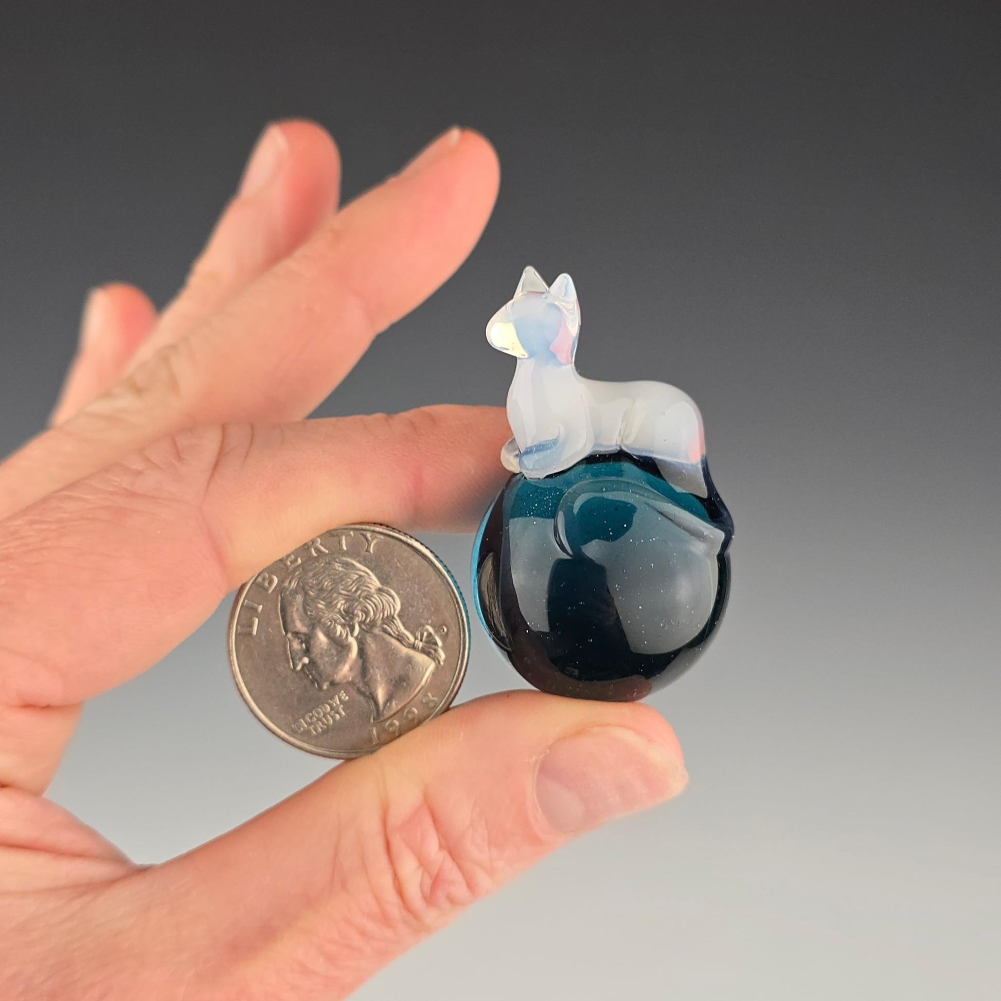 This 25.8mm Meowble is made with Blue Stardust and has a UV reactive Glowstick loaf. This kitty glows pink under UV lighting. Comes boxed with a sticker & rubber grommet to use as a marble stand.