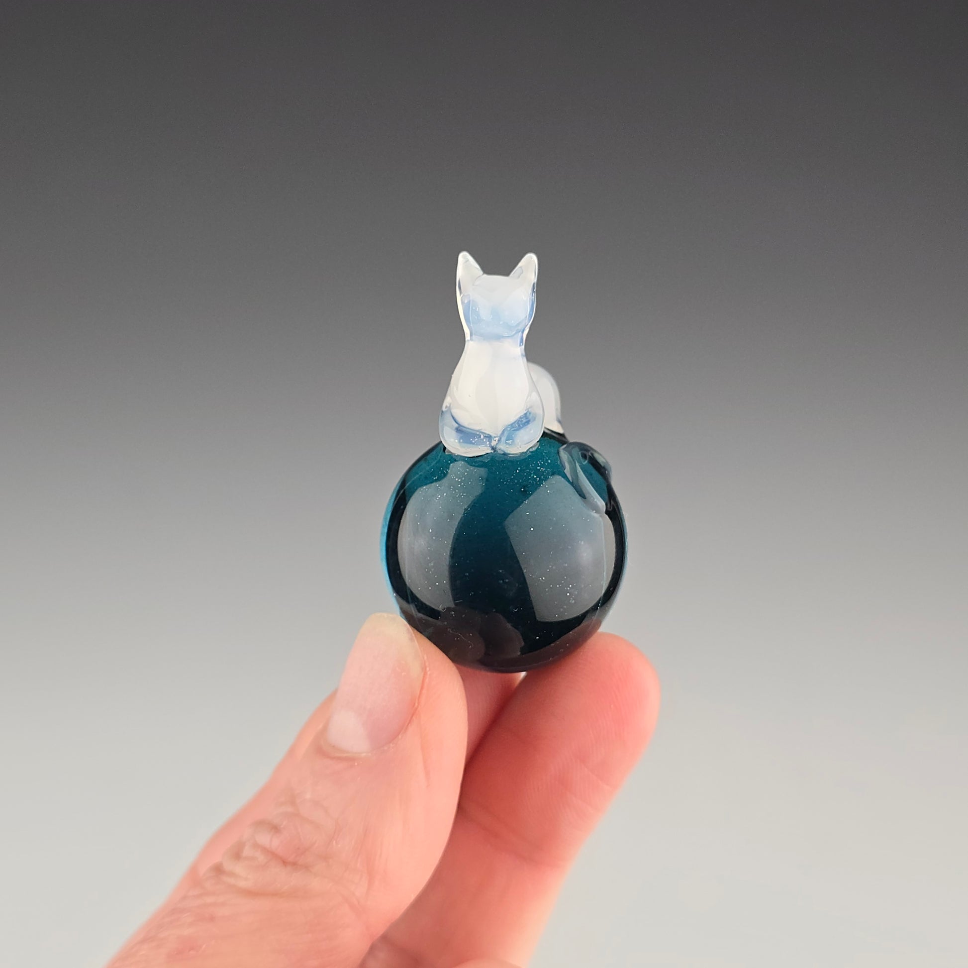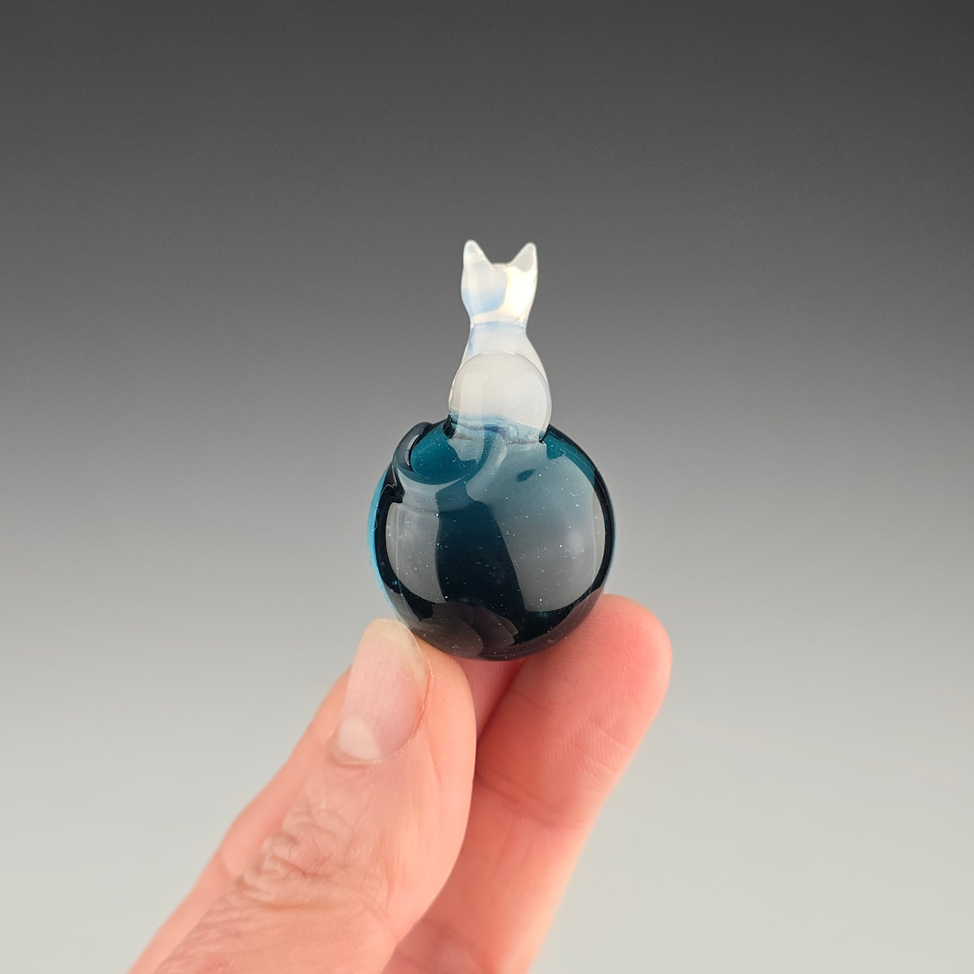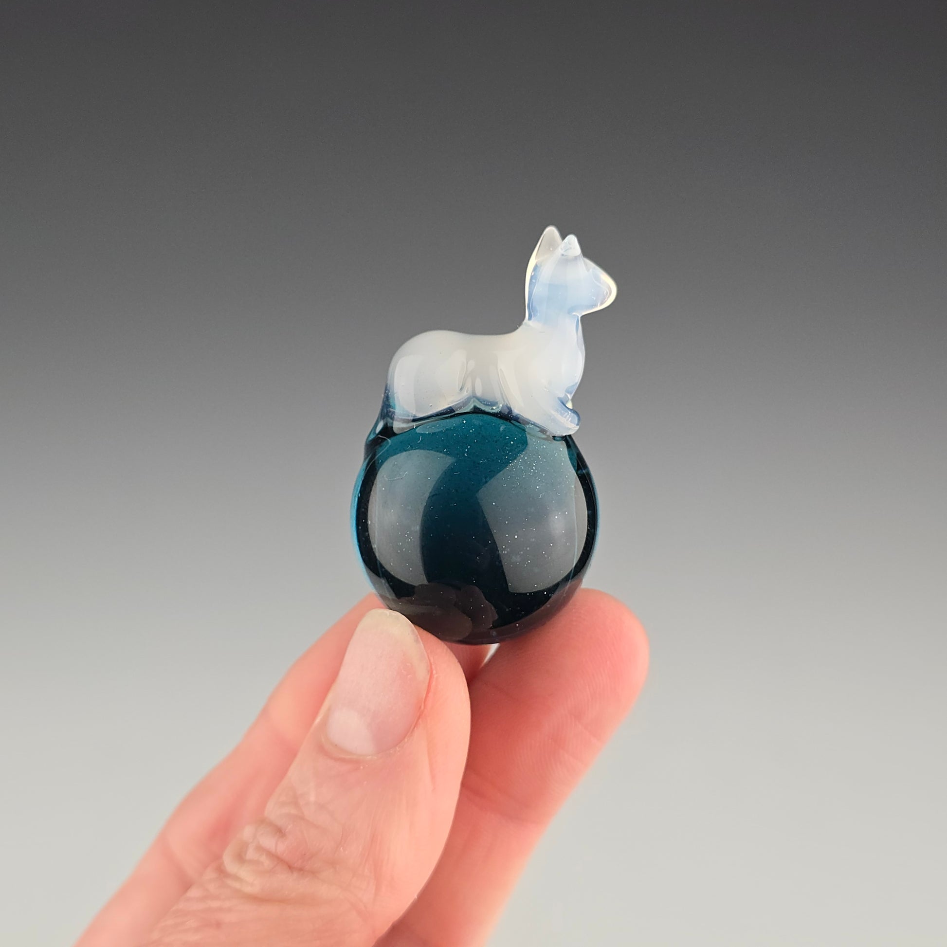 This 25.8mm Meowble is made with Blue Stardust and has a UV reactive Glowstick loaf. This kitty glows pink under UV lighting. Comes boxed with a sticker & rubber grommet to use as a marble stand.