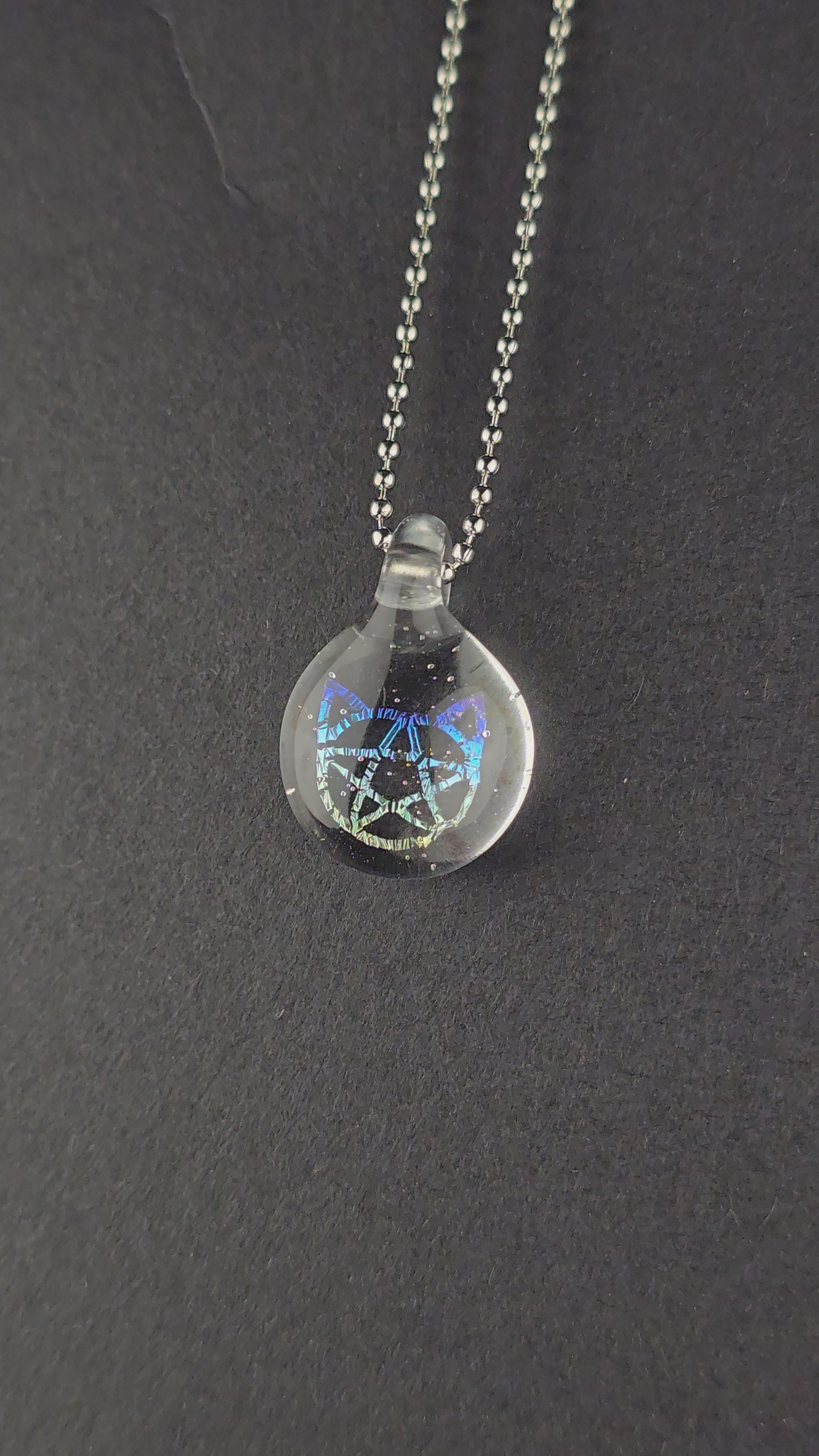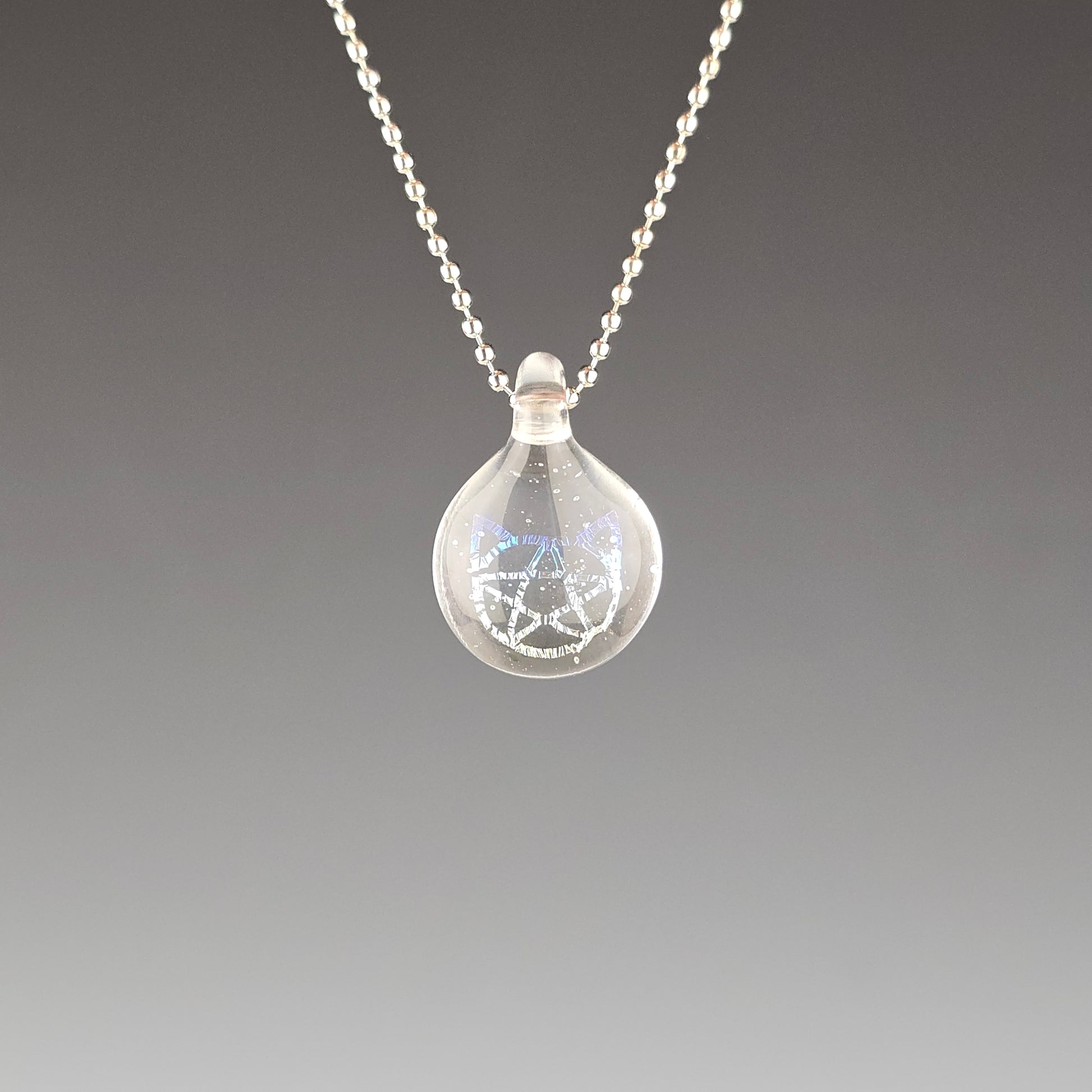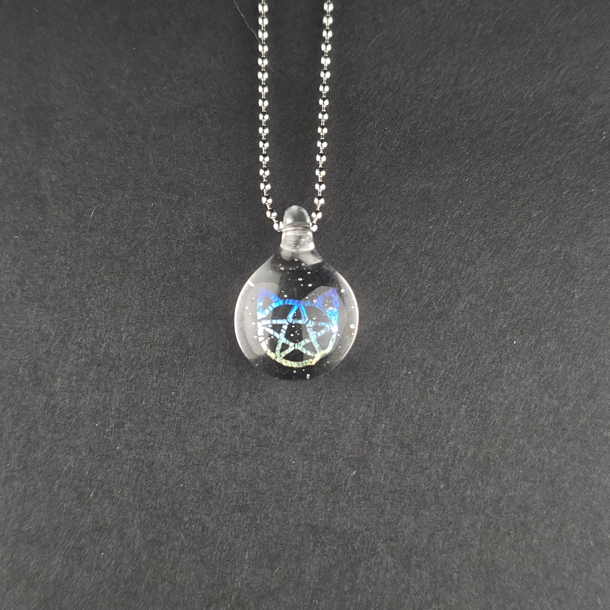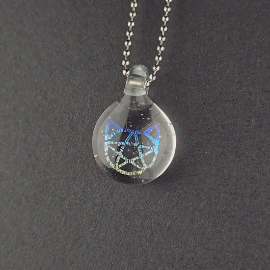 Rainbow Dichro Kitty Face Pentacle. Made with clear & UV reactive Lucy, which glows pink under UV light (blacklight). See photos for size reference.