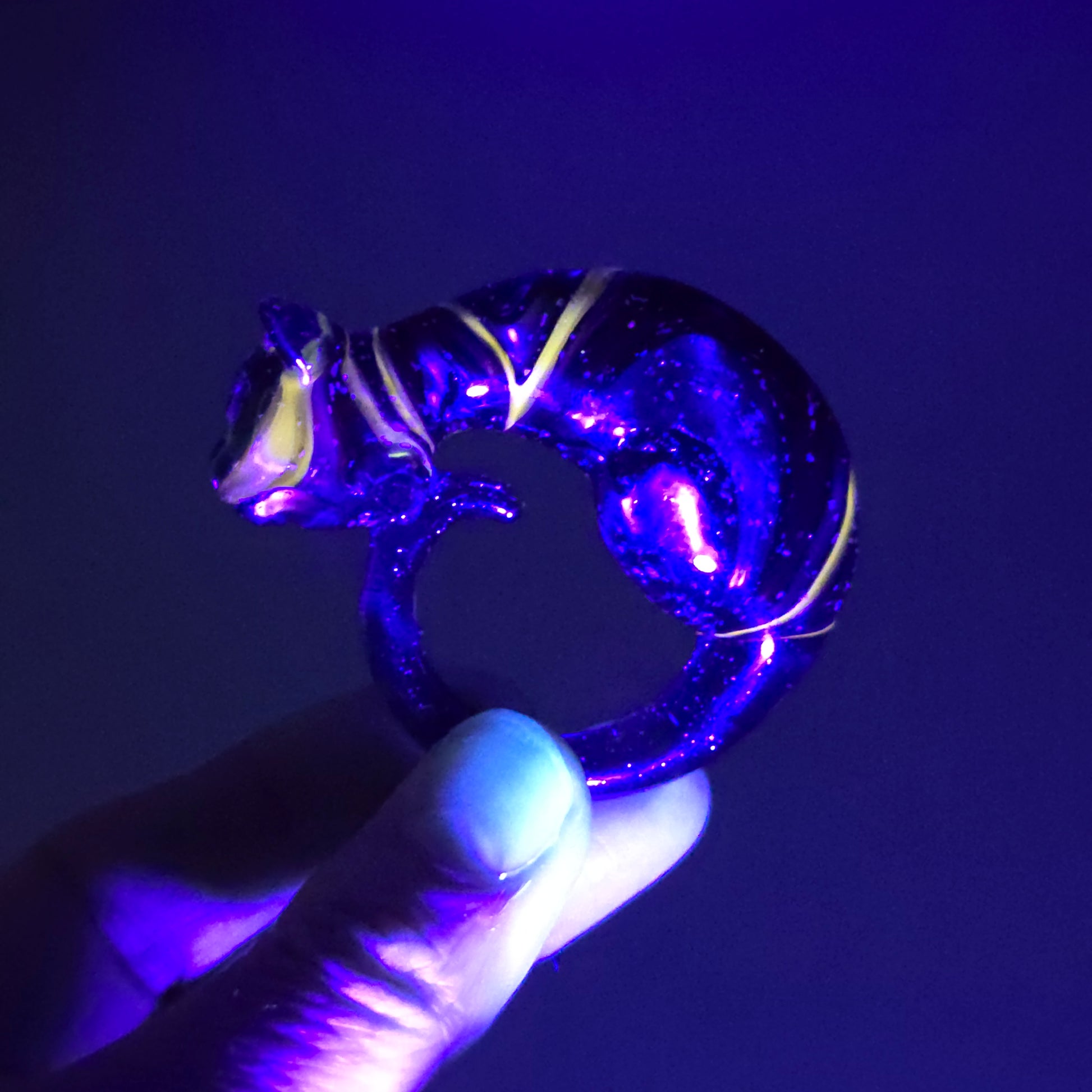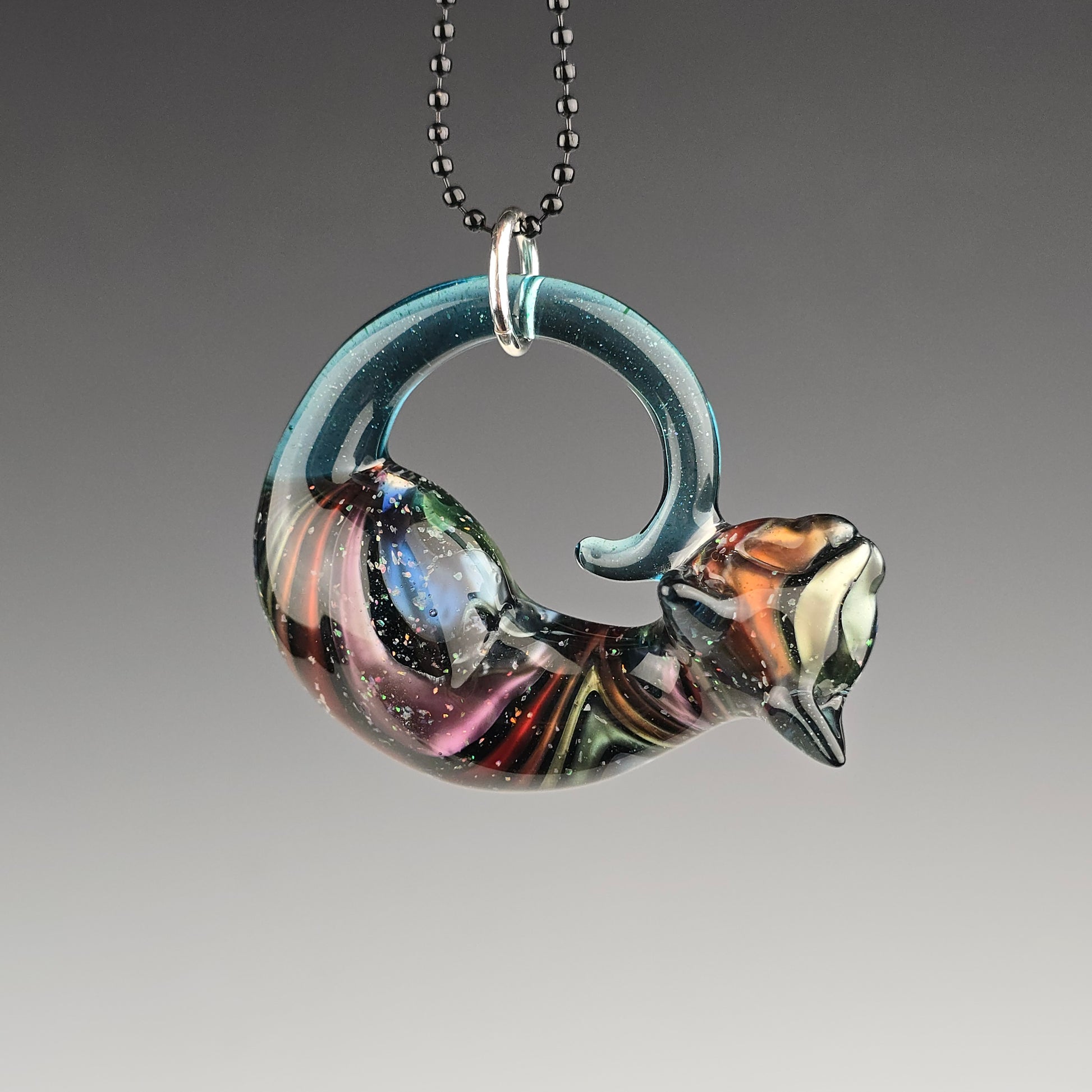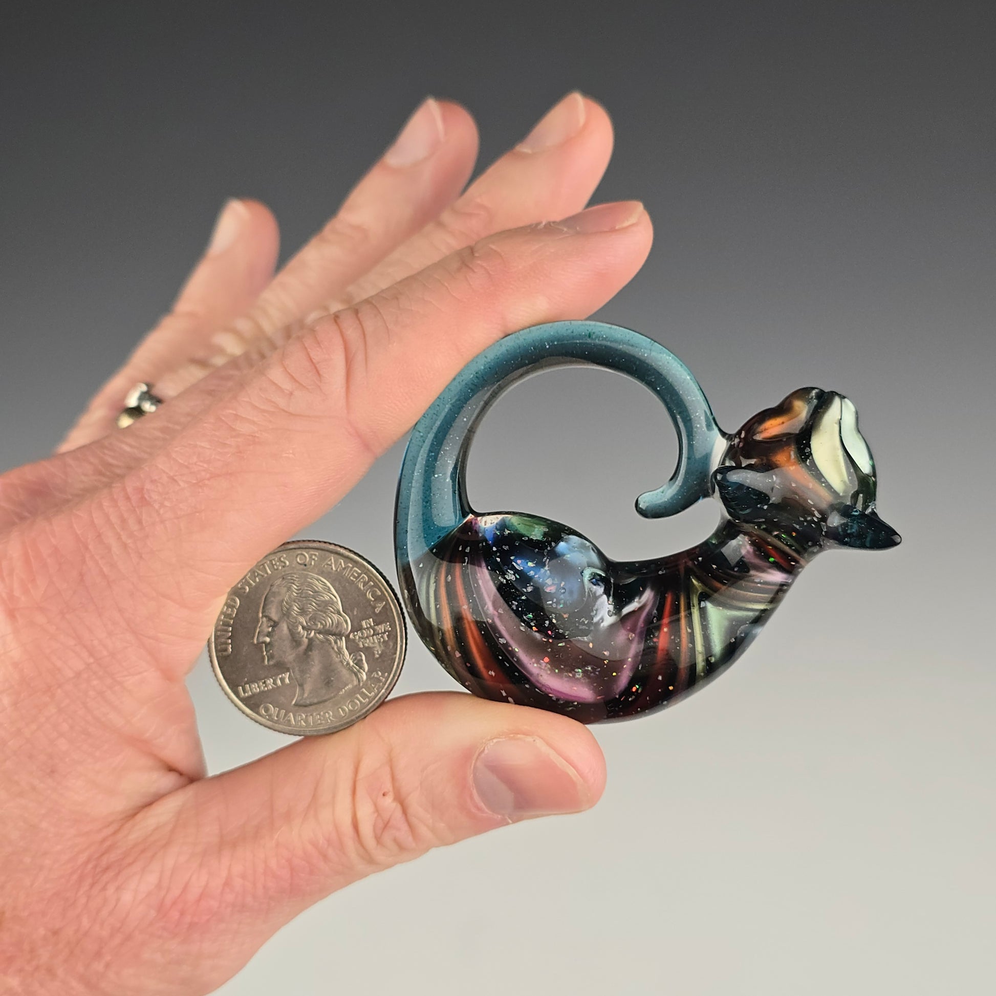 This kitty is bigger than my large sized pendant, so I am classifying it as a MEGA! Metallic Rainbow over Blue Stardust and coated with crushed opal. The yellow glows under UV. Tail and ears are Blue Stardust. This is a very large kitty! 2¼" wide x 1⅞" tall and weighs 1.14 ounces. See photos for size reference. Pendant comes signed and dated with a titanium pen.