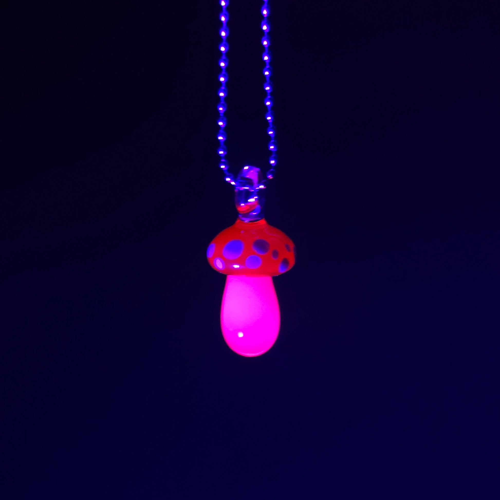 Orange glass mushroom pendant made with UV reactive orange and Glowstick (glows pink under black light). See photos for size reference.