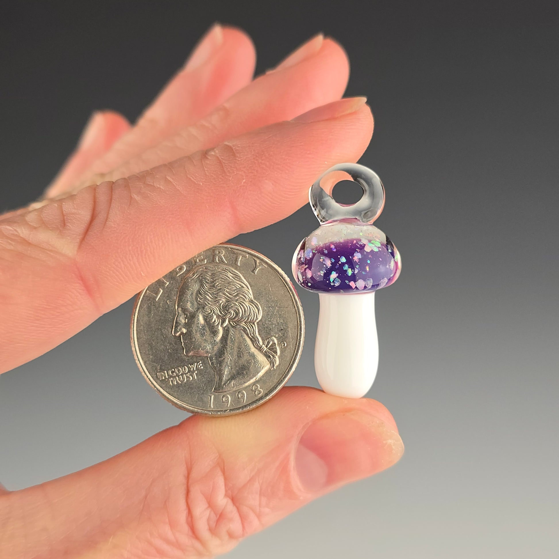 Glass mushroom pendant made with Royal Jelly and crushed opals in clear. See photos for size reference.