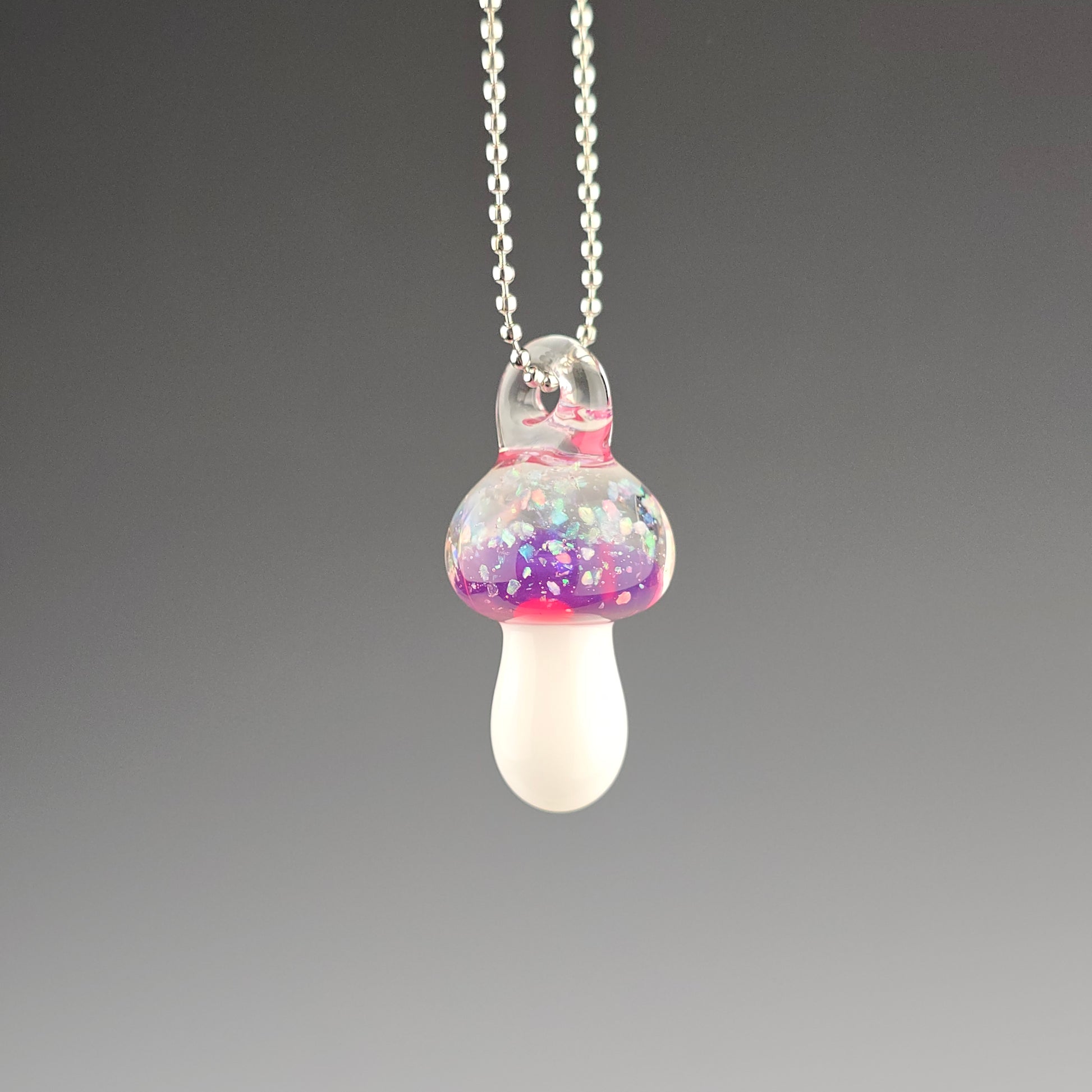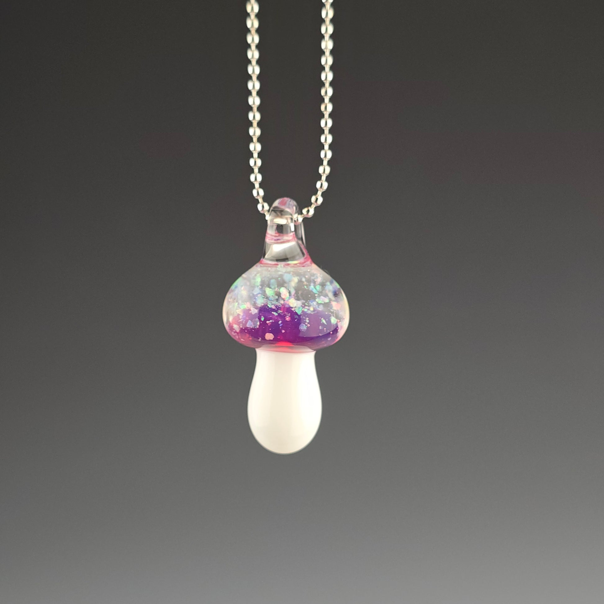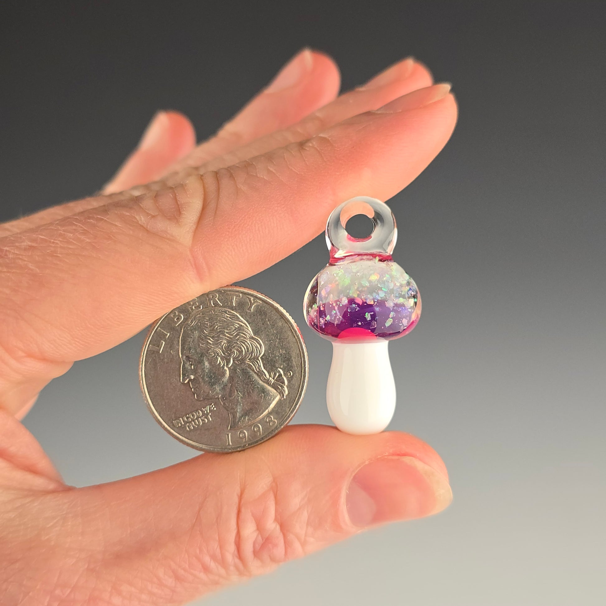 Glass mushroom pendant made with a Tela Magenta and crushed opals in clear. See photos for size reference.