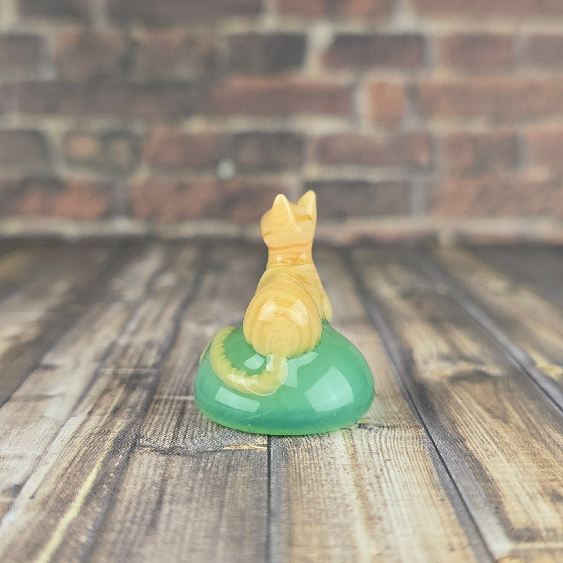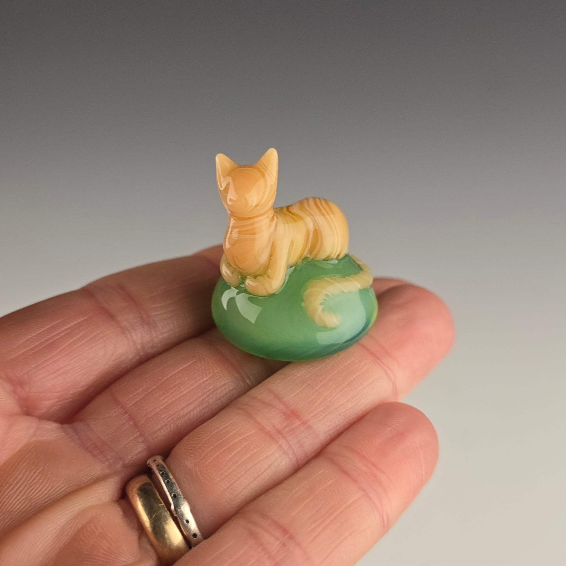 Orange Tabbty Kitty loafing on a Jade Green bed. See photos for size reference. Will come boxed with a sticker.