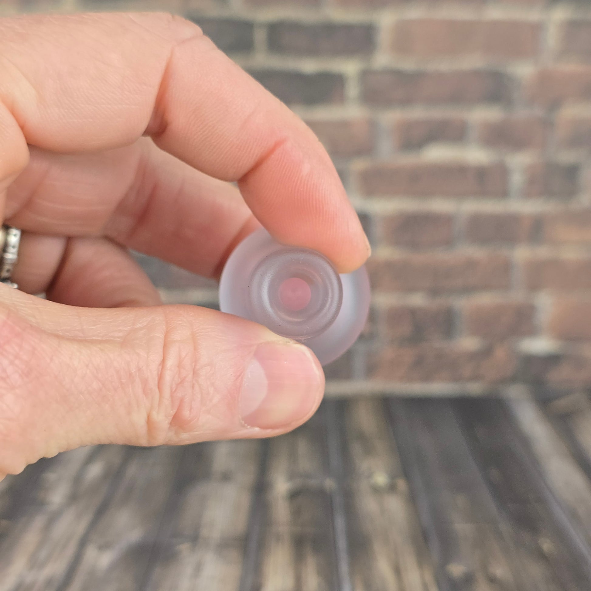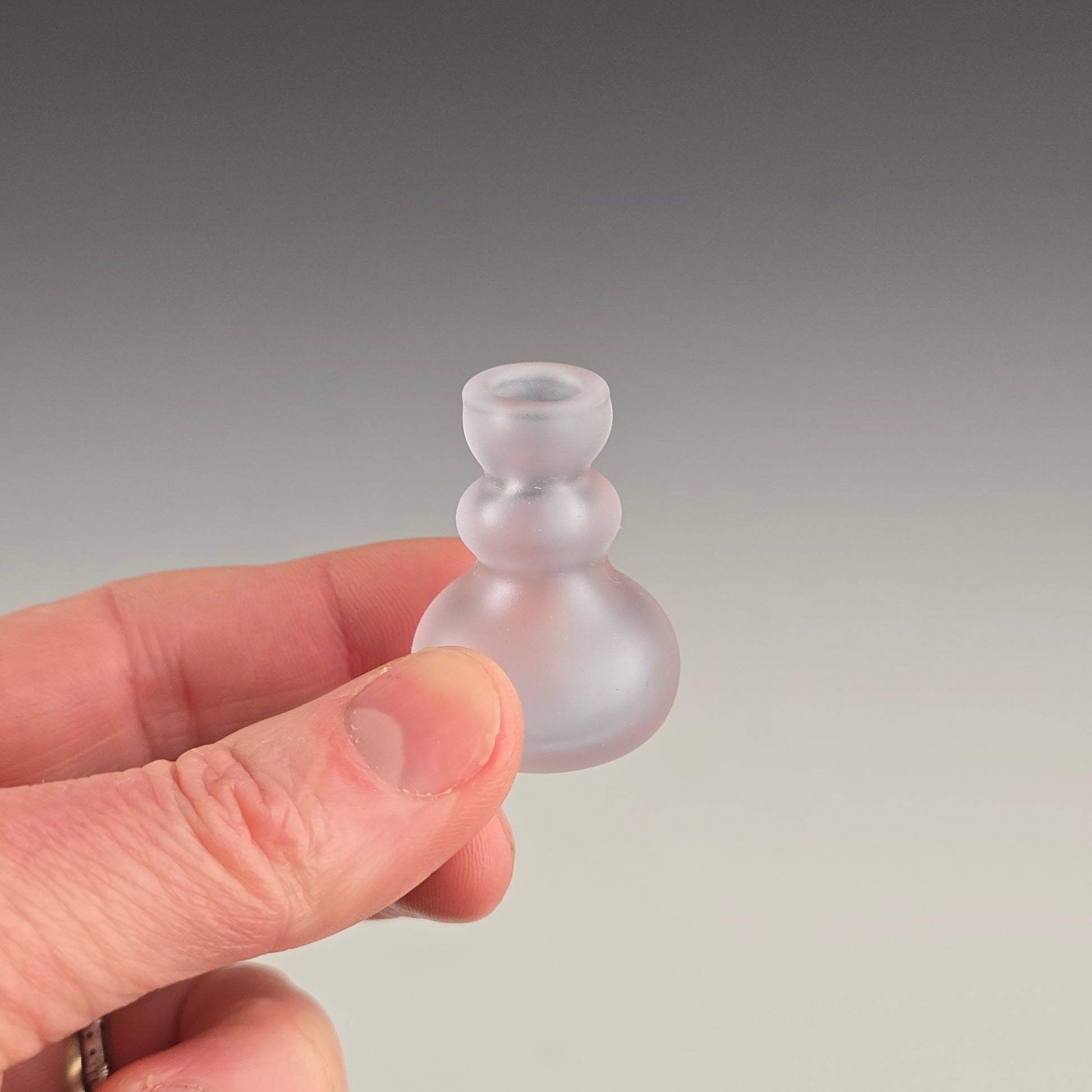 Whether you use it to store found whiskers, a feather, or a tiny flower, this adorable miniature vase will surely add charm to your trinket shelf. This vase has been sandblasted (and rubbed with mineral oil to reduce the appearance of finger prints) which gives it a frosted look.