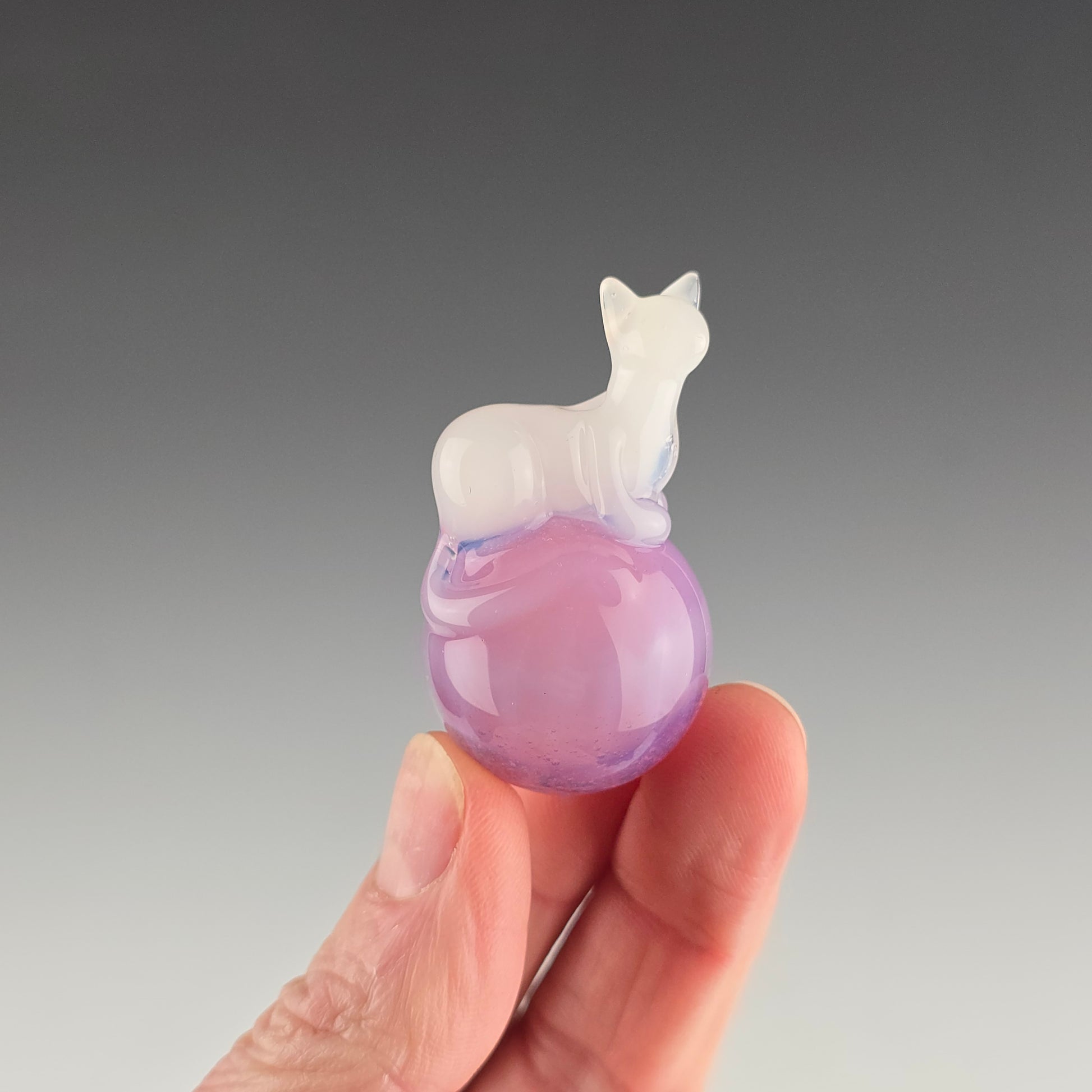 This 25mm Meowble is made with Blue Stardust over Pink Slyme. The Loaf is made with UV reactive Glowstick, so it glows pink under UV lighting. Comes boxed with a sticker & rubber grommet to use as a marble stand.