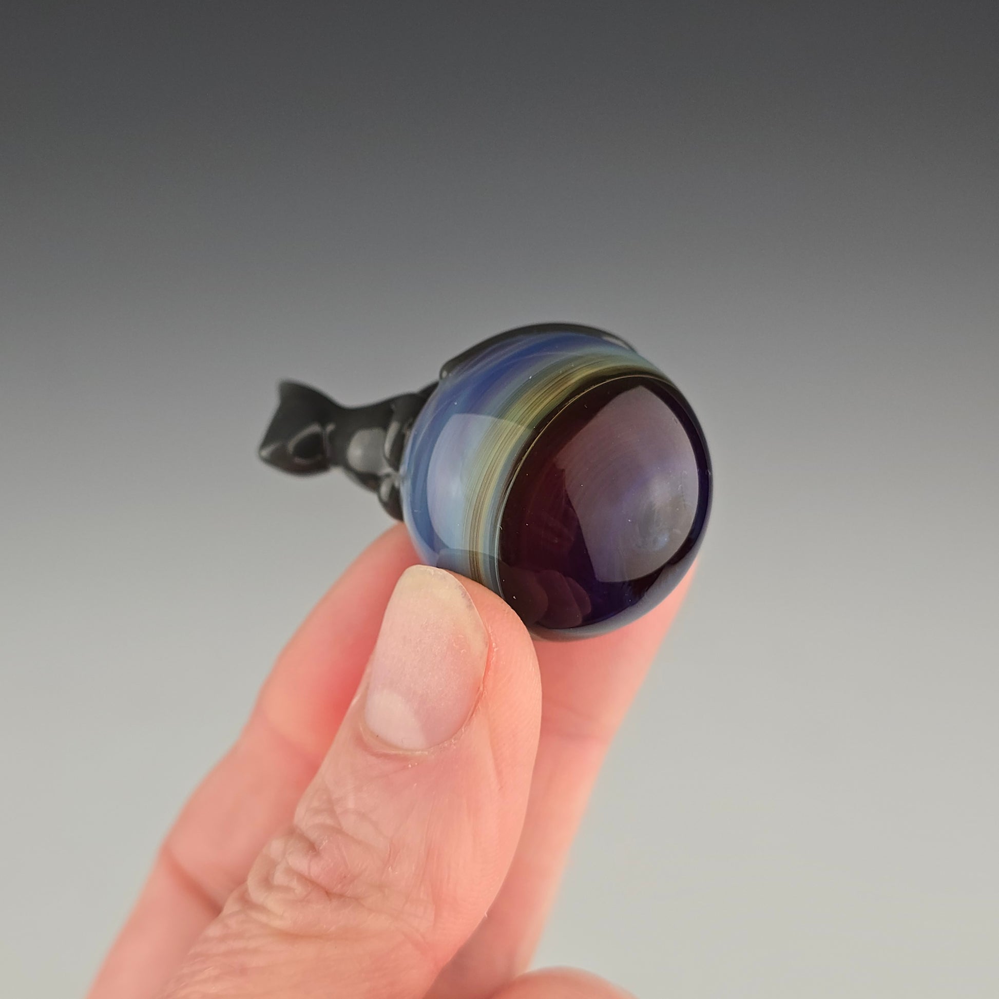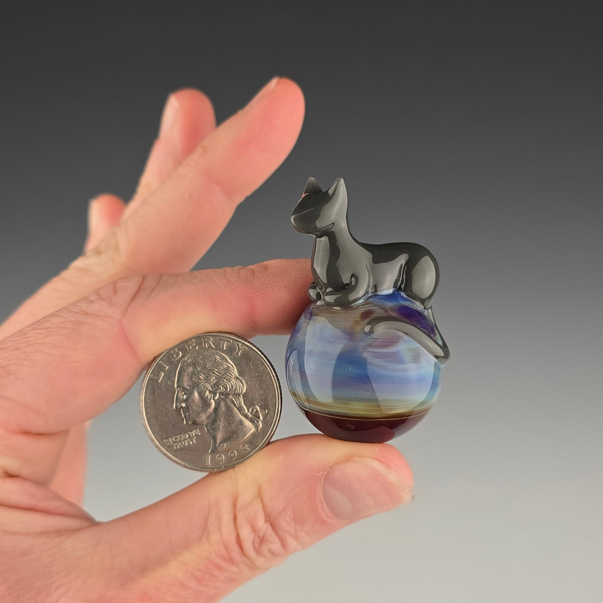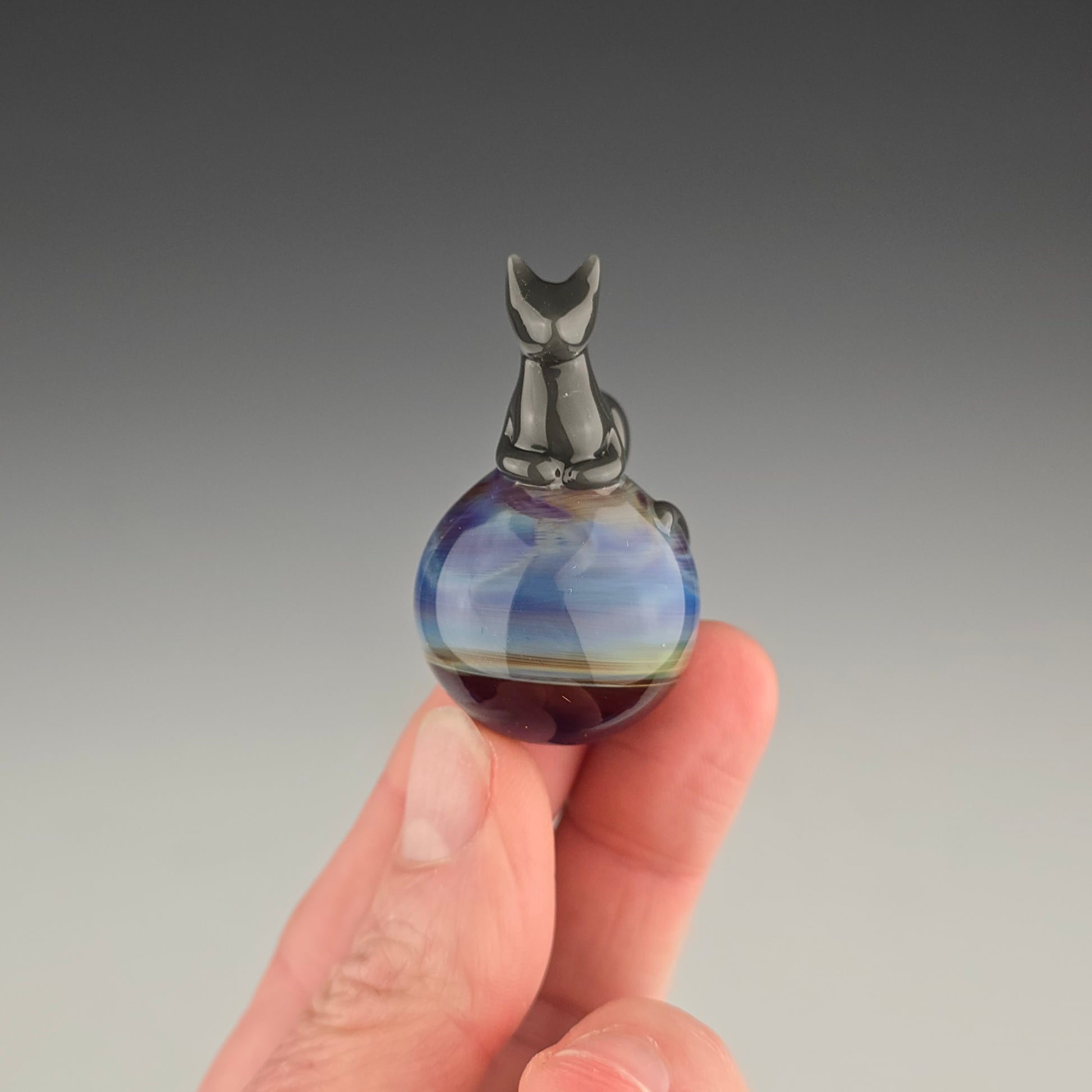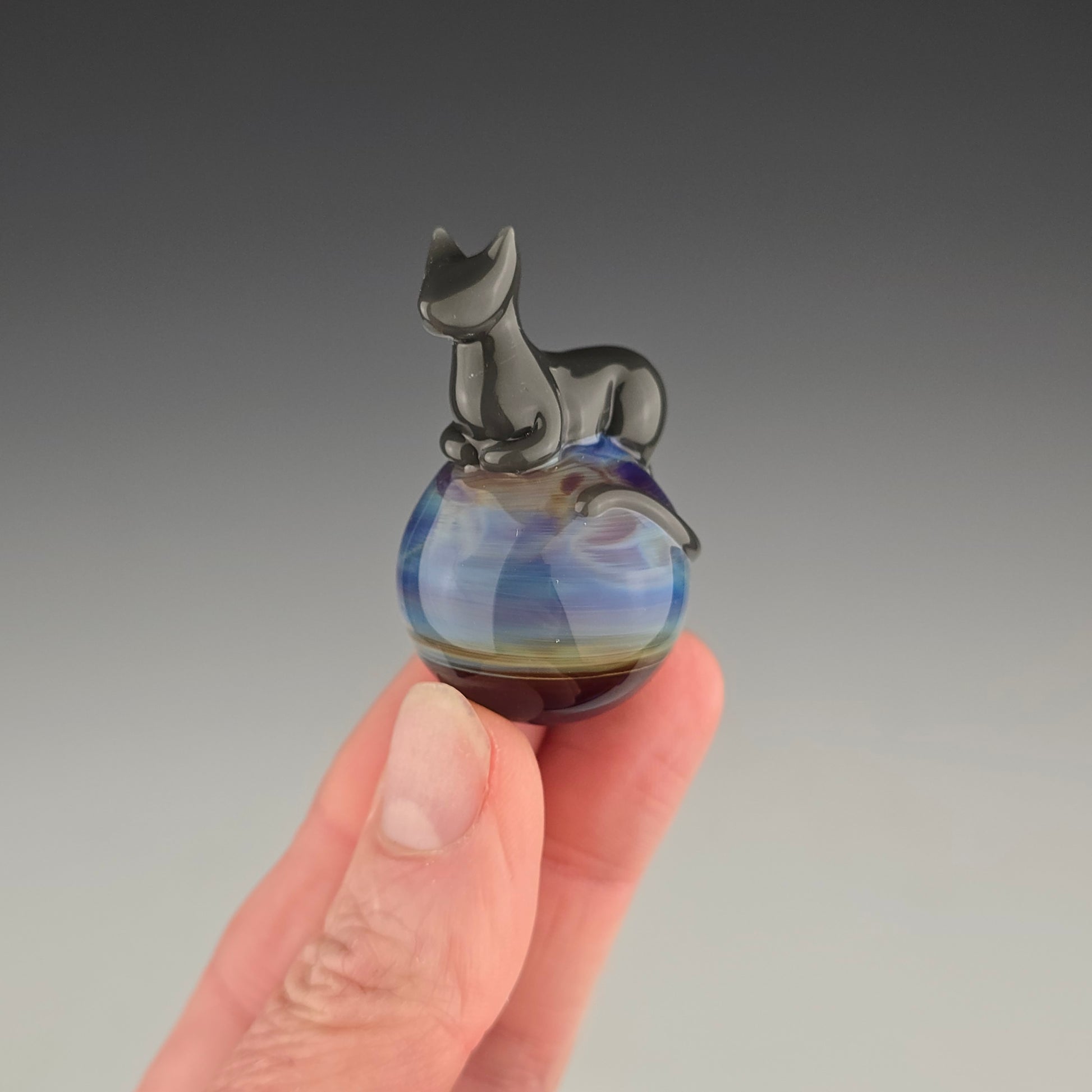 This 26.5mm Meowble is made with a color called Lokis Lipstick which swirls purples, blues, tans and a deep red. The Kitty loaf is a dark gray similar to a Russian Blue. Comes boxed with a sticker & rubber grommet to use as a marble stand.