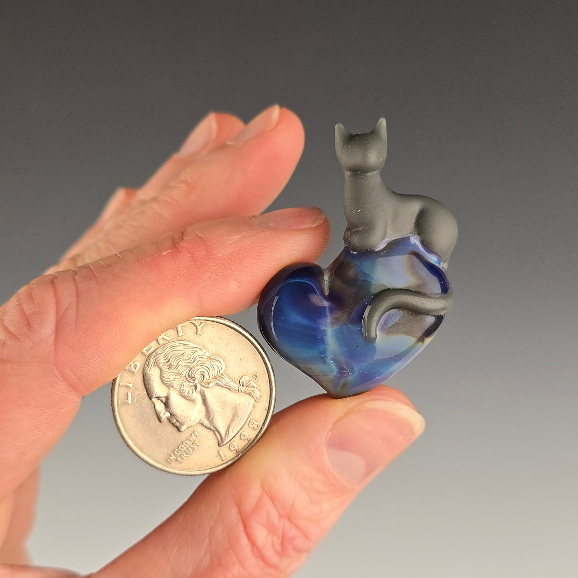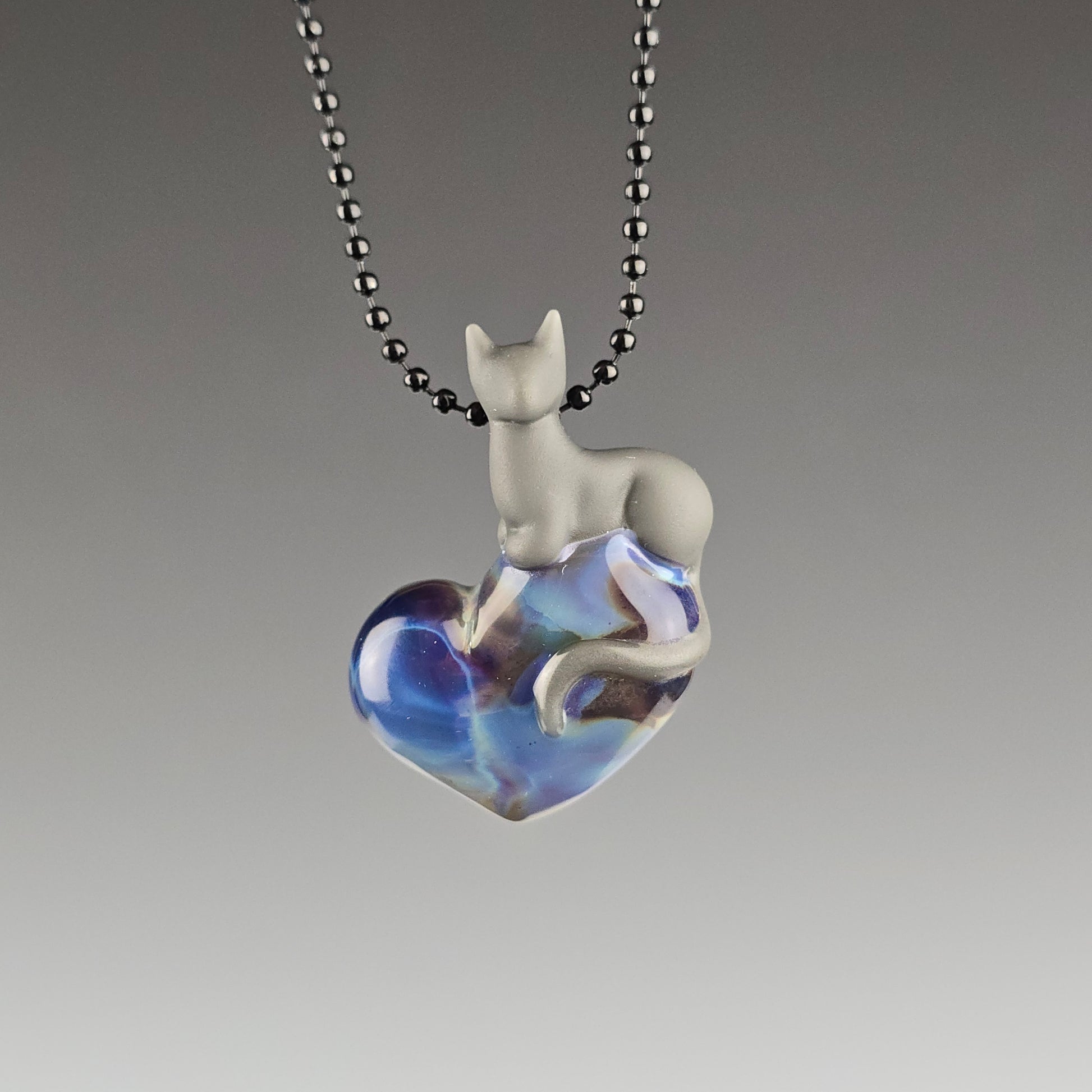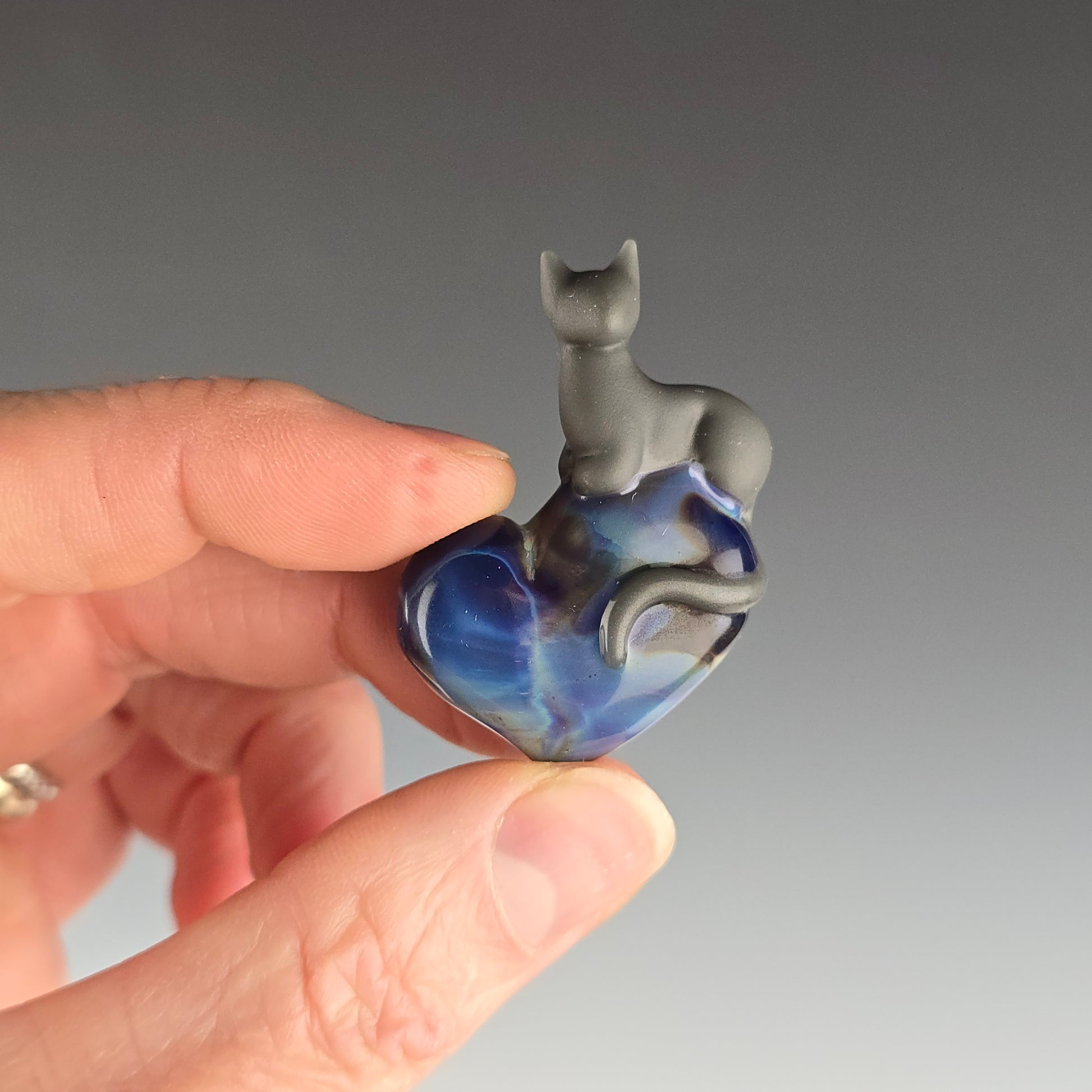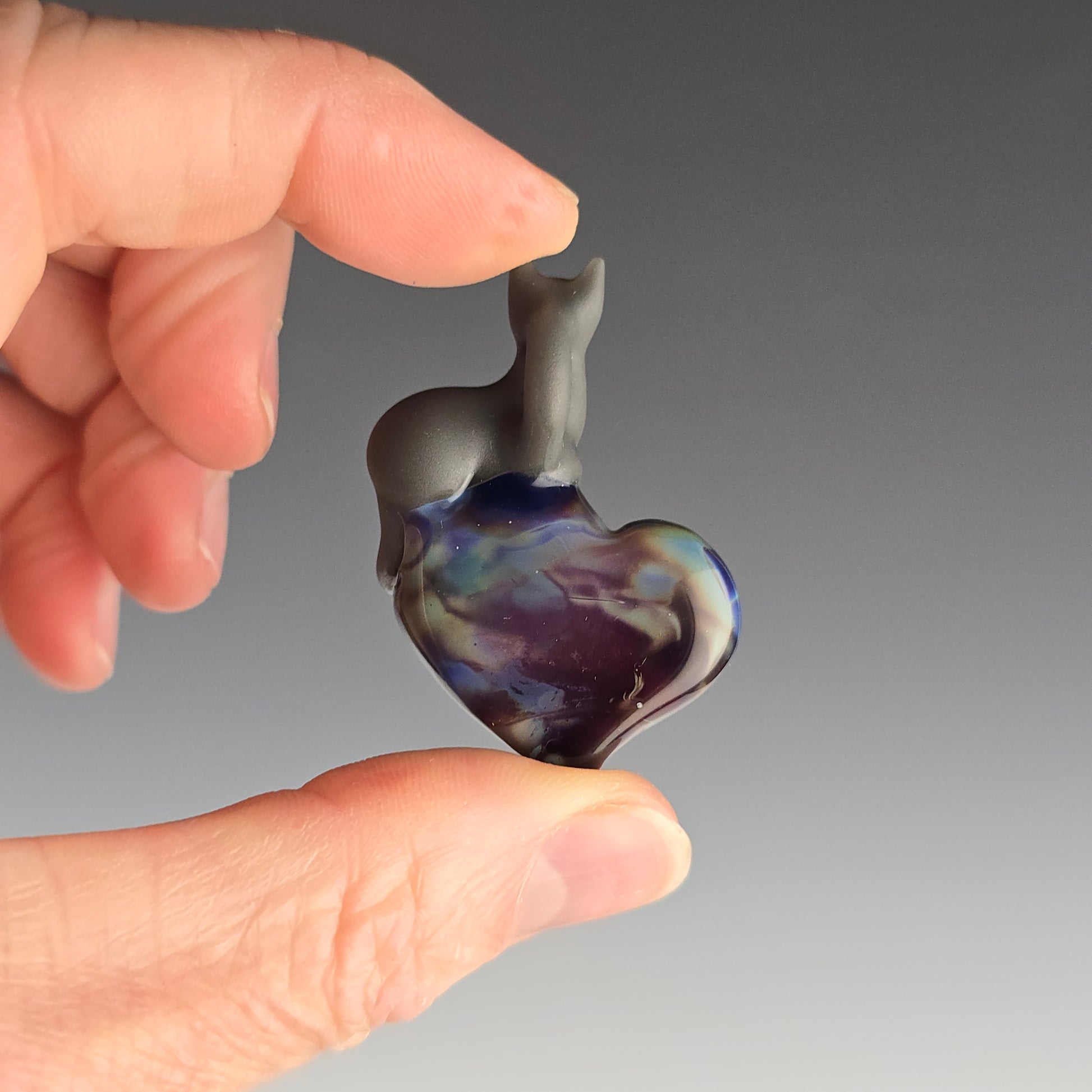 Portland Gray Kitty Loaf on a Purple Sable heart. The Kitty has been sandblasted which gives it a matte appearance. It is then rubbed with mineral oil, to reduce the appearance of fingerprints. See photos for size reference.