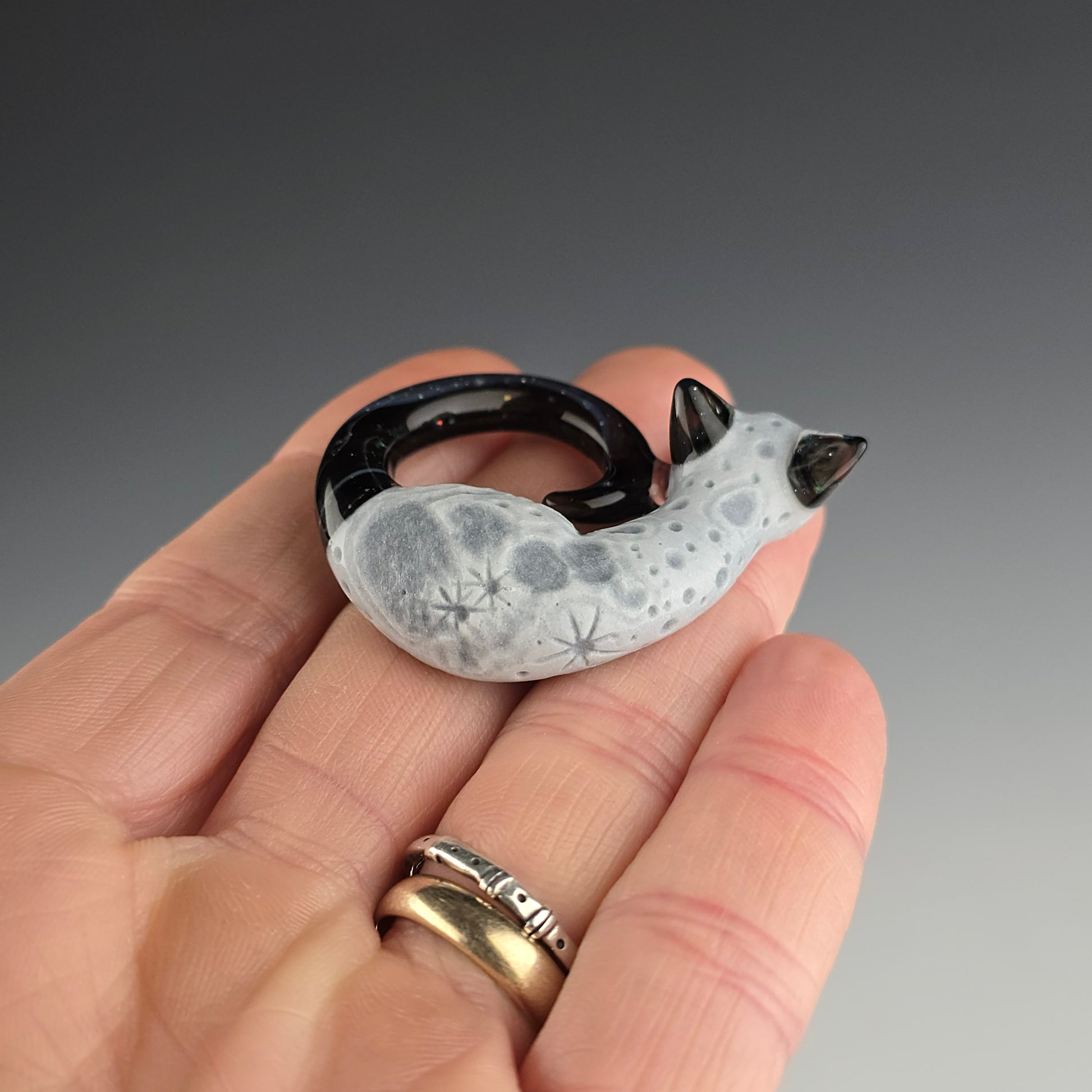 Your Sleeping Kitty will come in a faux fur lined "Kitty Bed" box with stickers. The Argentium jump rind can be removed upon request. See photos for size reference. Pendant comes signed and dated with a titanium pen.