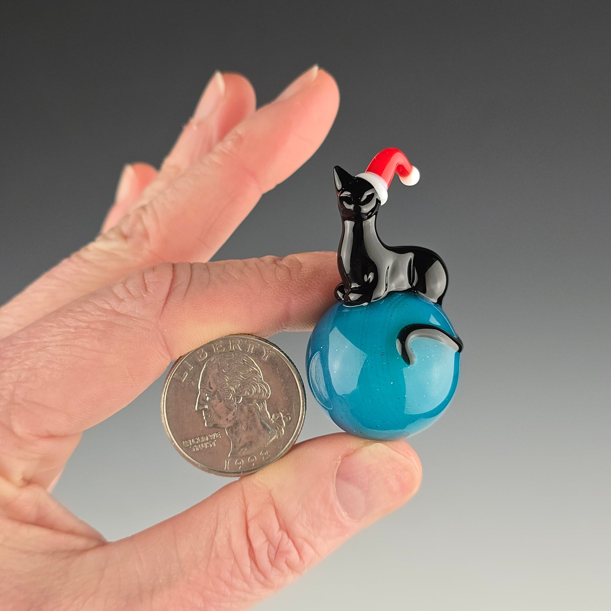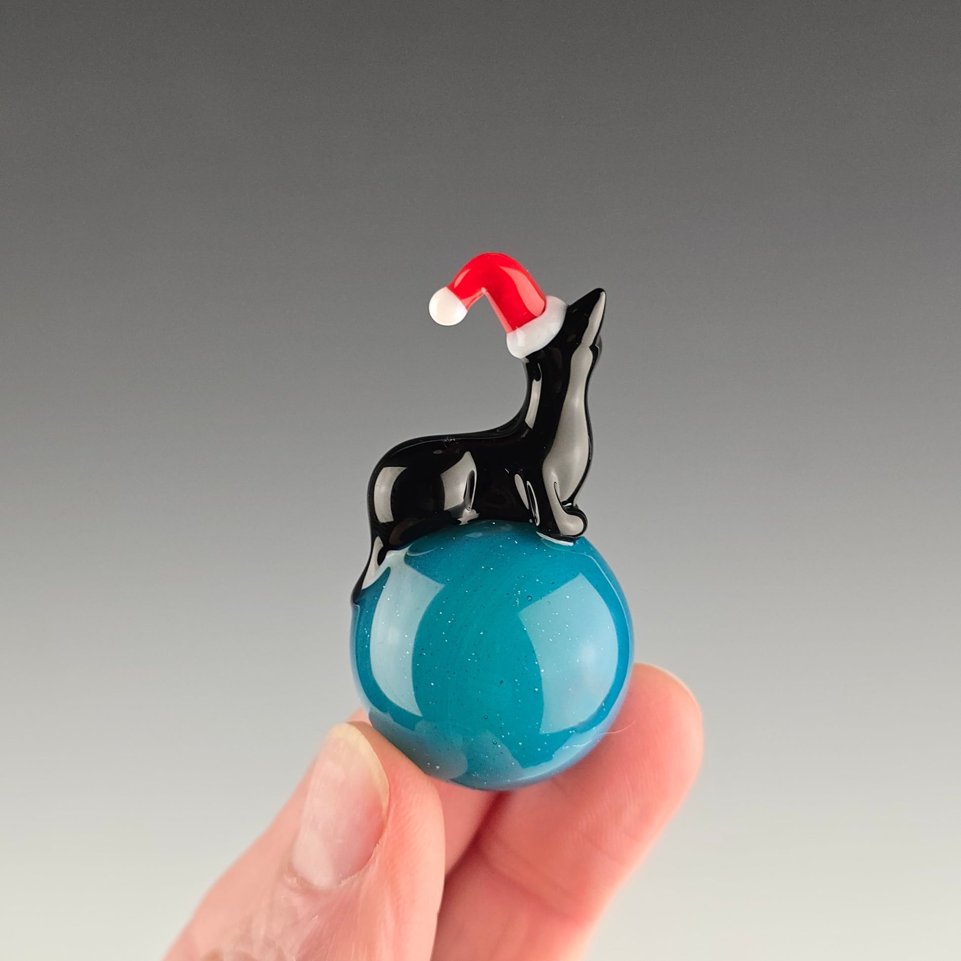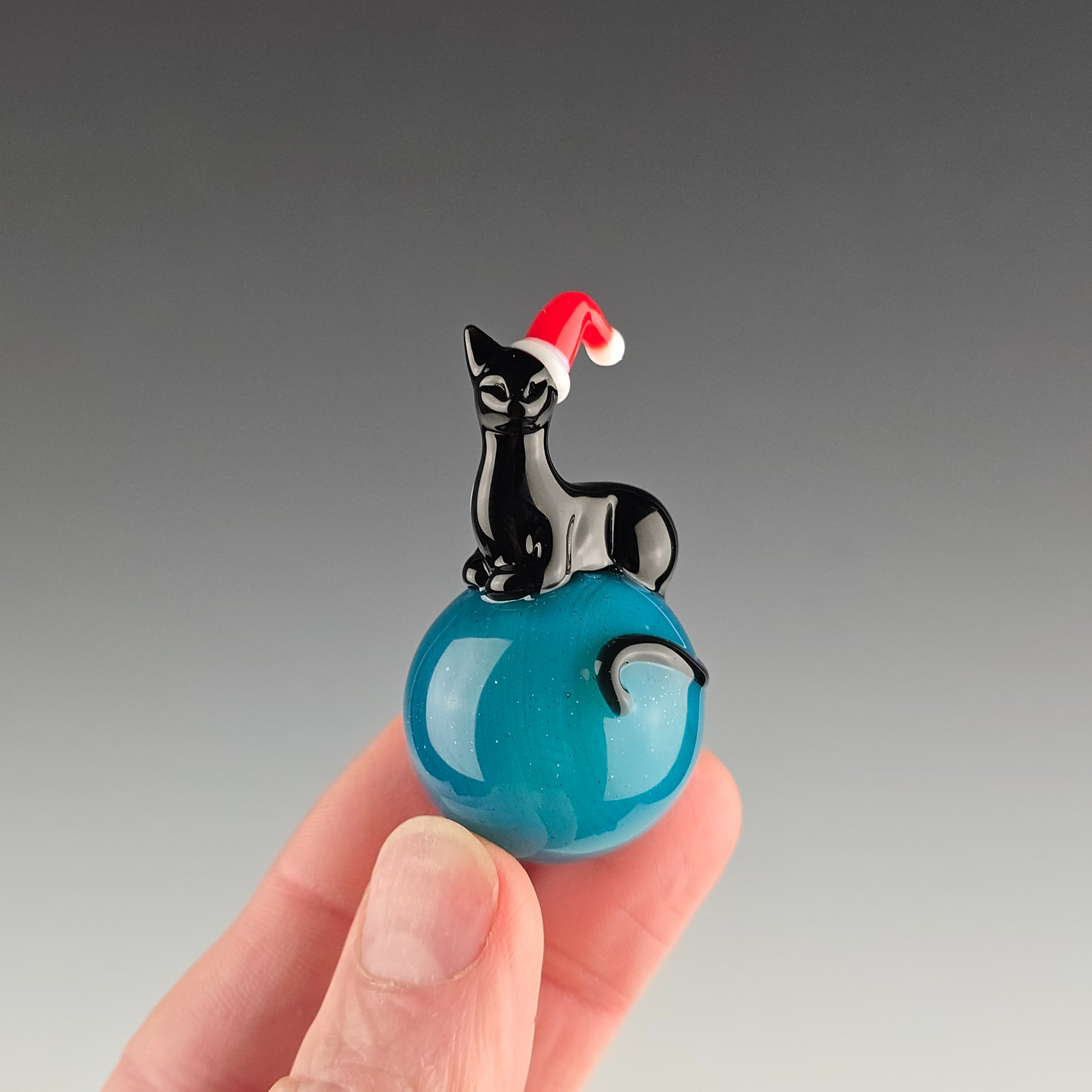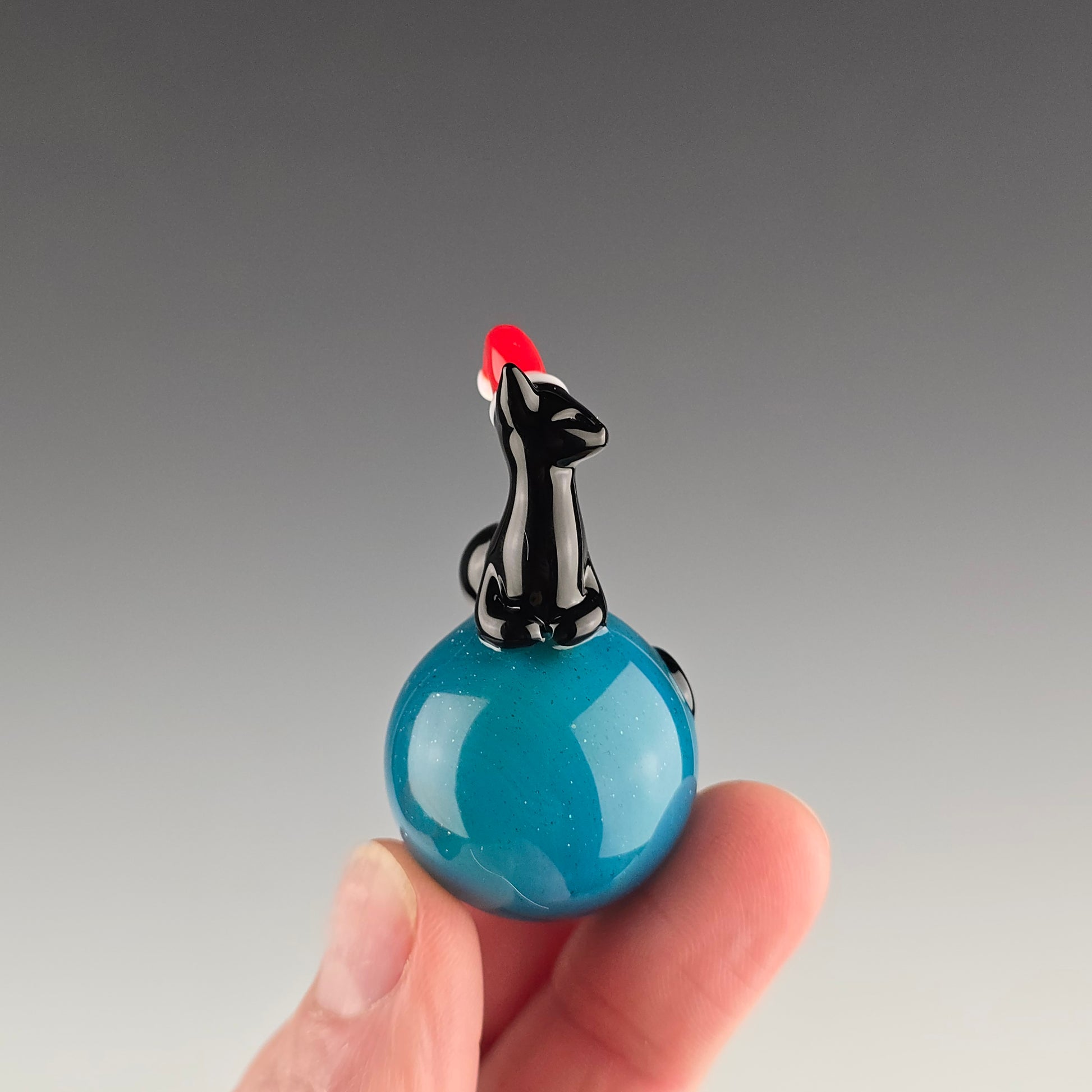 This 25.5mm Meowble is made with Blue Stardust over Meta Terrania and has an Onyx Kitty loaf wearing a Red Santa Hat on it.