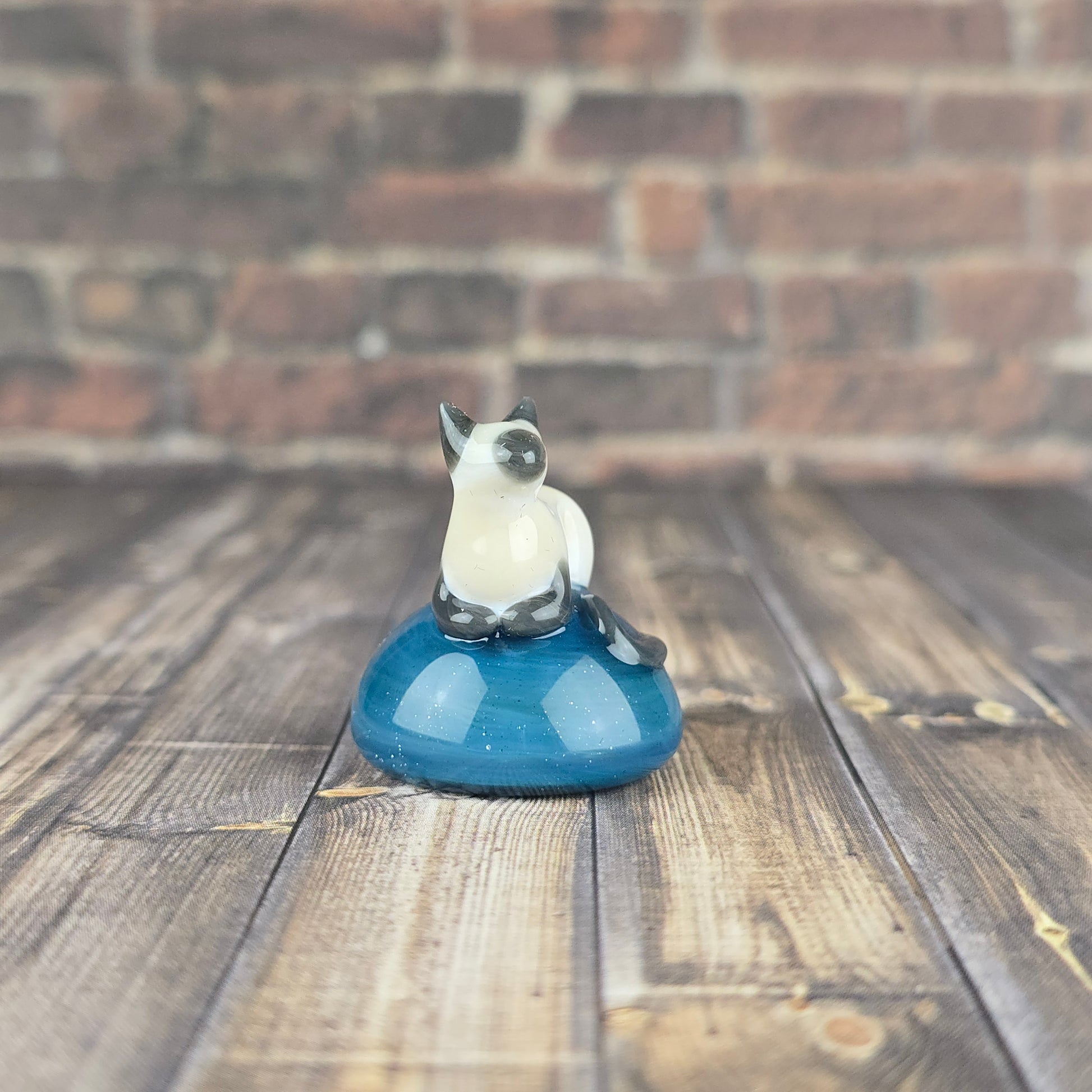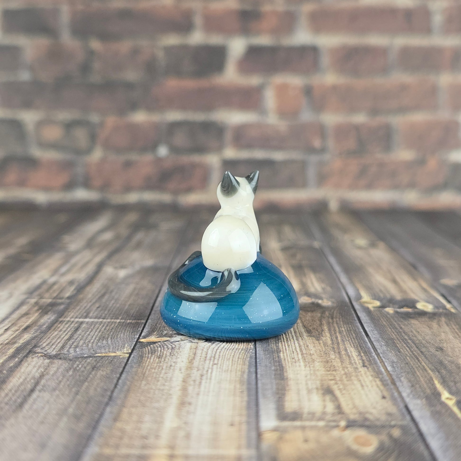 Blue Point Siamese Kitty loafing on a Sparkly Blue bed. See photos for size reference. Will come boxed with a sticker.
