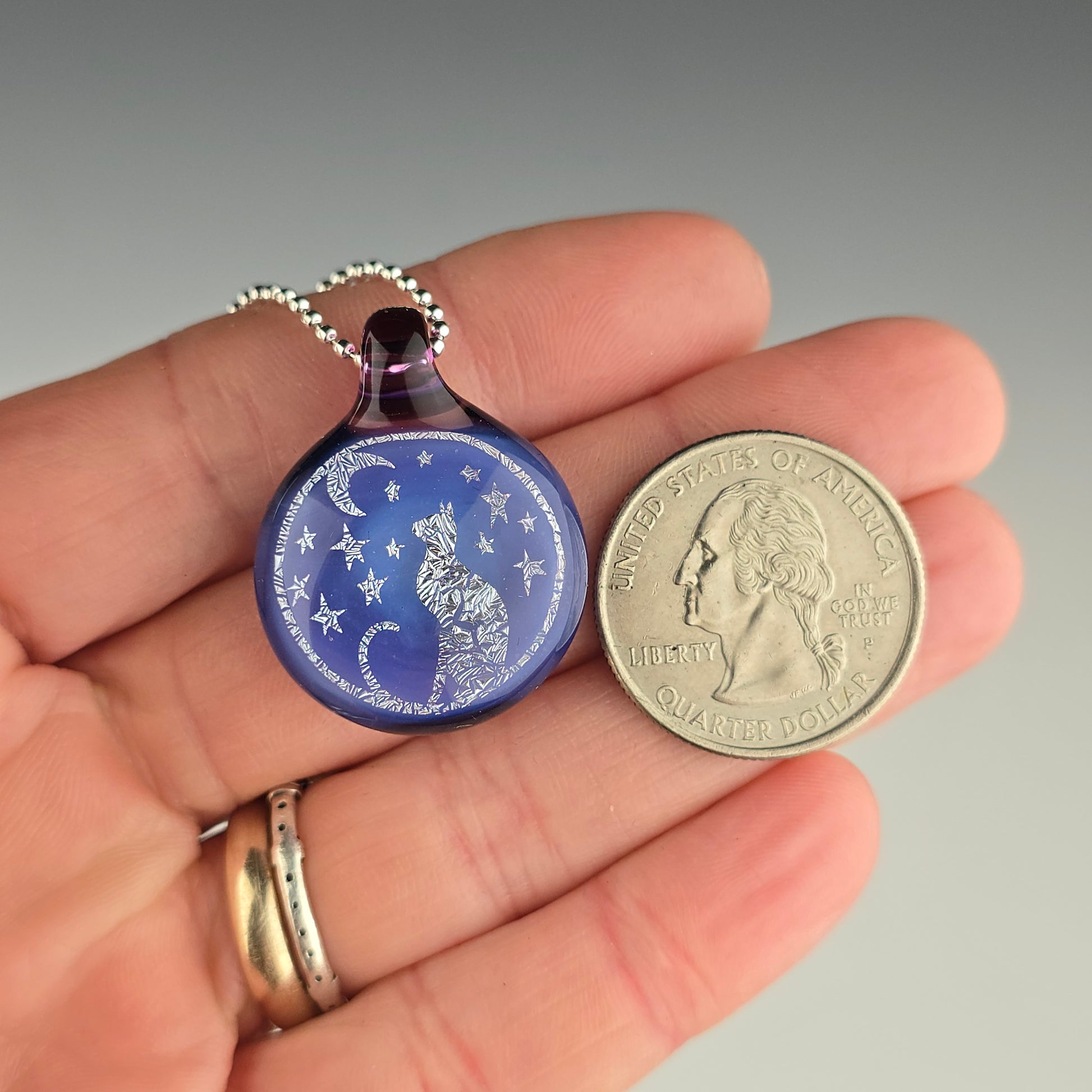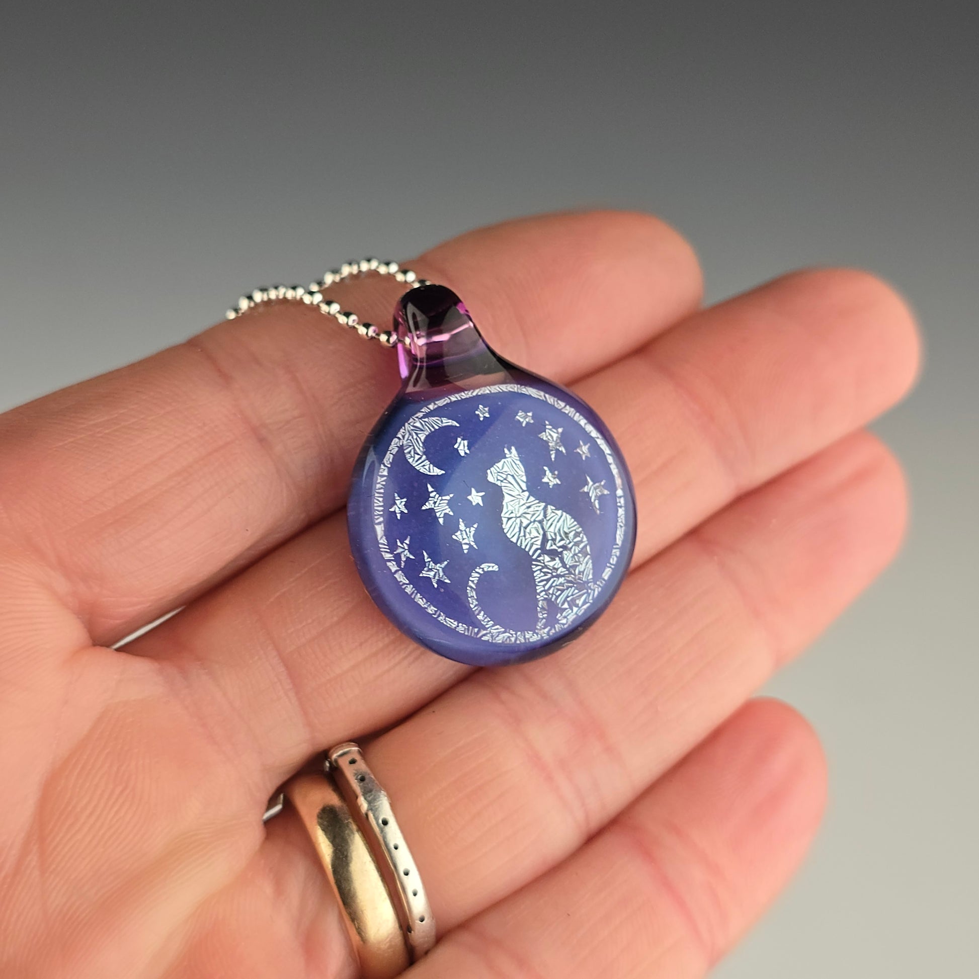 Silver Moon & Stars Kitty image with Royal Jelly & Blue Leprechaun background and a Gold Violet Amethyst bale. See photos for size reference.