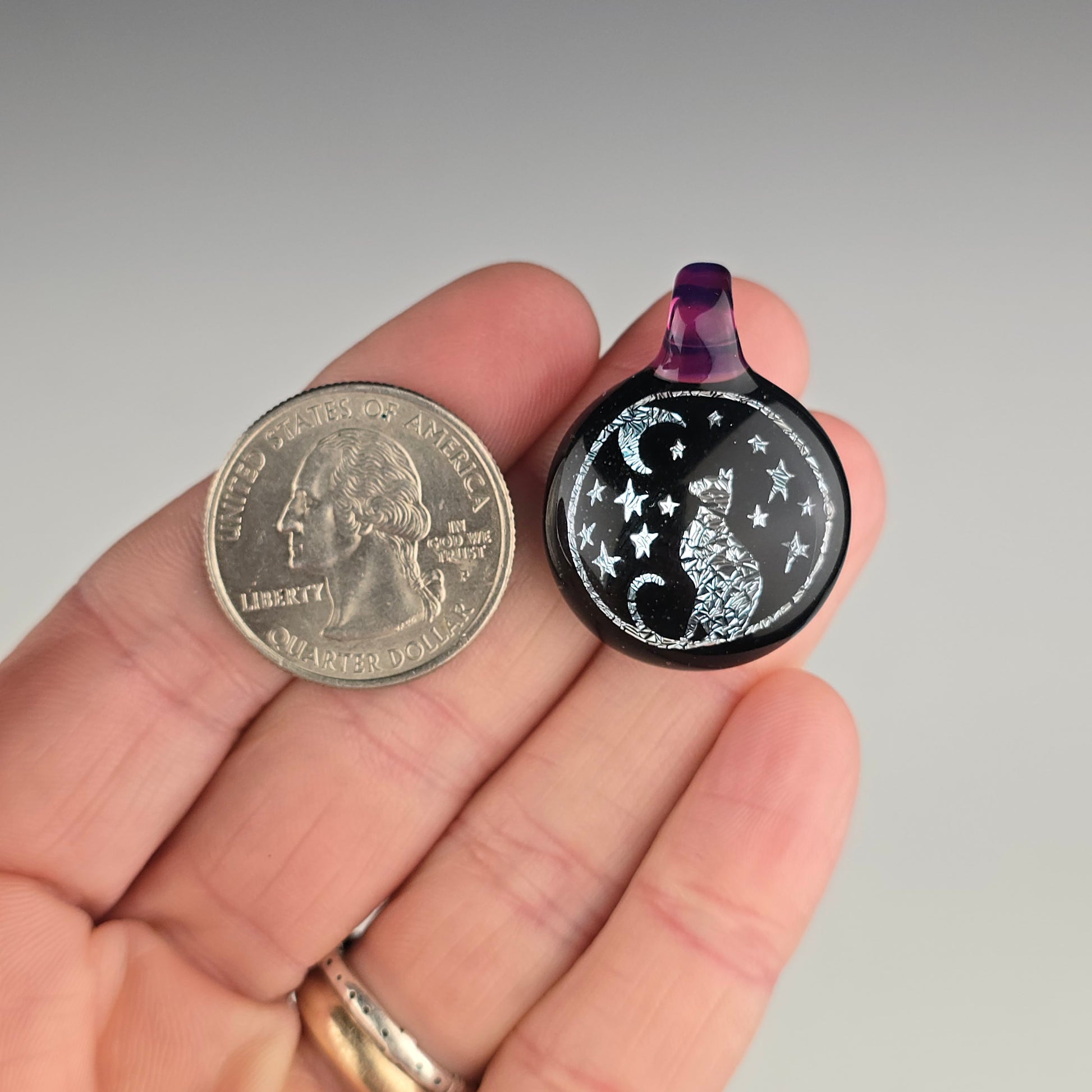Silver Moon & Stars Kitty image with Galaxy background and Gold Amethyst bale. See photos for size reference.