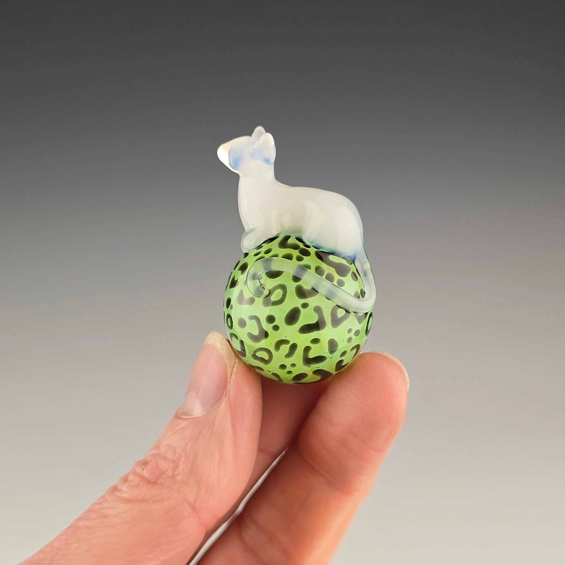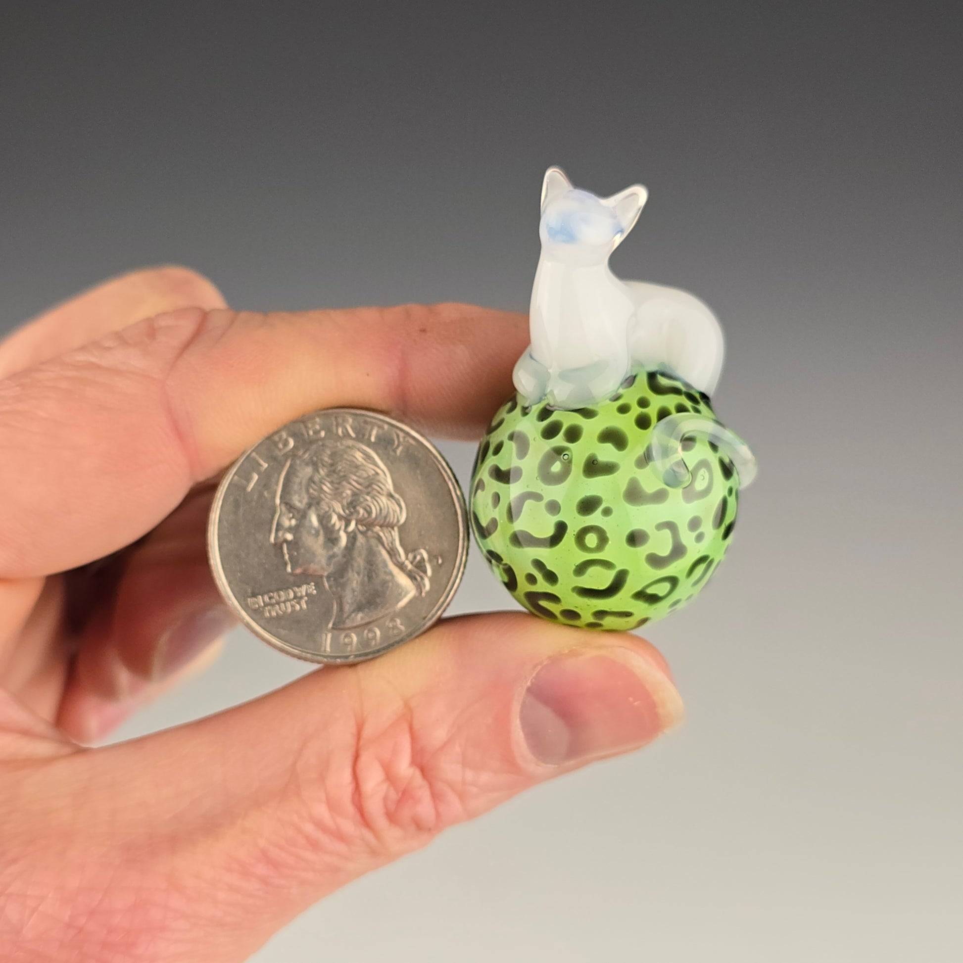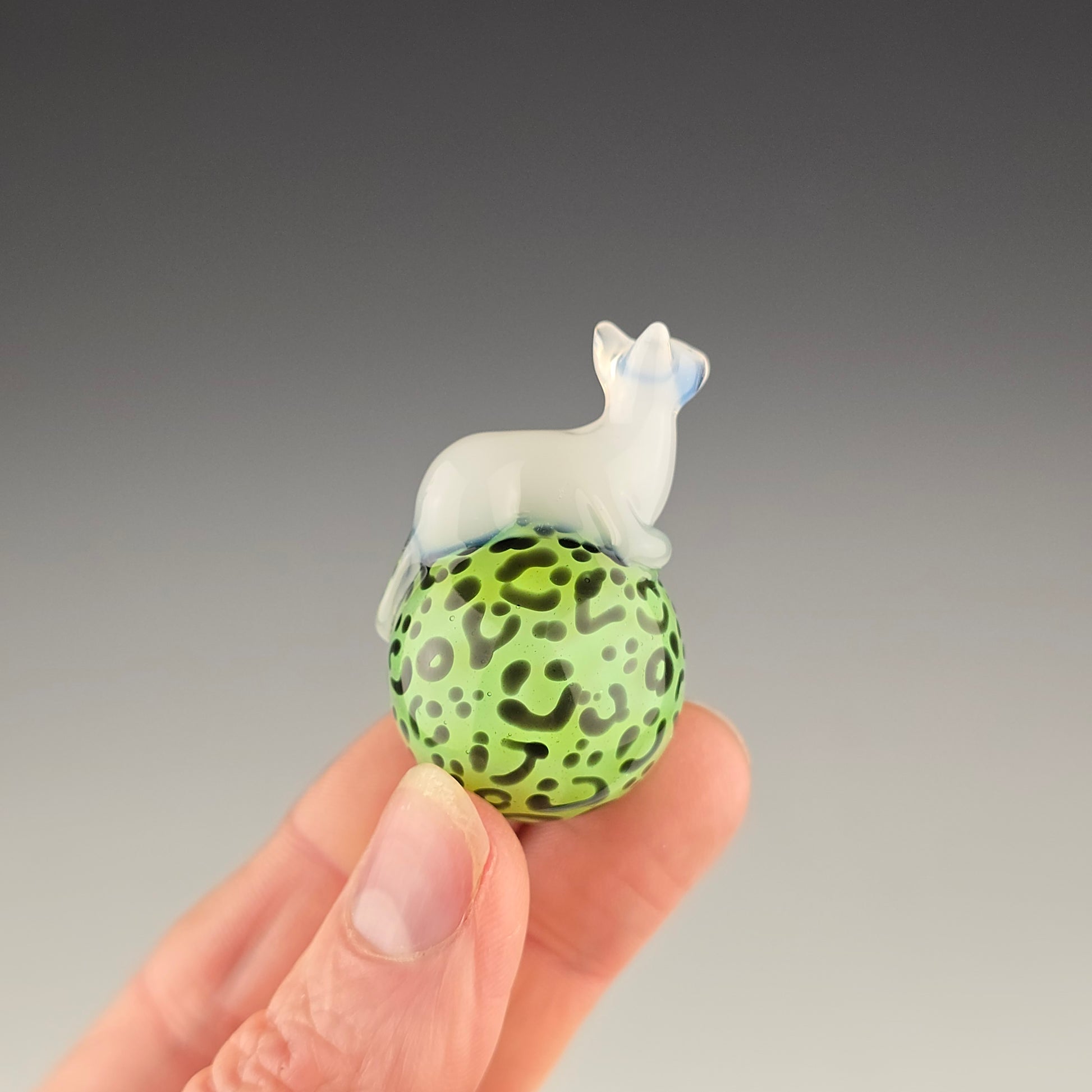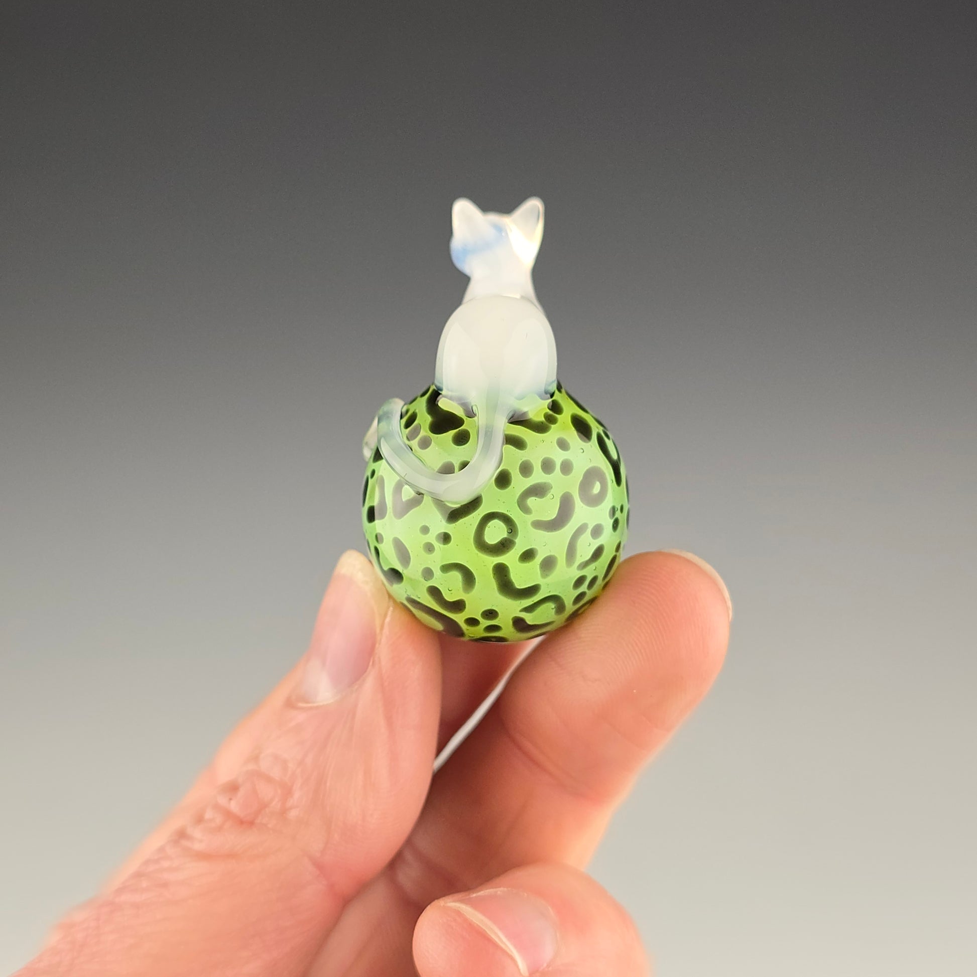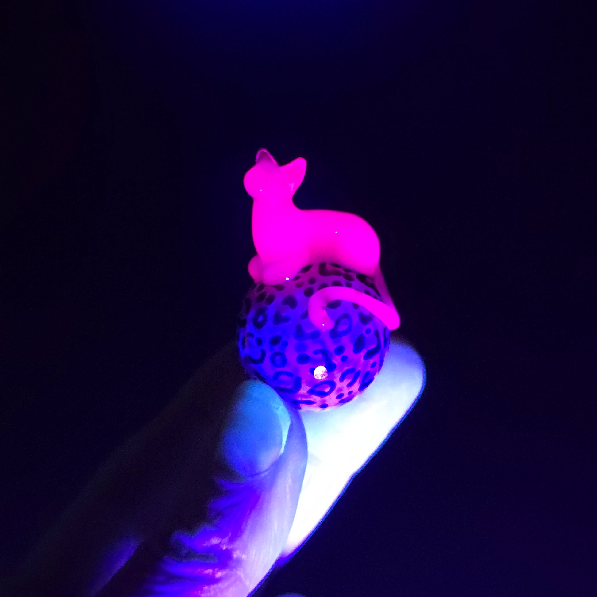 This 24.75mm Meowble is made with Light Green Stardust over Slyme with a UV reactive Glowstick Loaf. The kitty loaf glows pink under black light.