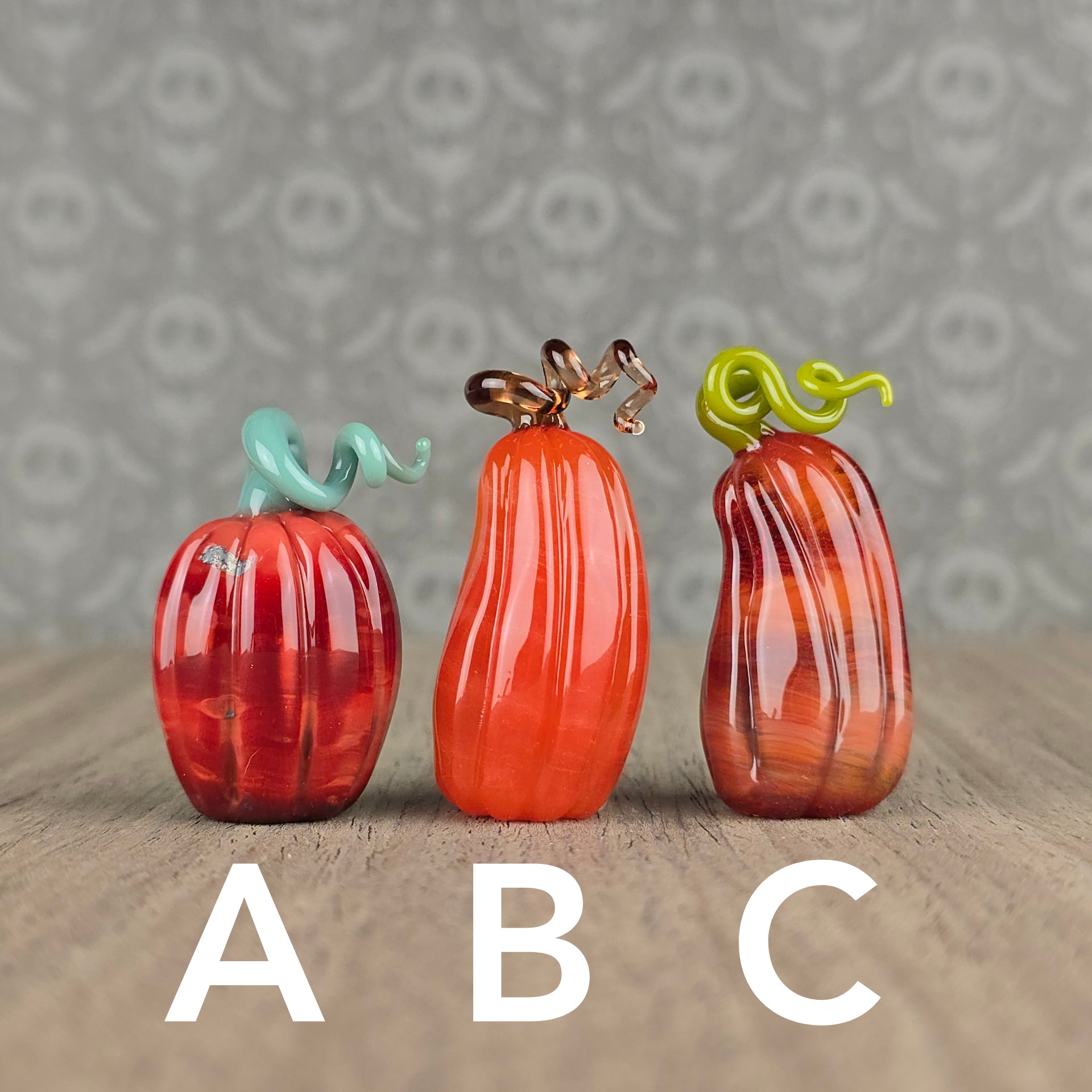 Listing is for one glass pumpkin trinket. See photos for identification reference and select specific pumpkin from available stock. See photos for size reference.