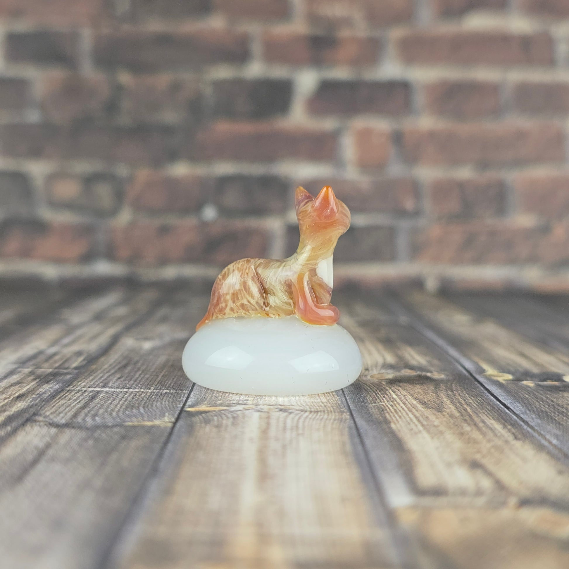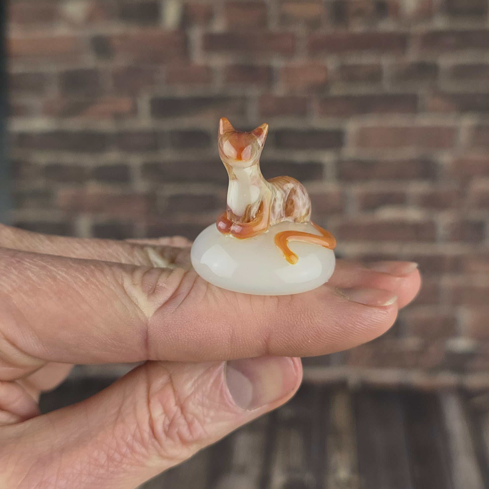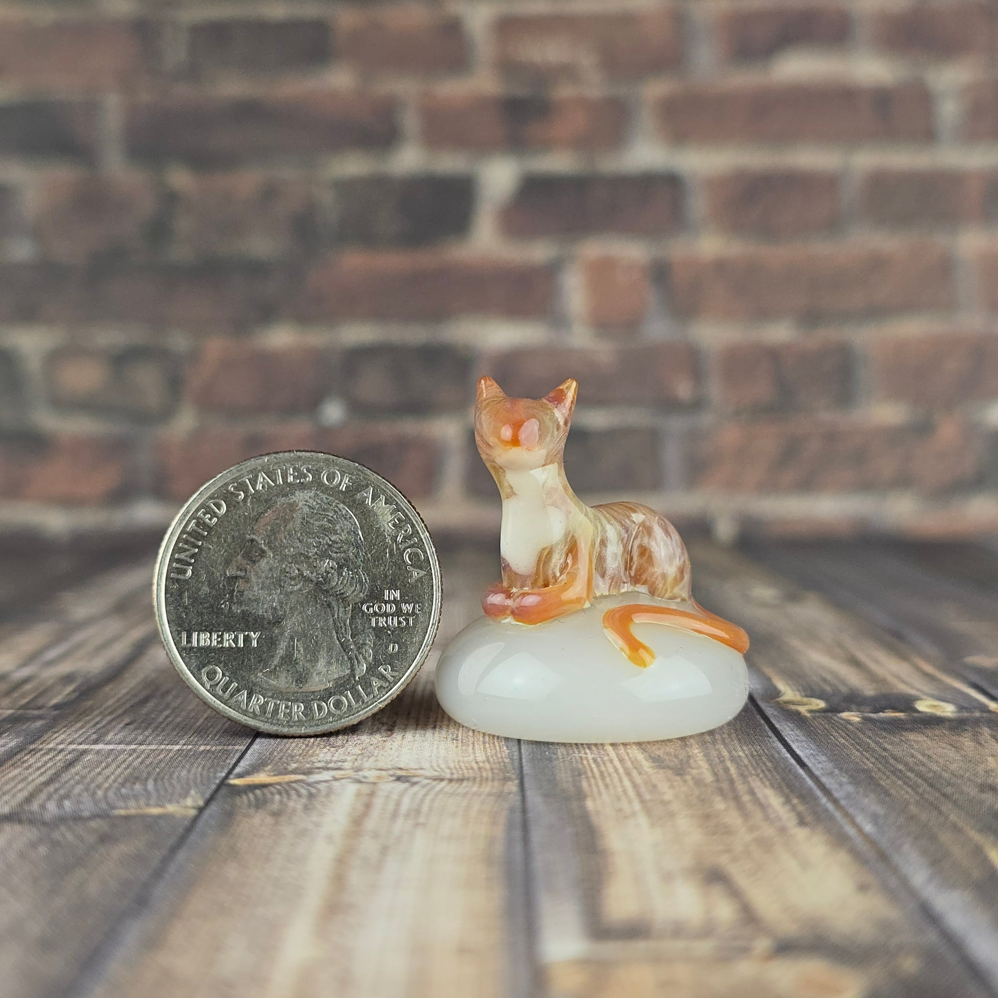 Tan Tabby Kitty loafing on a UV reactive Glowstick bed (glows pink under UV lighting). See photos for size reference. Will come boxed with a sticker.