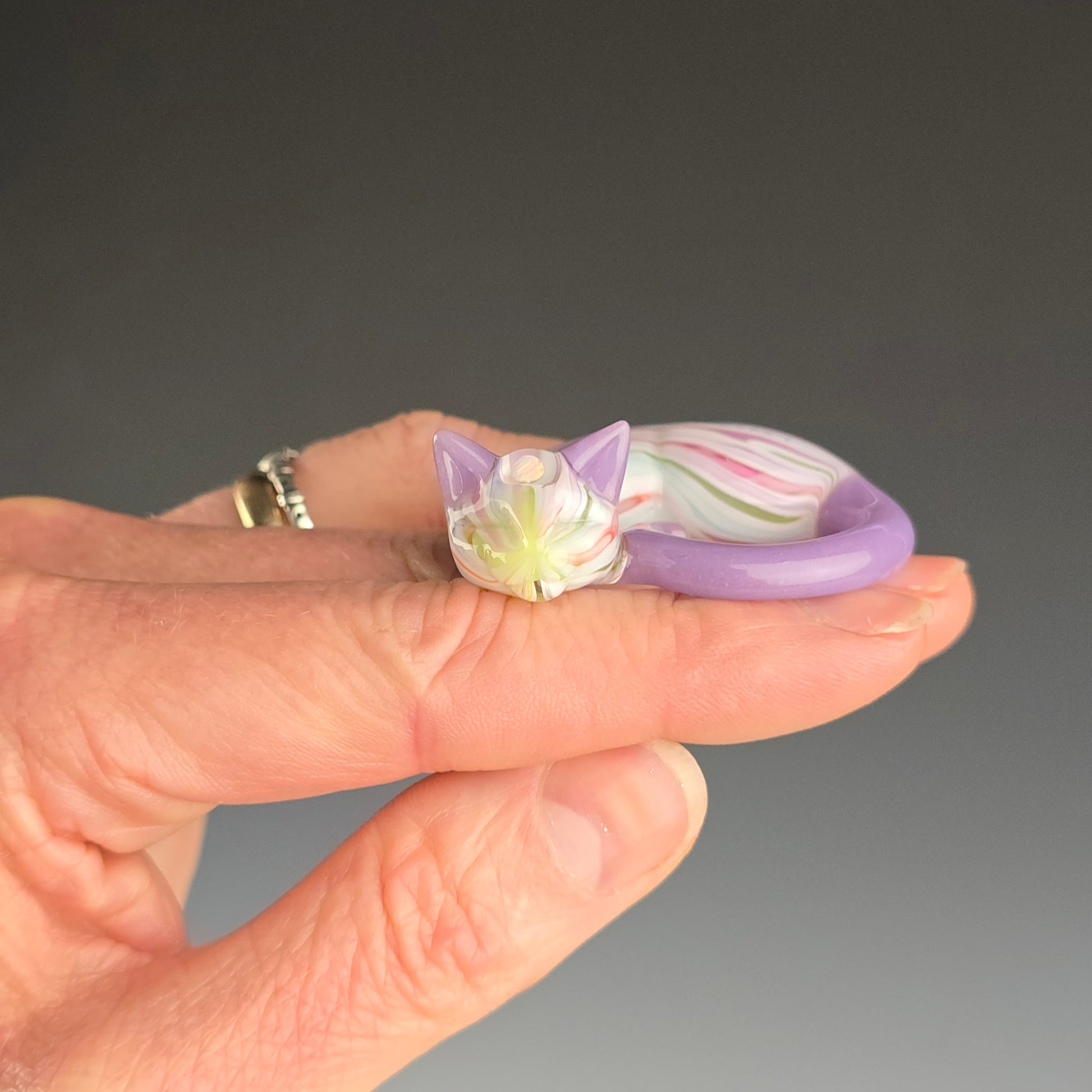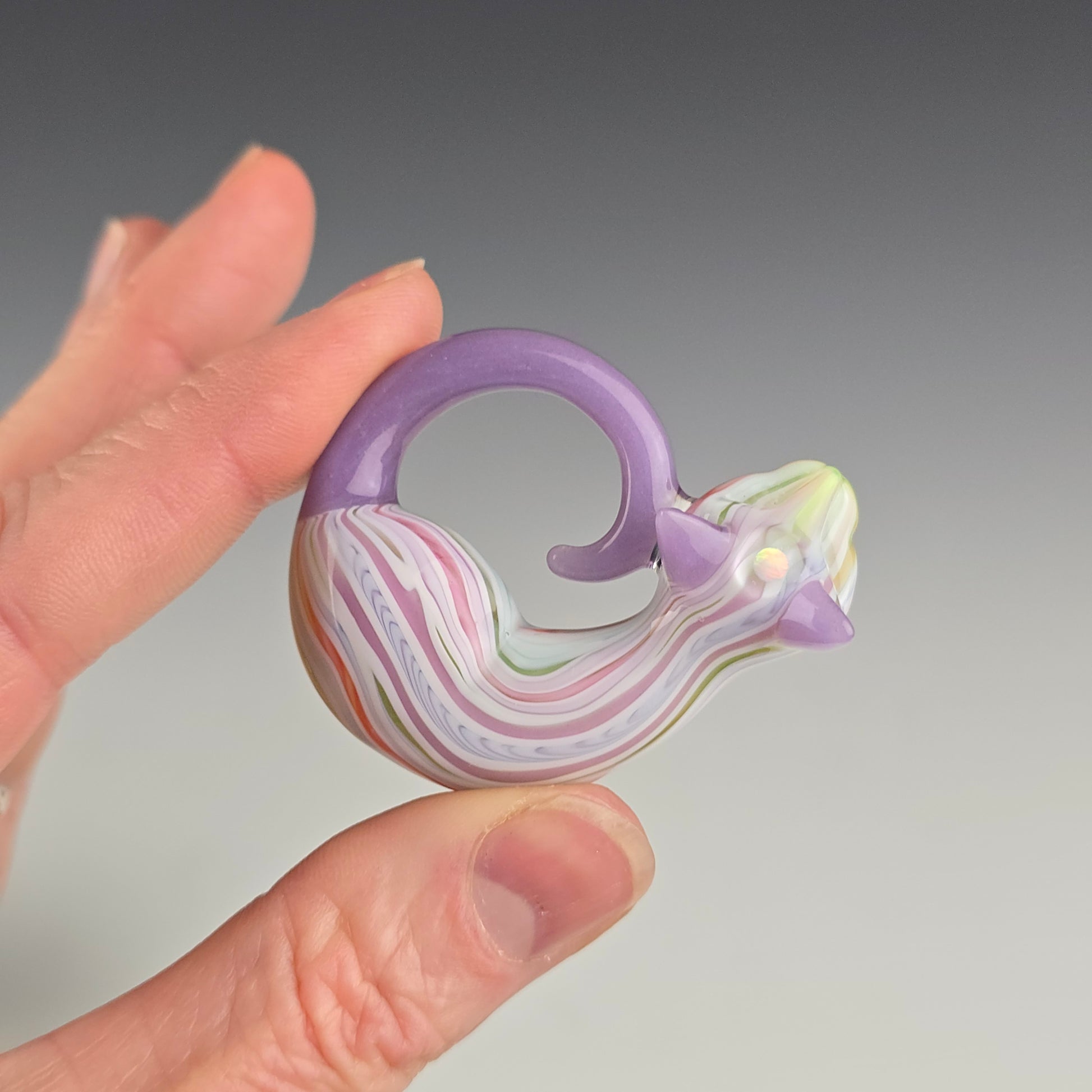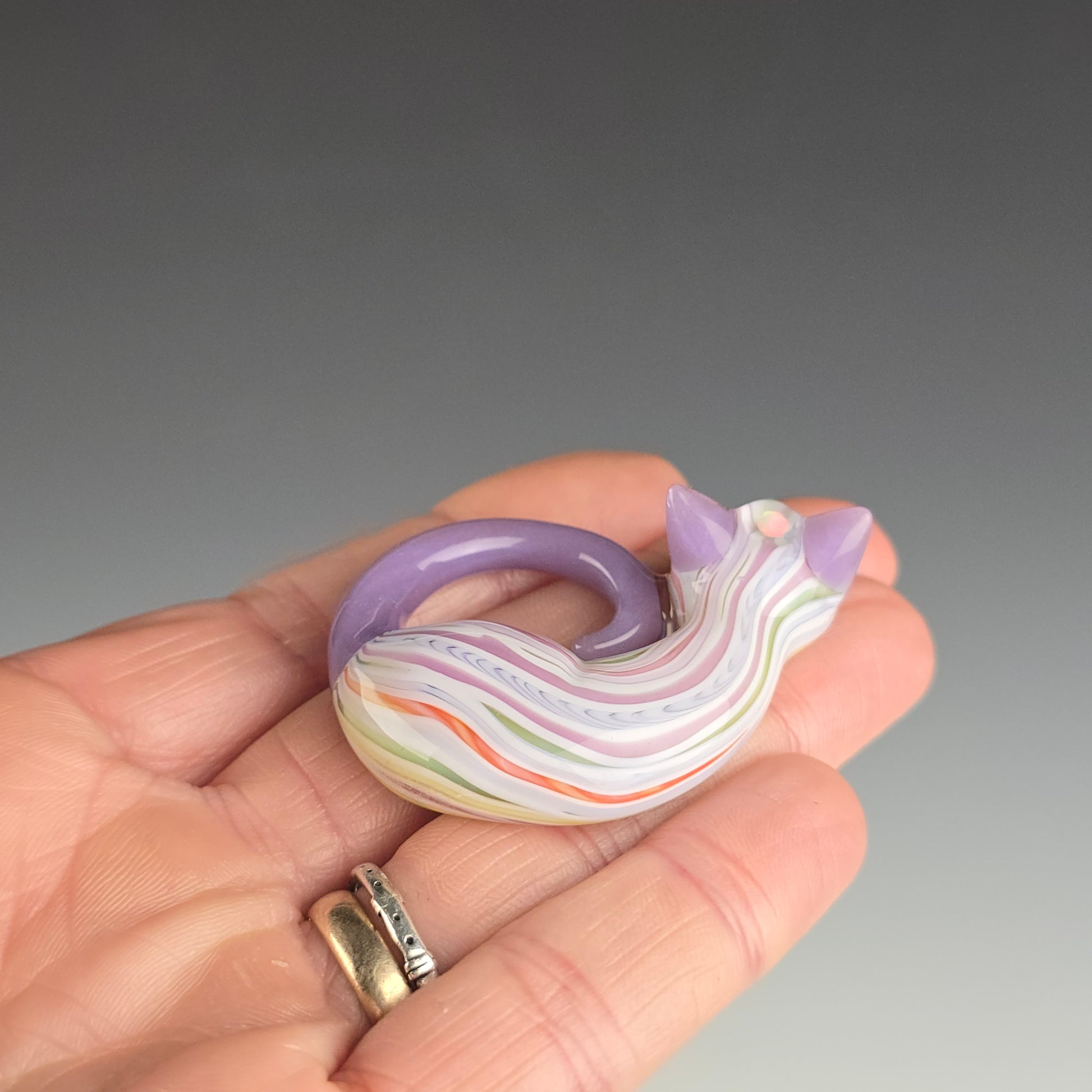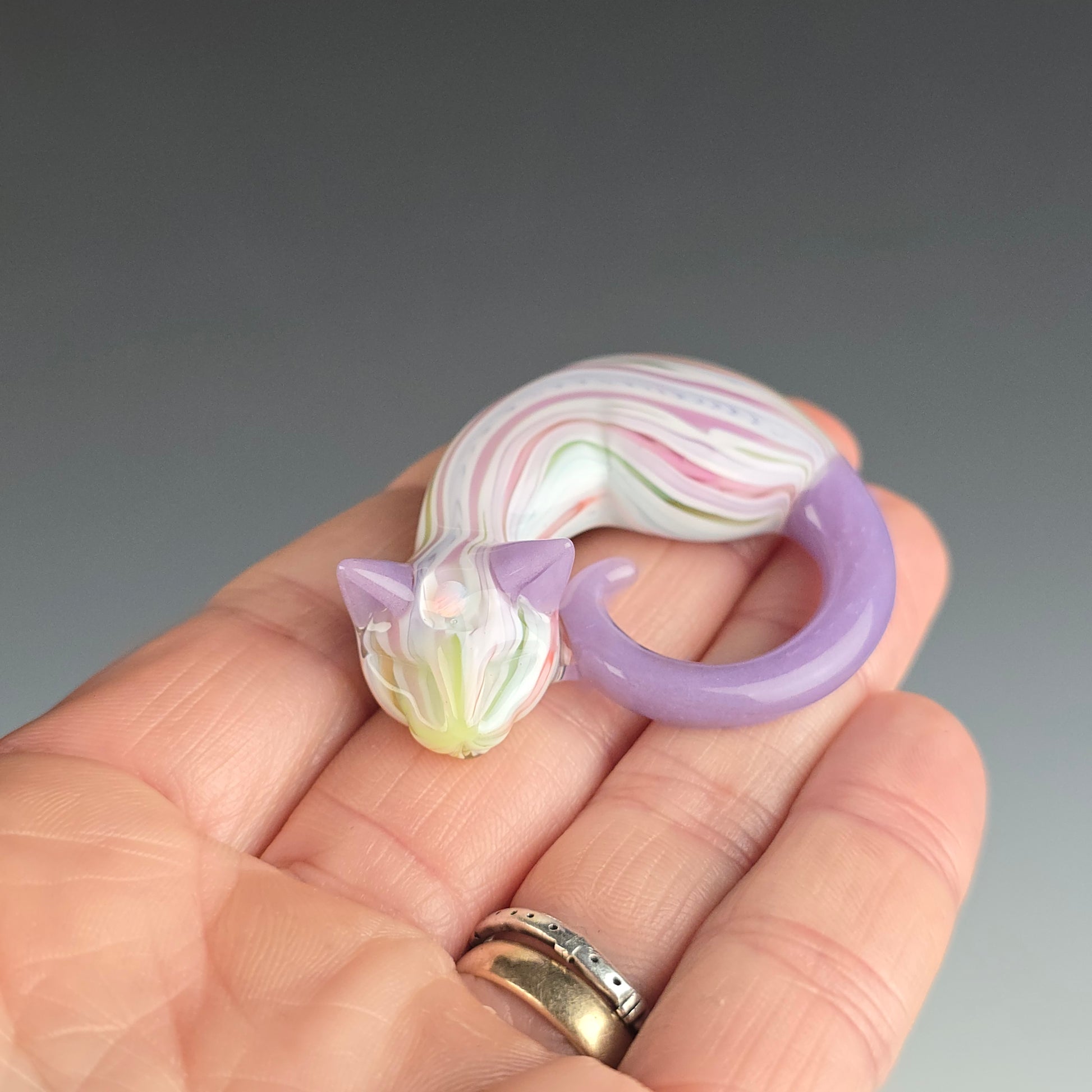 Made with Ashley's pastel Coogi tech and featuring a 2mm White Opal as its 3rd eye. The tail and ears are Wisteria. See photos for size reference. Ball chain, kitty bed box and stickers included.