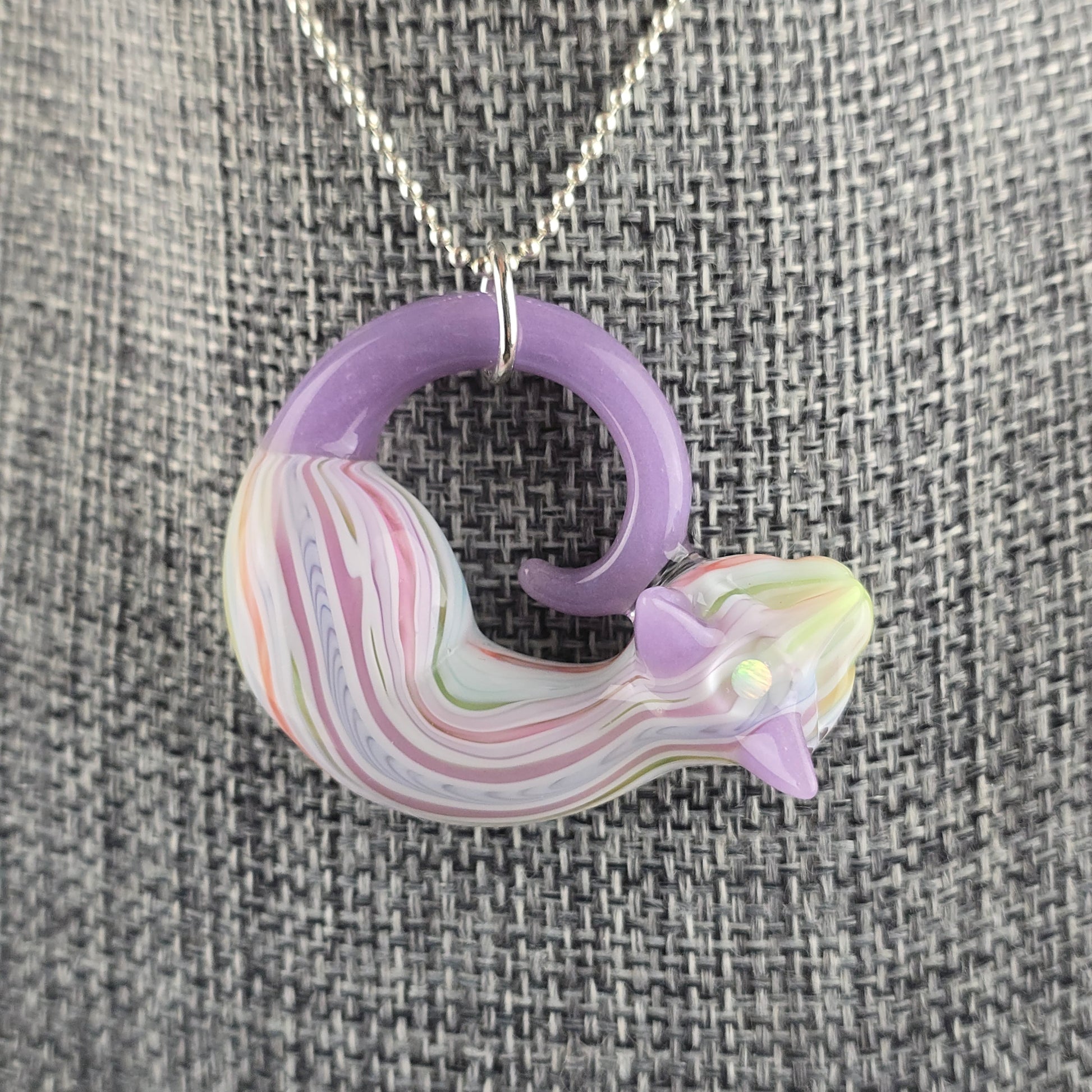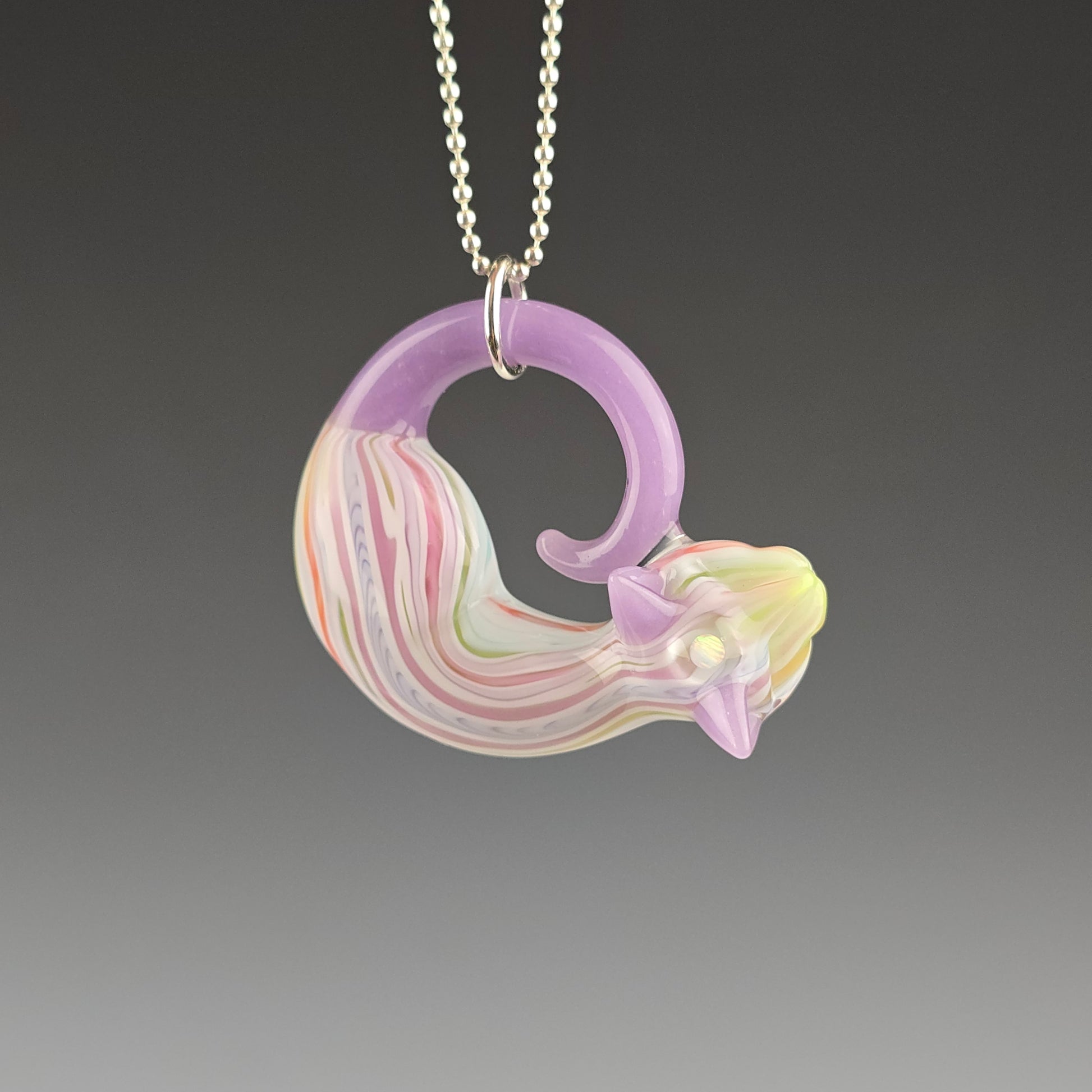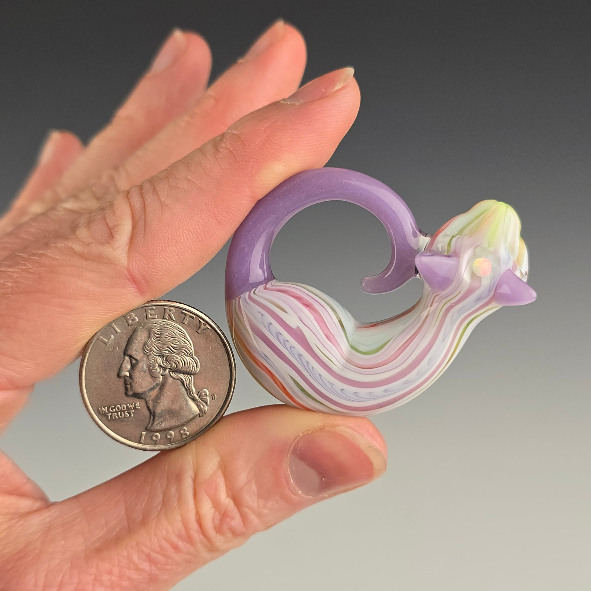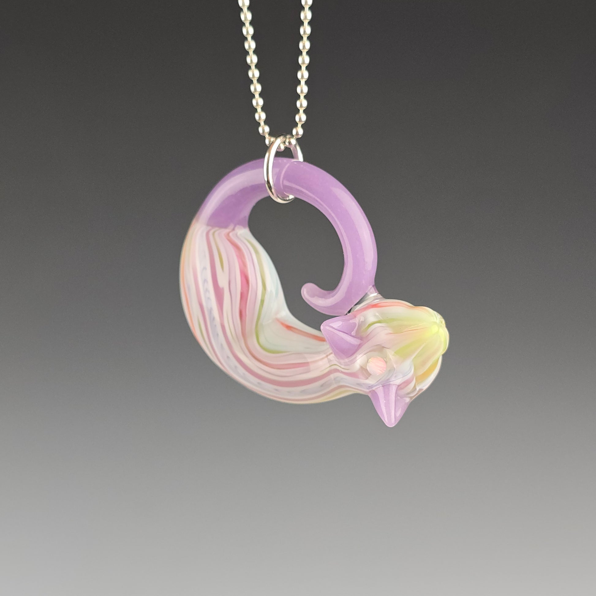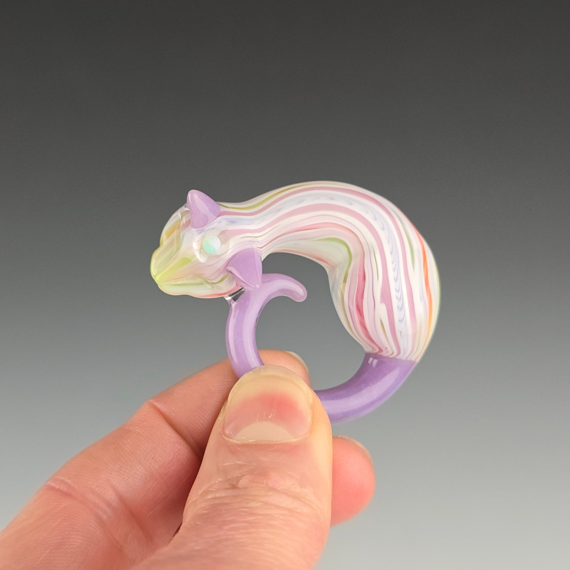 Made with Ashley's pastel Coogi tech and featuring a 2mm White Opal as its 3rd eye. The tail and ears are Wisteria. See photos for size reference. Ball chain, kitty bed box and stickers included.
