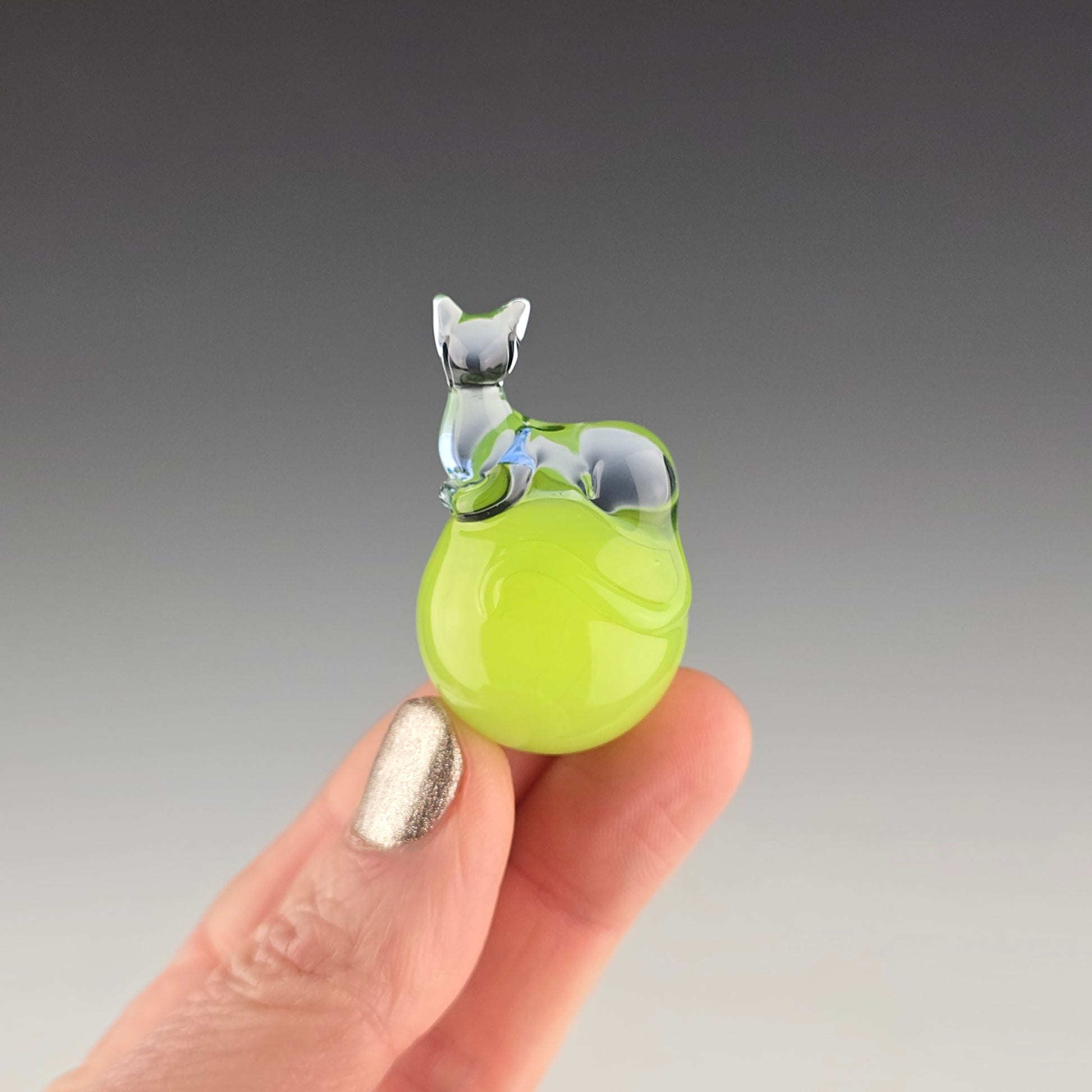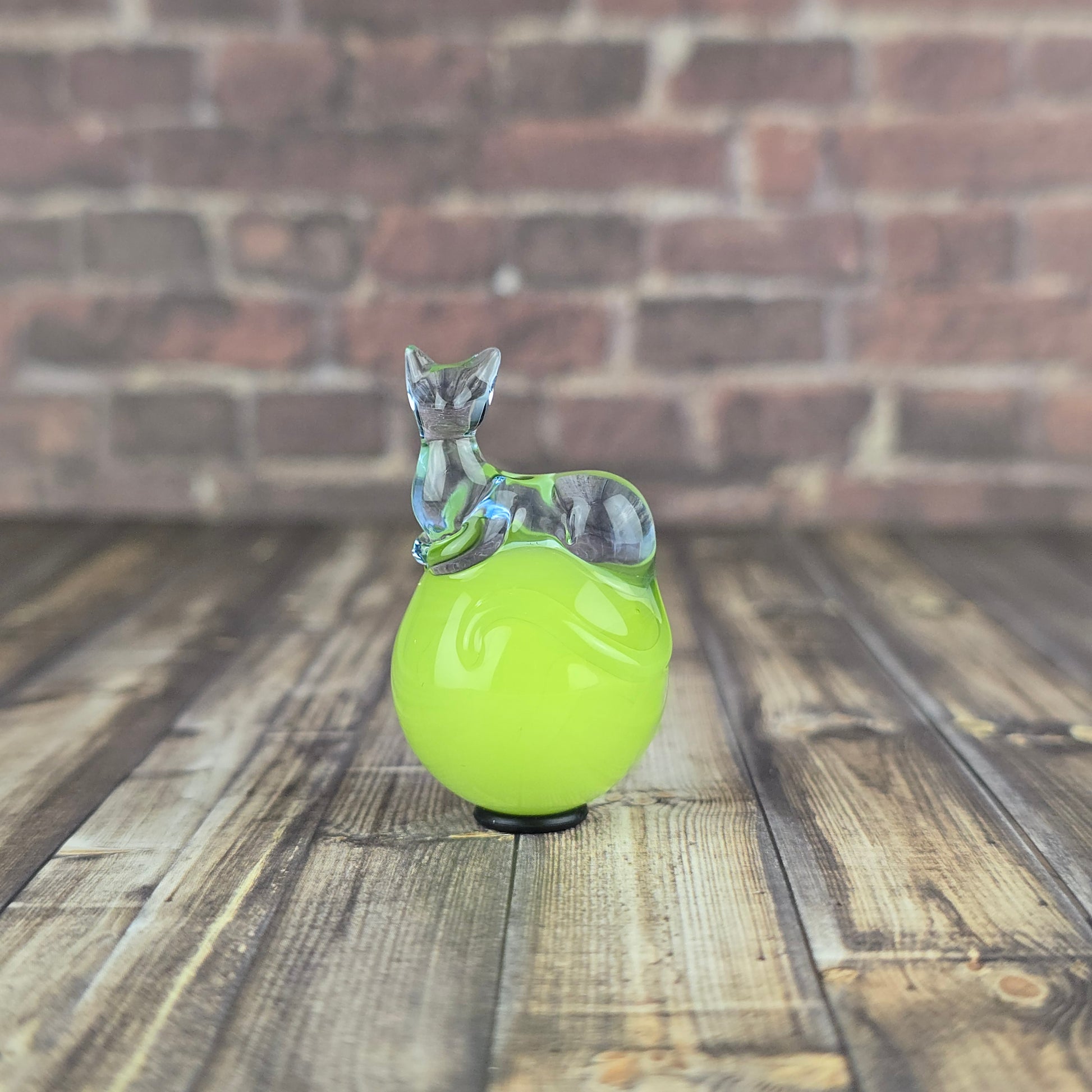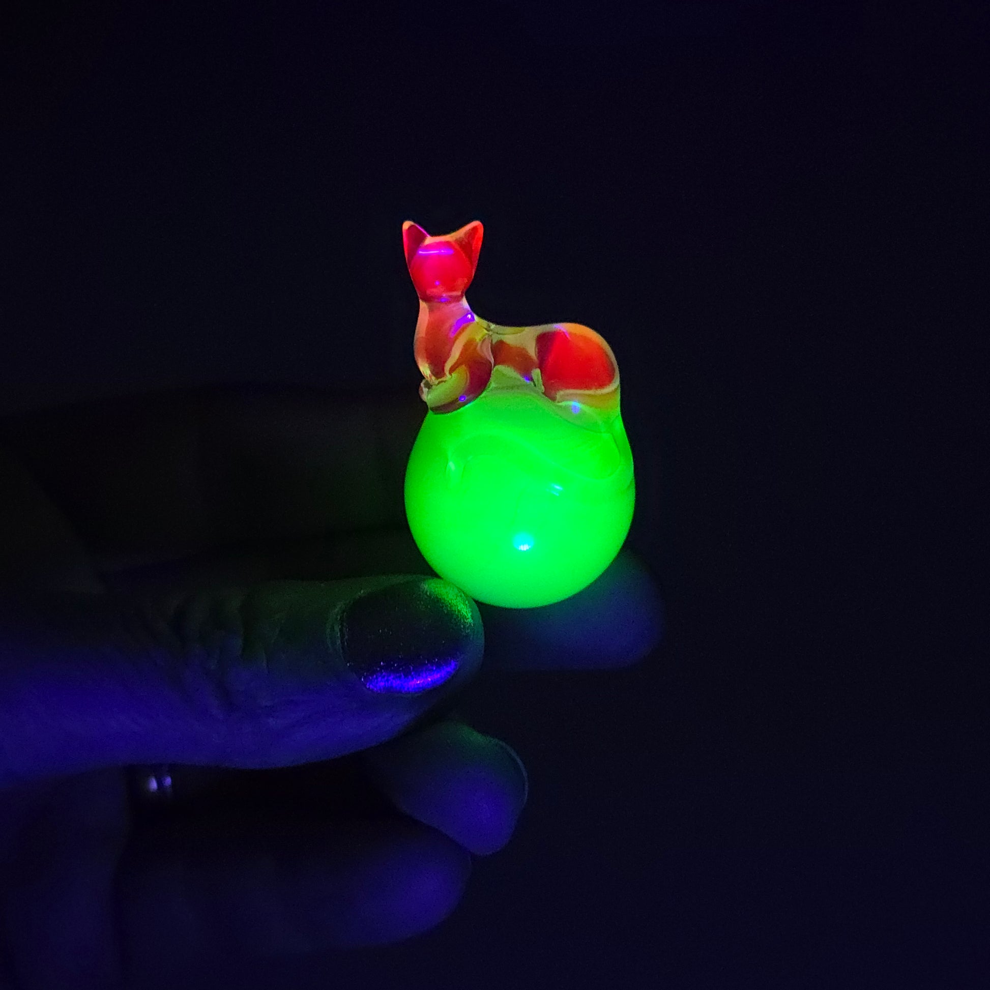 This 24.6mm Meowble is made with UV reactive Ion over Antidote so it glows green under UV lighting. The Loaf is made with UV reactive Blue Dreamingo, so it glows pink under UV lighting. Comes boxed with a sticker & rubber grommet to use as a marble stand.