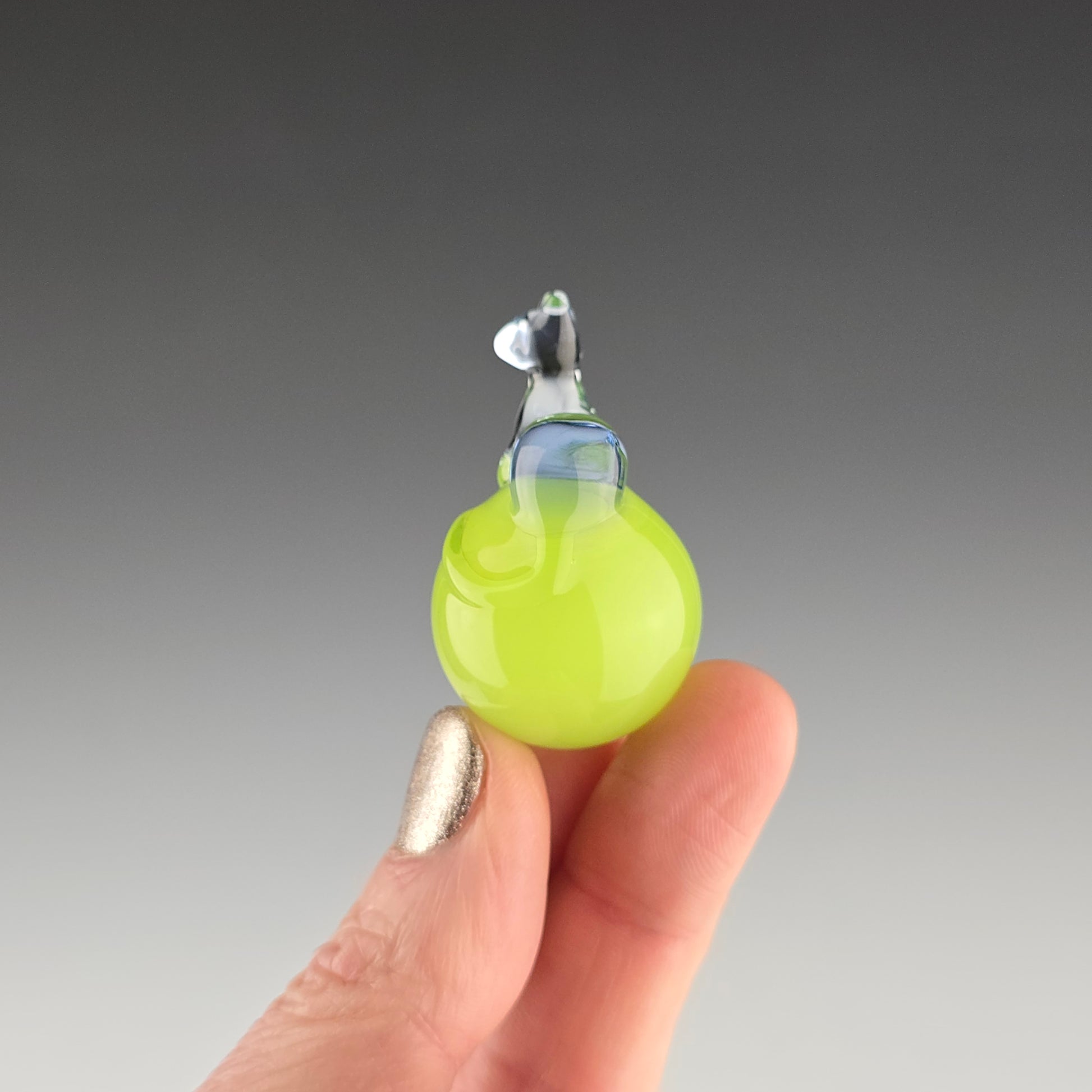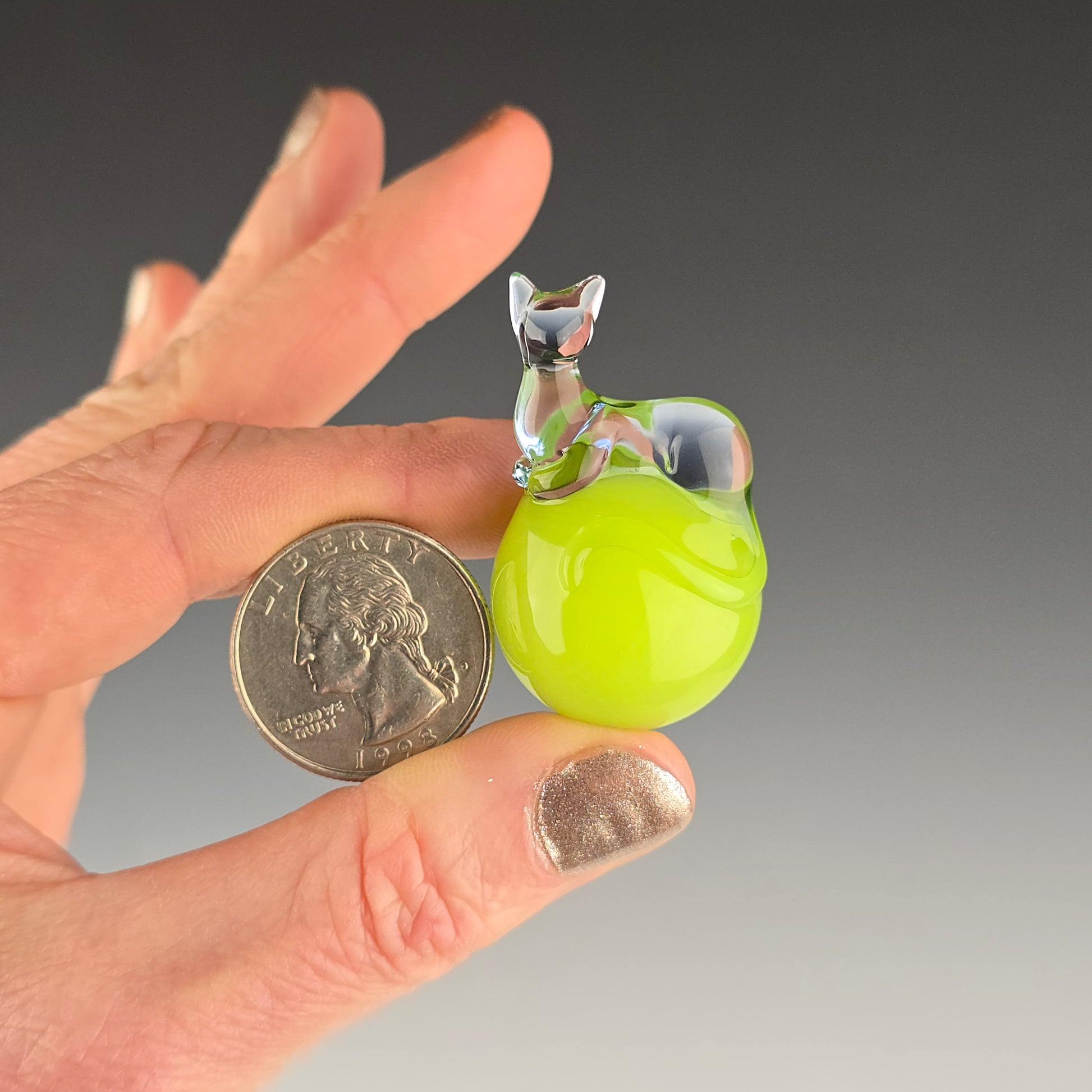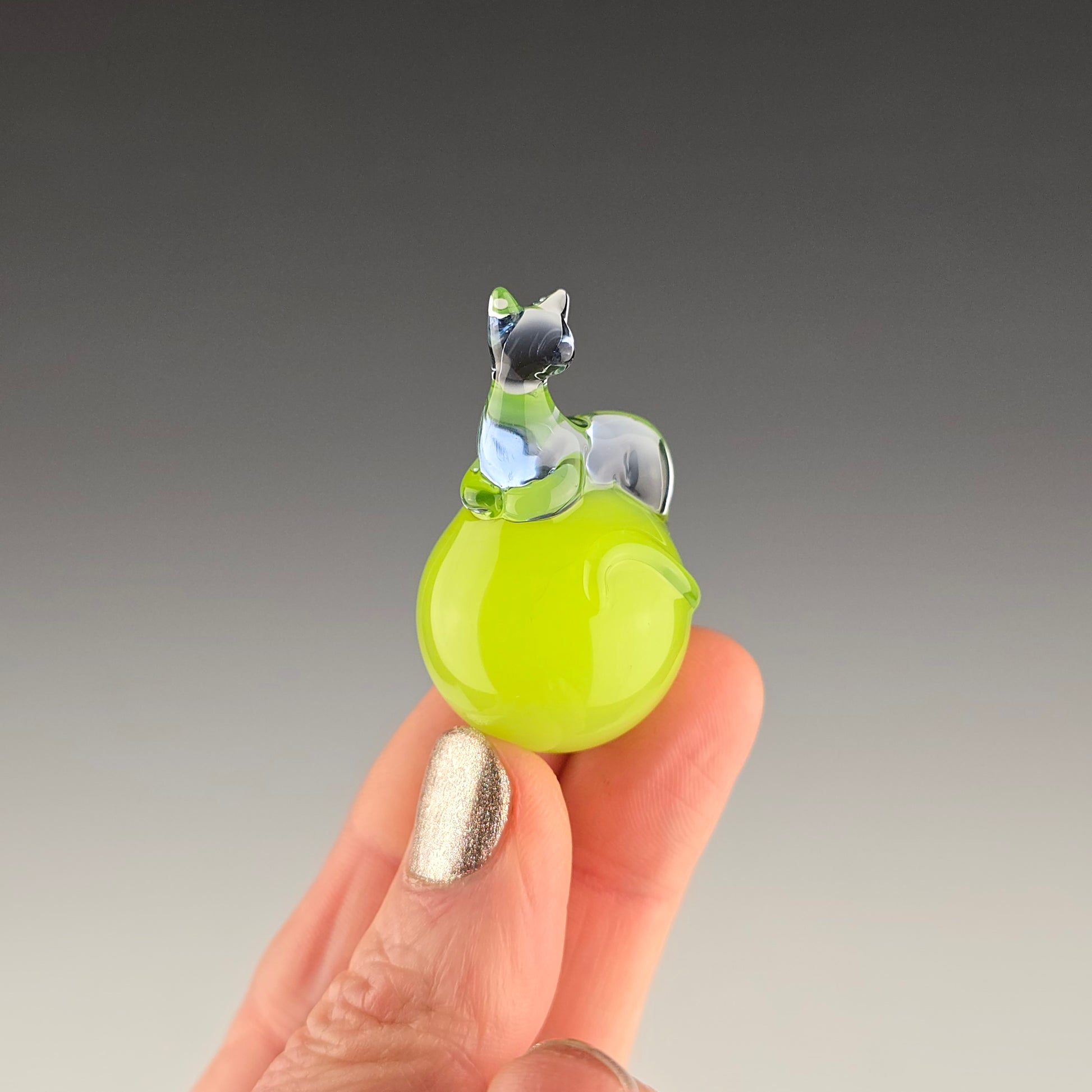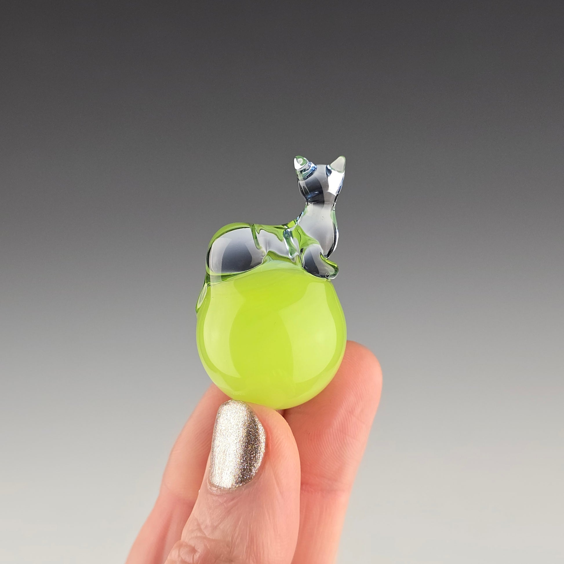 This 24.6mm Meowble is made with UV reactive Ion over Antidote so it glows green under UV lighting. The Loaf is made with UV reactive Blue Dreamingo, so it glows pink under UV lighting. Comes boxed with a sticker & rubber grommet to use as a marble stand.
