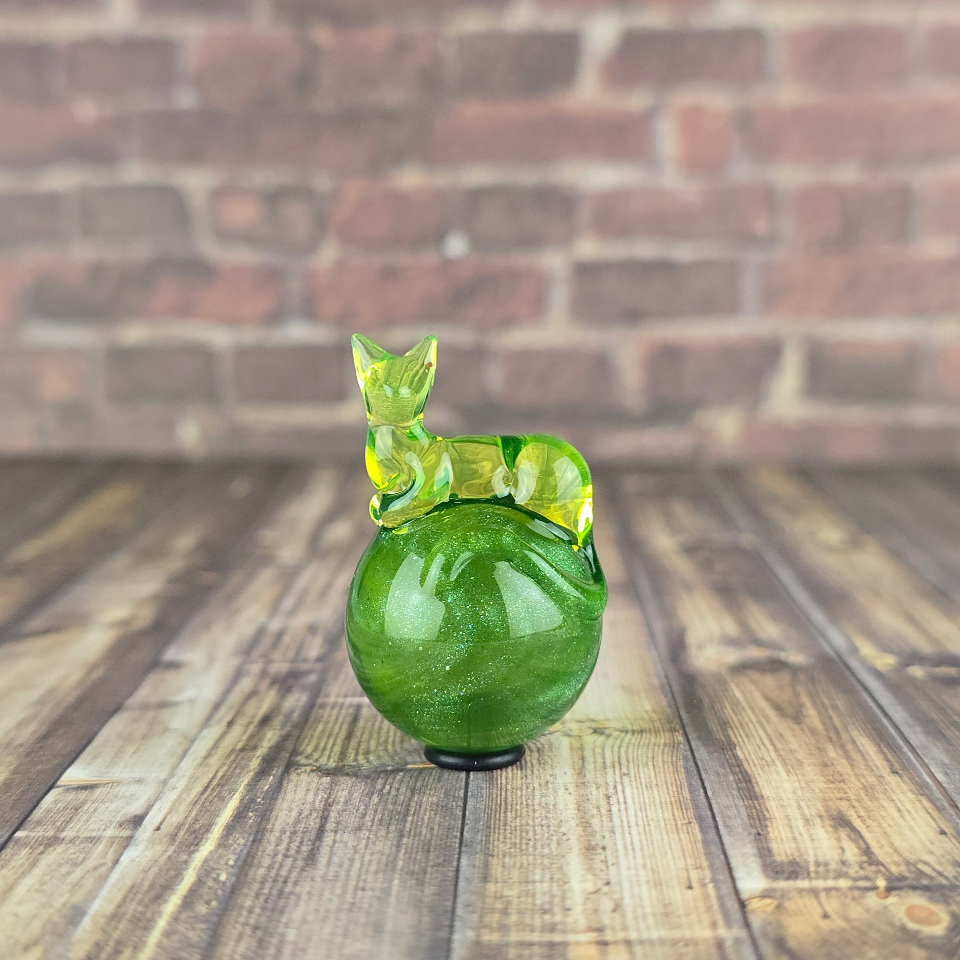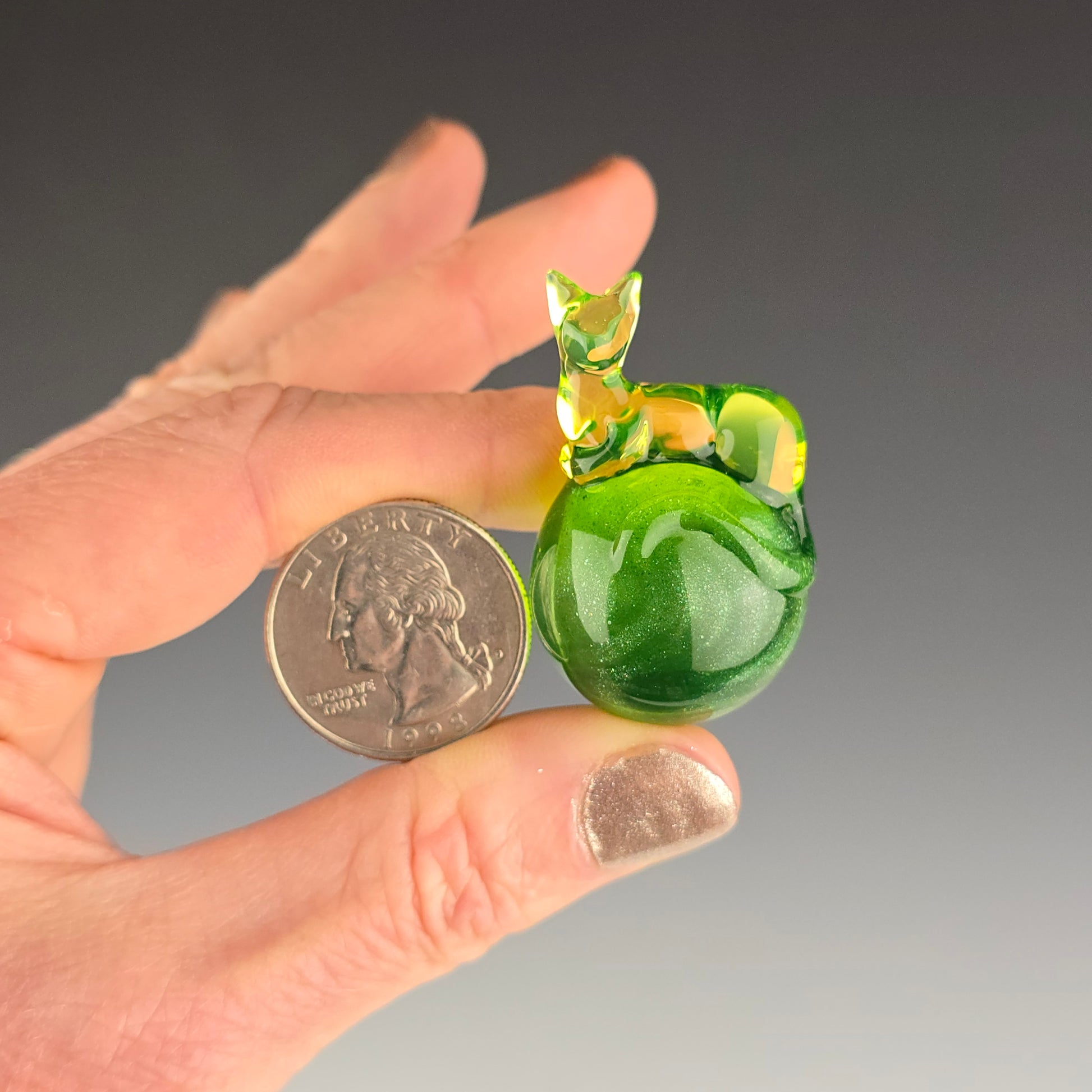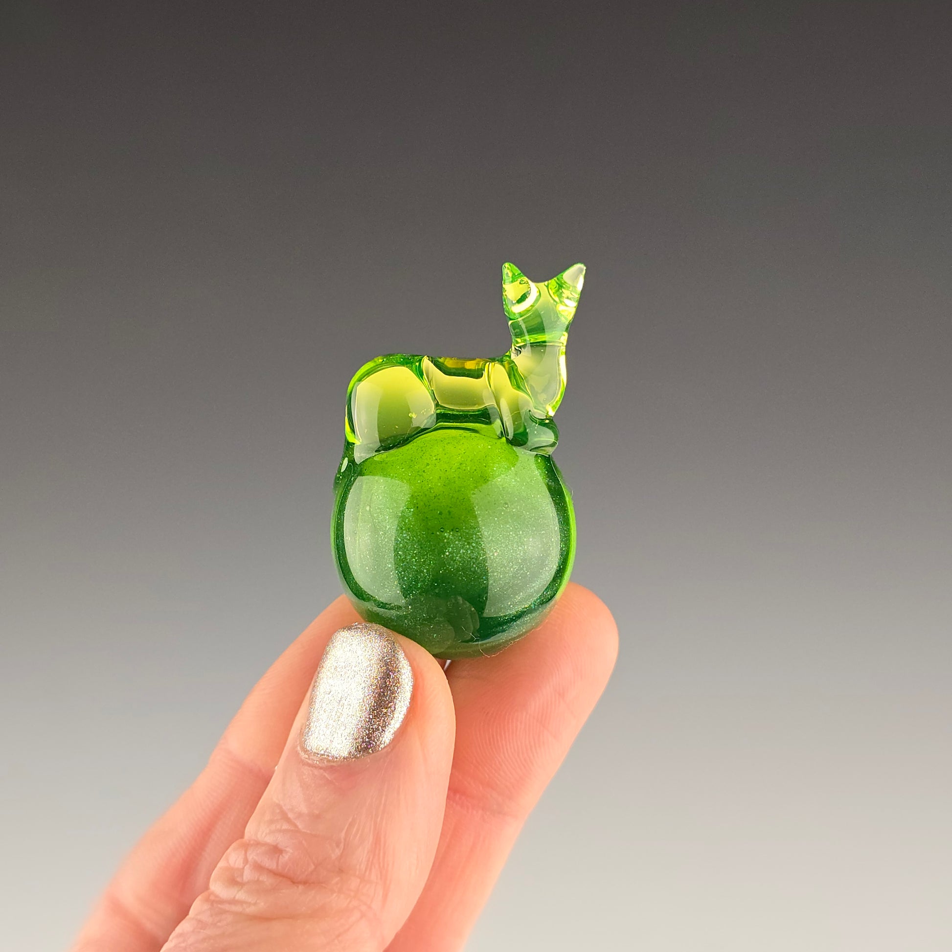 This 25mm Meowble is made with Green Stardust over UV reactive Ion & the Loaf is made of UV reactive Ion, so they both glow green under UV lighting.