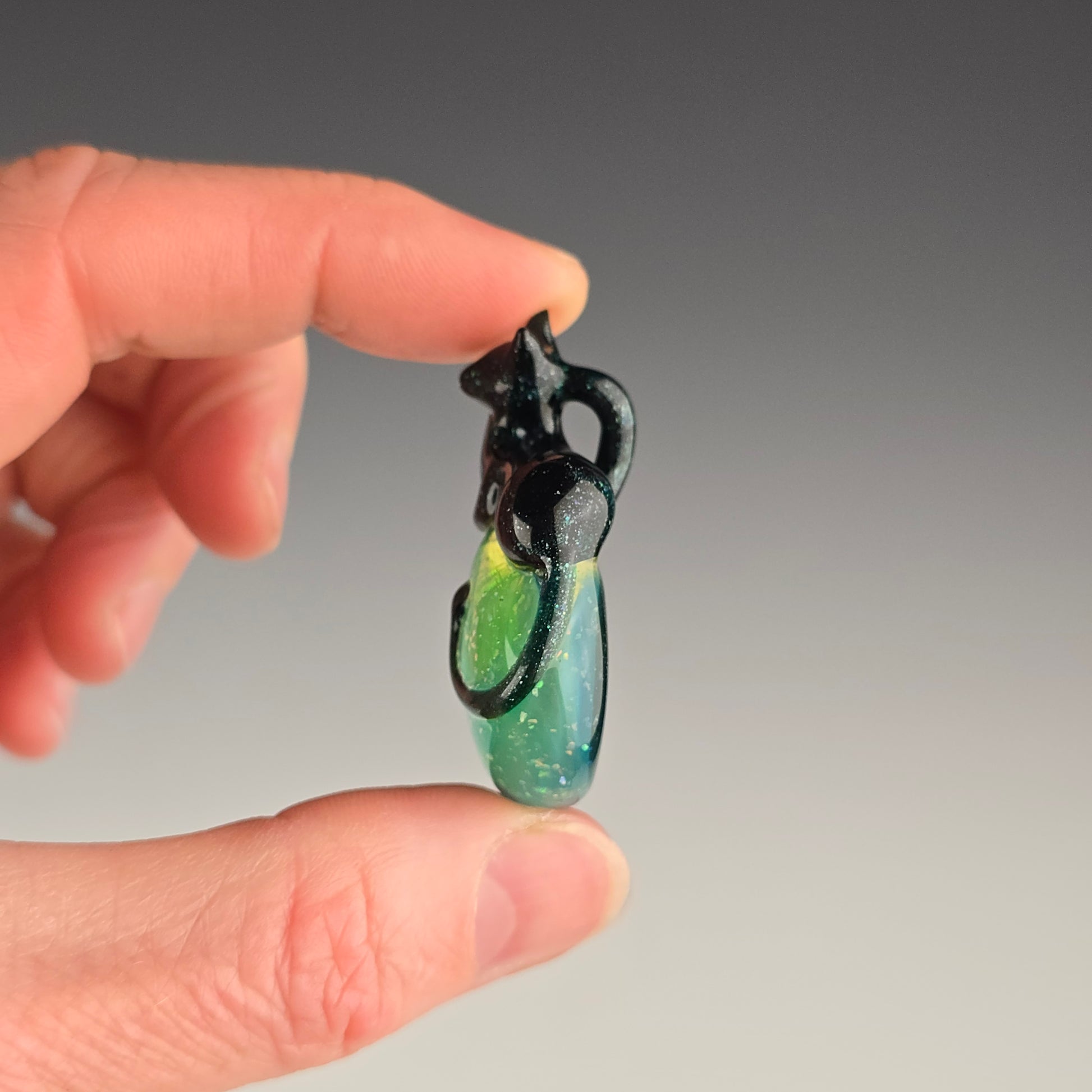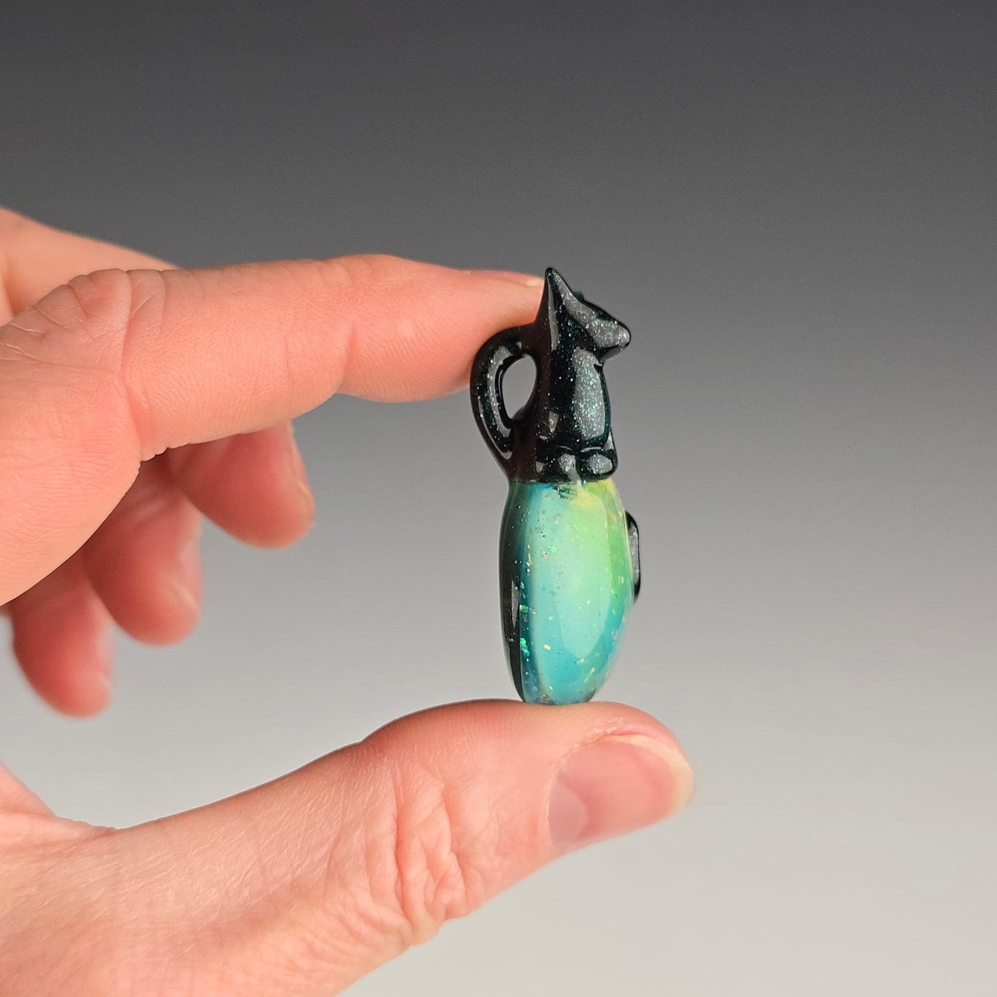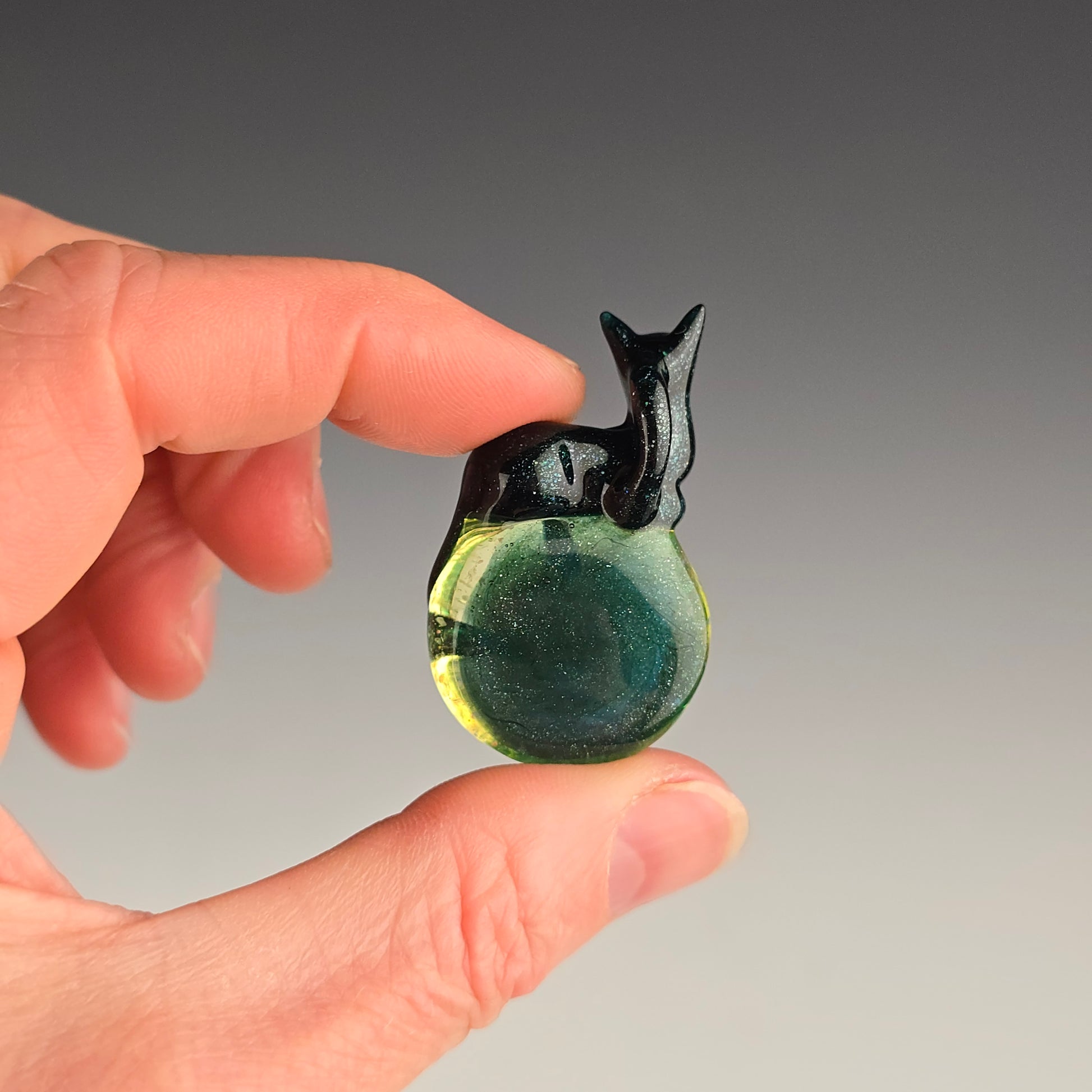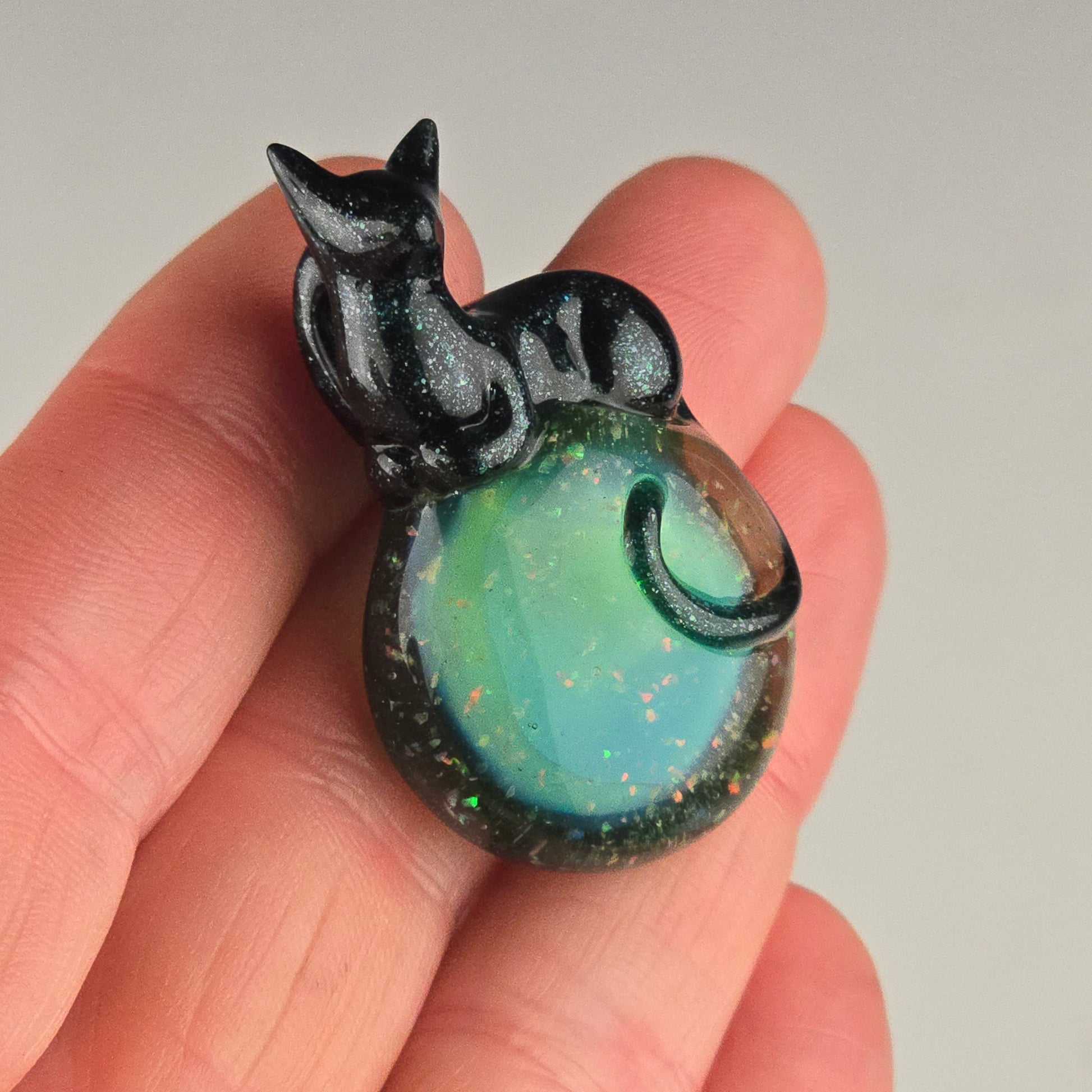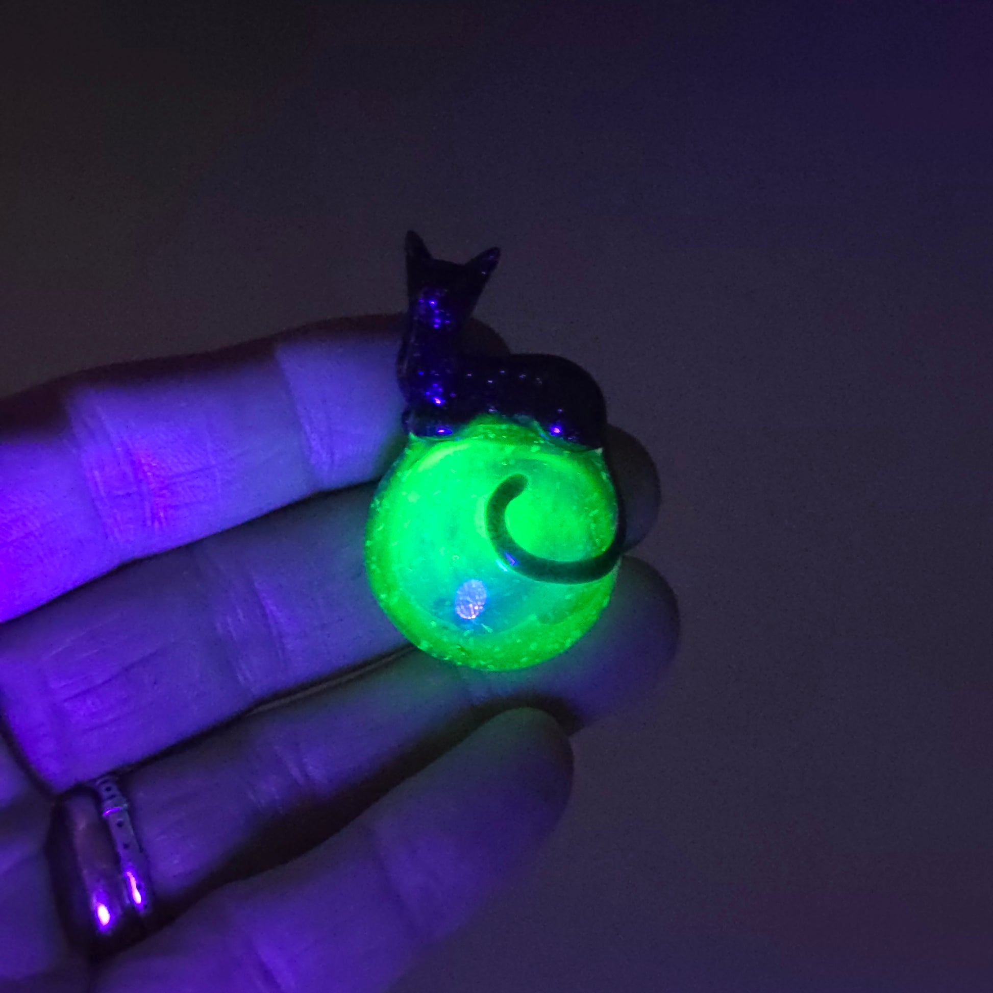 This Heavy Blue Leprechaun Loaf sits atop a UV reactive Ion & Crushed Opal coated Meta Terrania Ball. The Ball glows green under UV light. See photos for size reference.