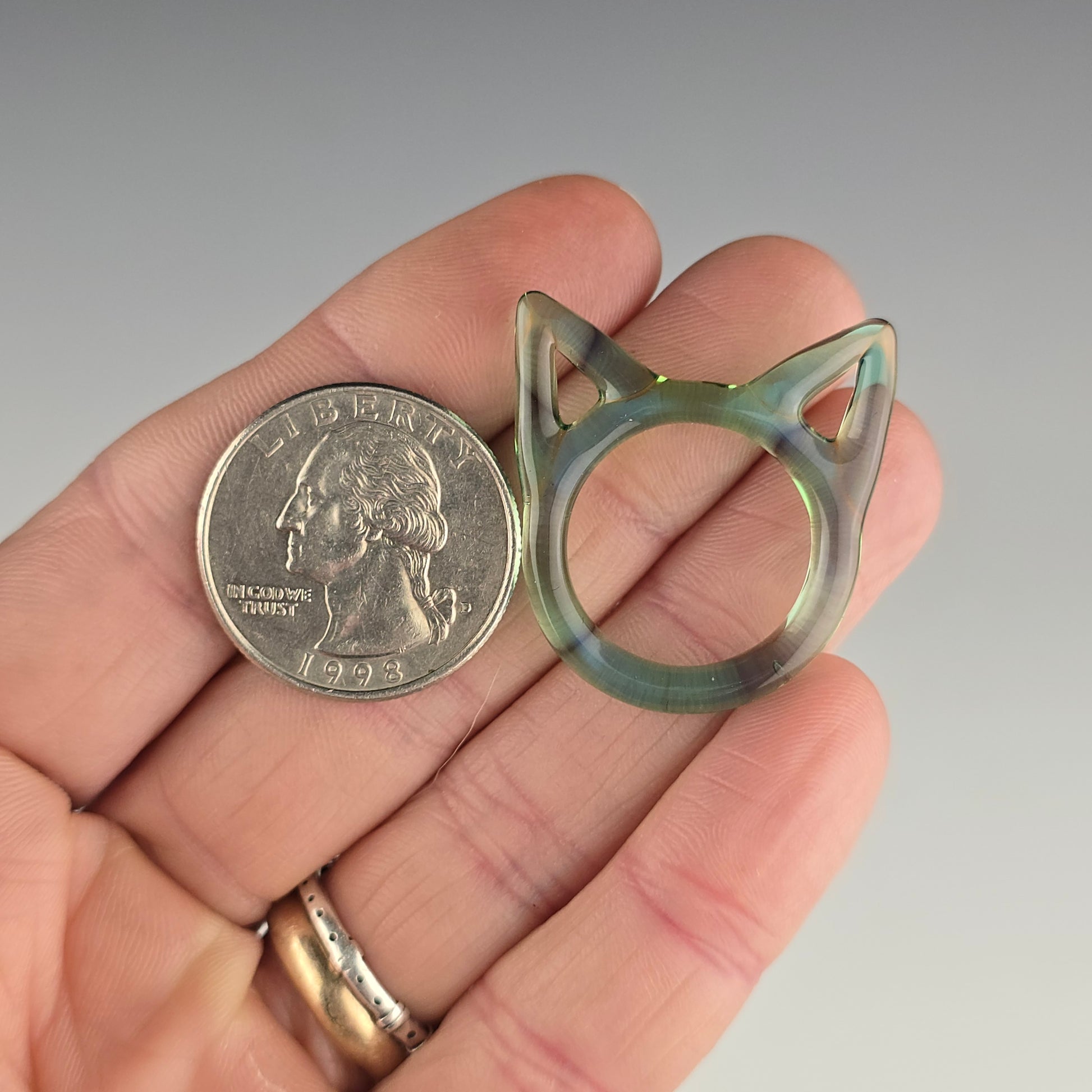 Made with UV reactive Ion over Meta Terrania by Molten Aura so this Kitty Face glows green under UV lighting, but the glow is not as bright as a solid Ion Kitty Face. See photos for size reference.