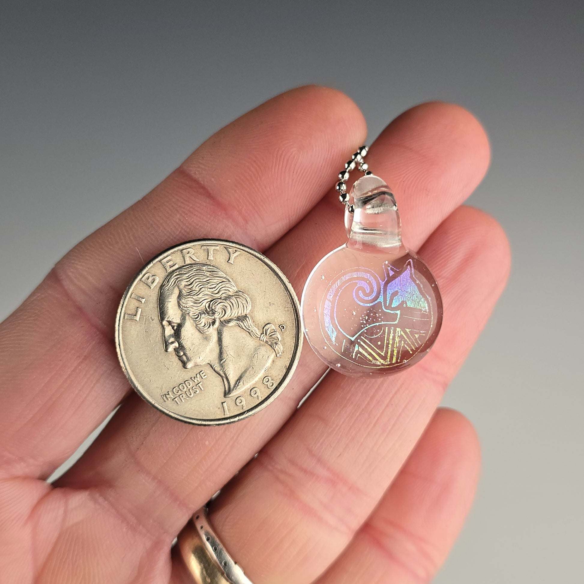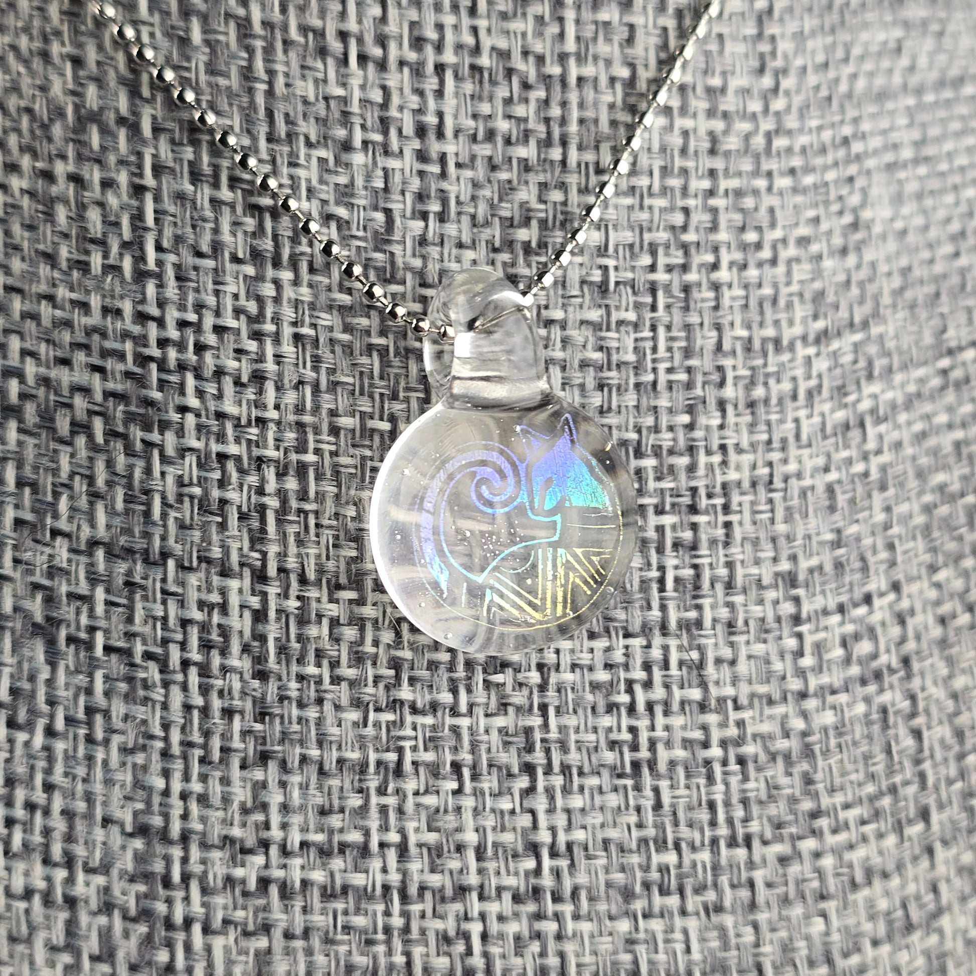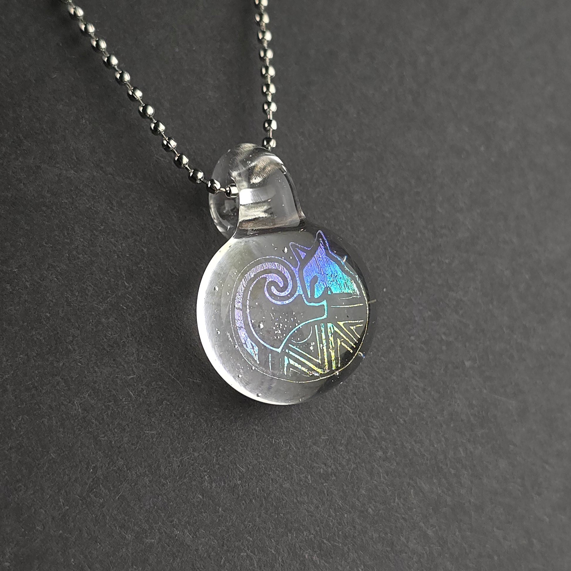 Rainbow Dichro Aztec Kitty with UV reactive Lucy background & bale, so this pendant glows pink under blacklight. See photos for size reference.