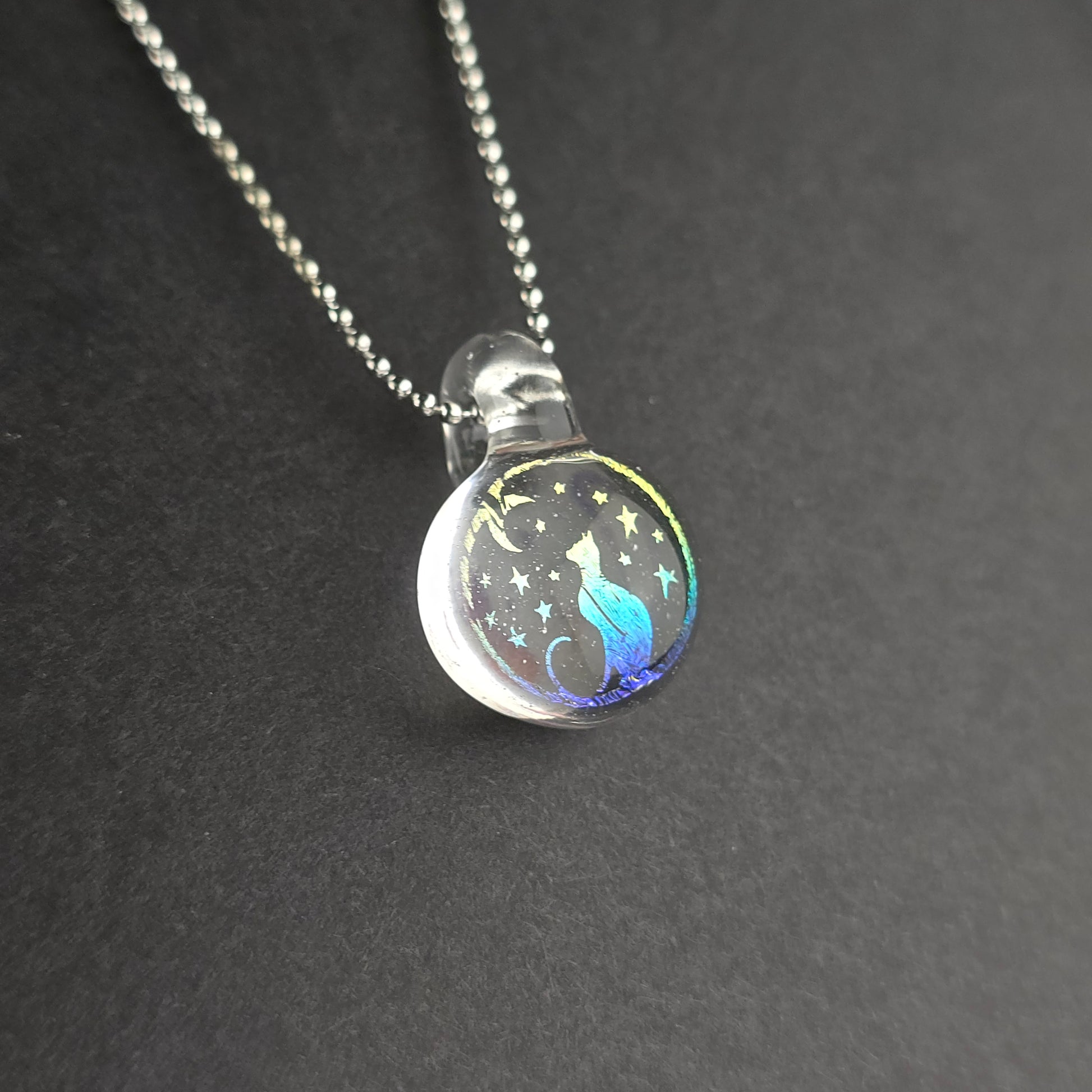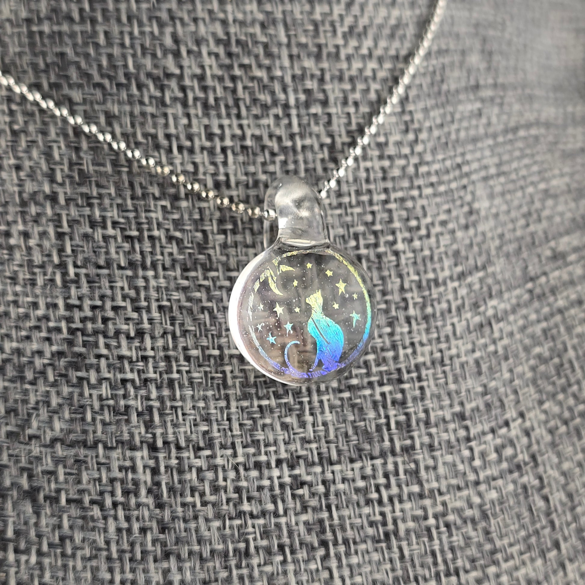 Rainbow Dichro Moon & Stars Kitty. Made with clear & UV reactive Lucy, which glows pink under UV light (blacklight). See photos for size reference.