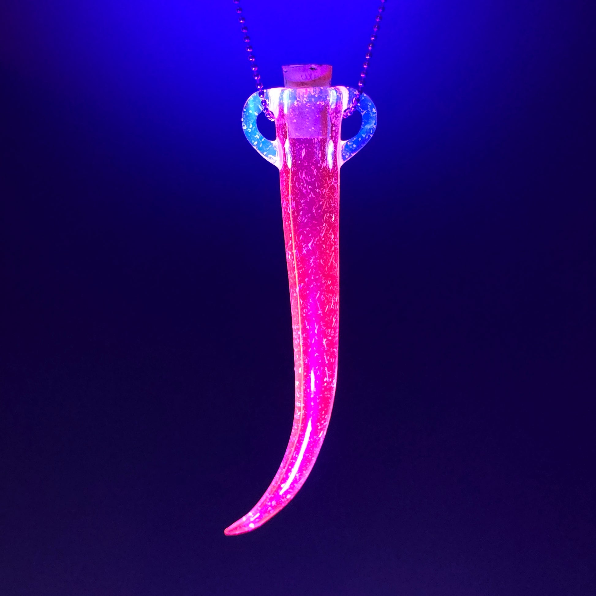 Made with UV reactive Pink Proton tubing that glows pink under UV light. The color accents are UV reactive Blu-V and glows blue under UV light. See photos for size reference.