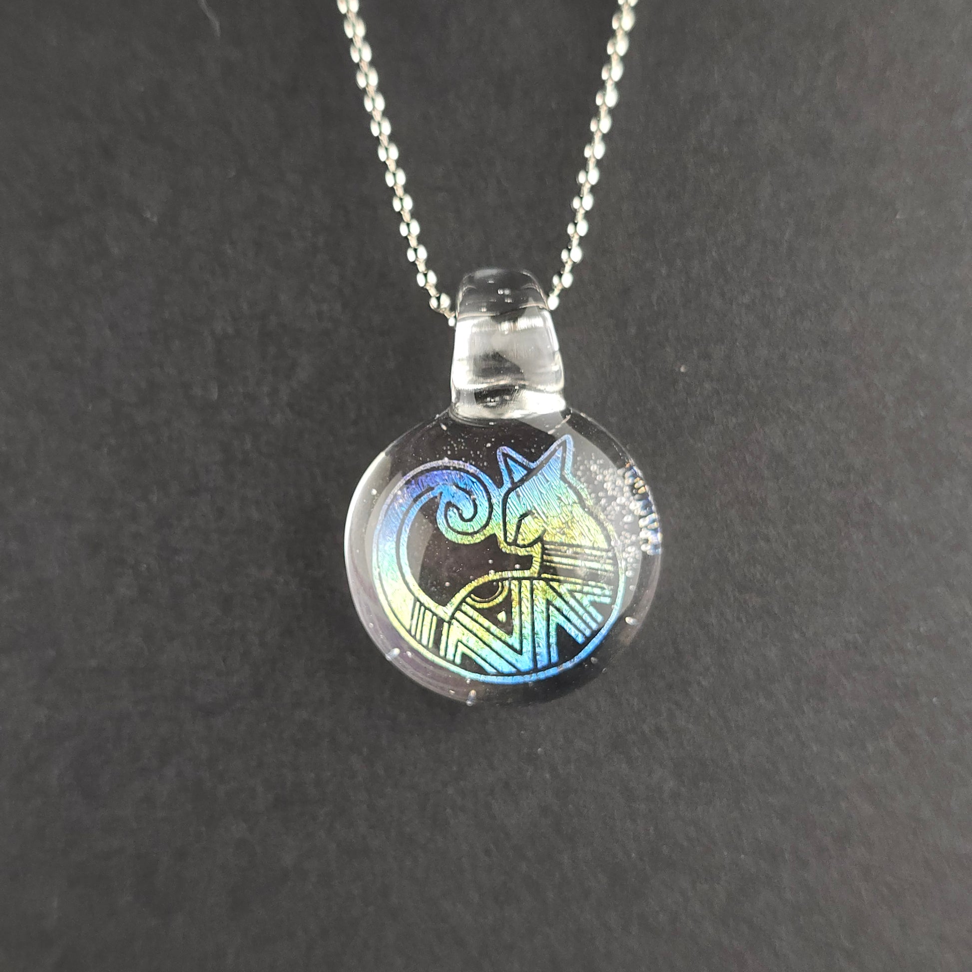 Blue & Gold Fade Dichro Aztec Kitty with UV reactive Lucy background & bale, so this pendant glows pink under blacklight. See photos for size reference.