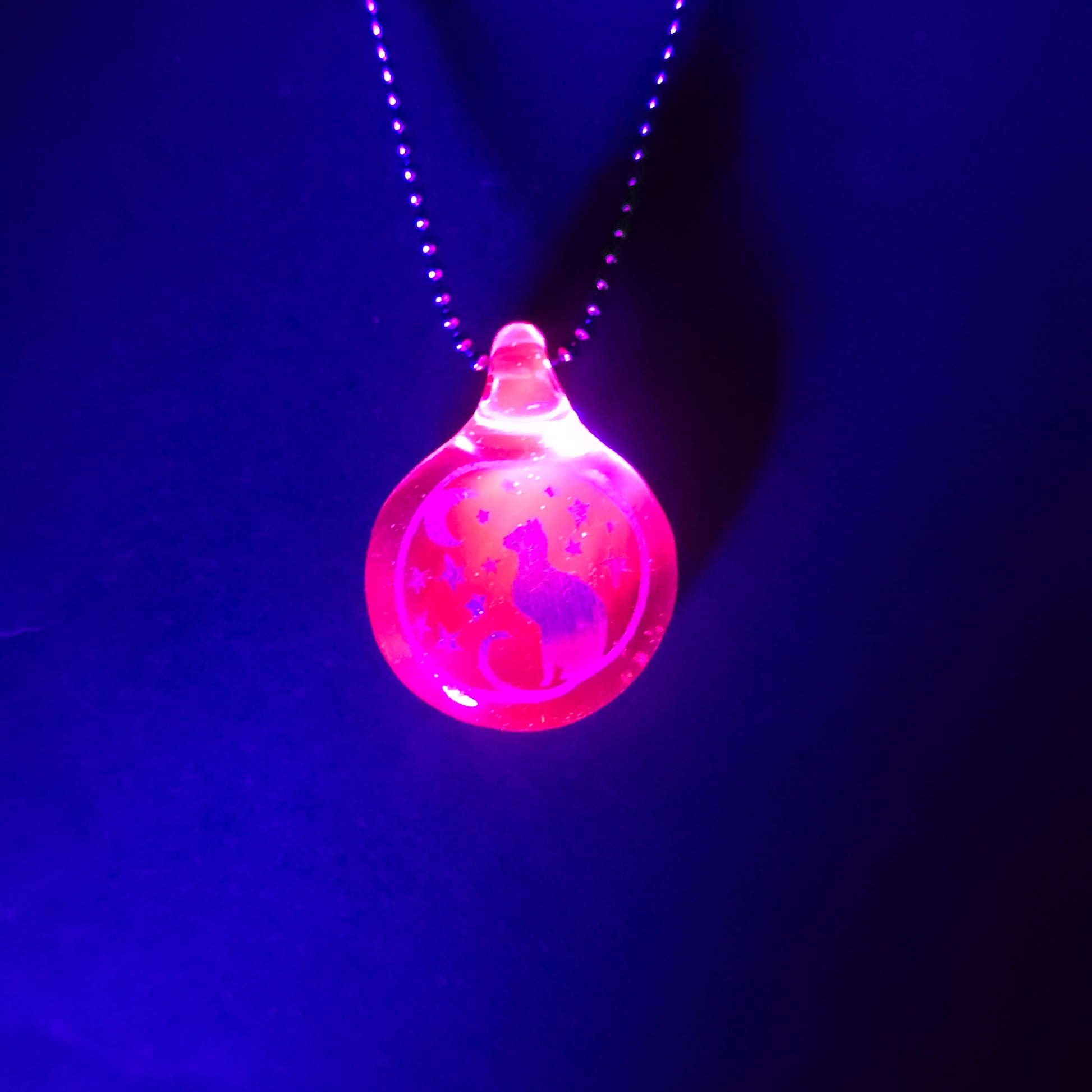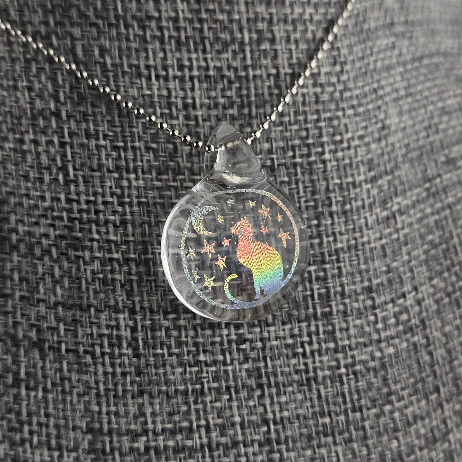 Rainbow Dichro Moon & Stars Kitty. Made with clear & UV reactive Lucy, which glows pink under UV light (blacklight). See photos for size reference.