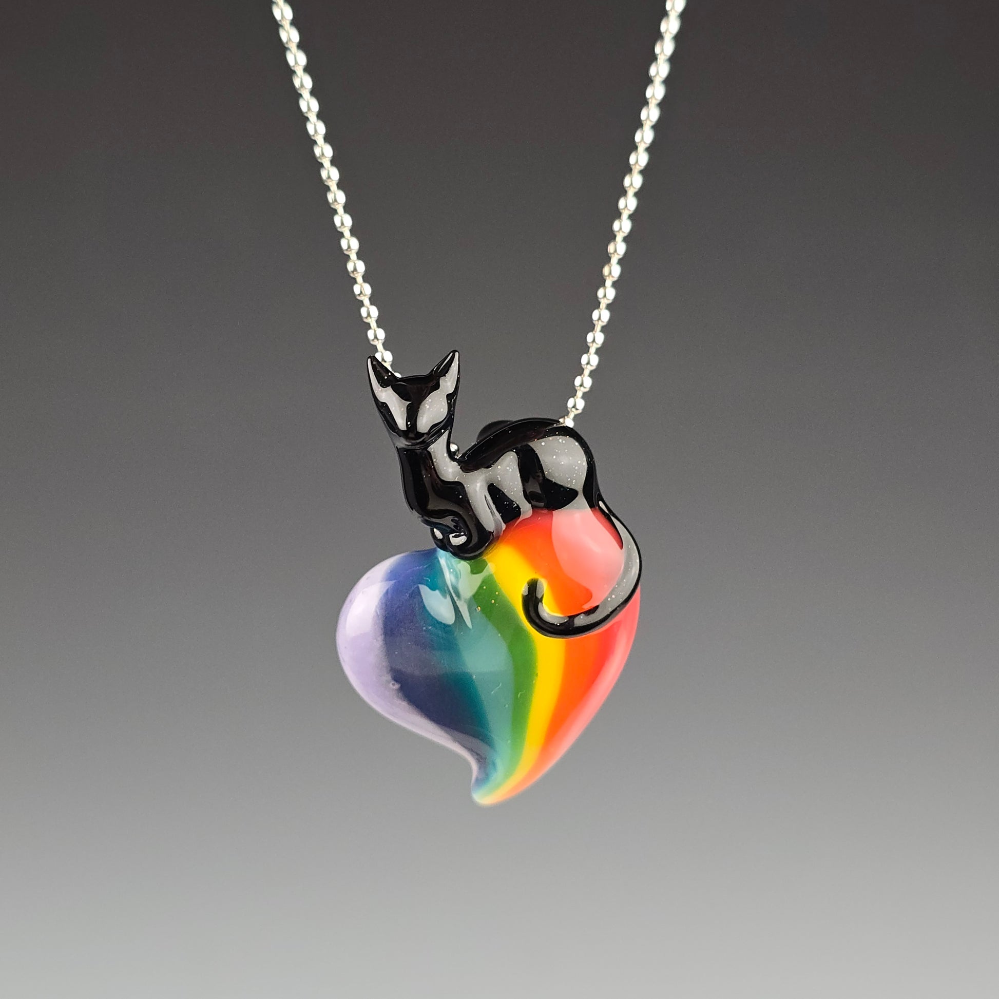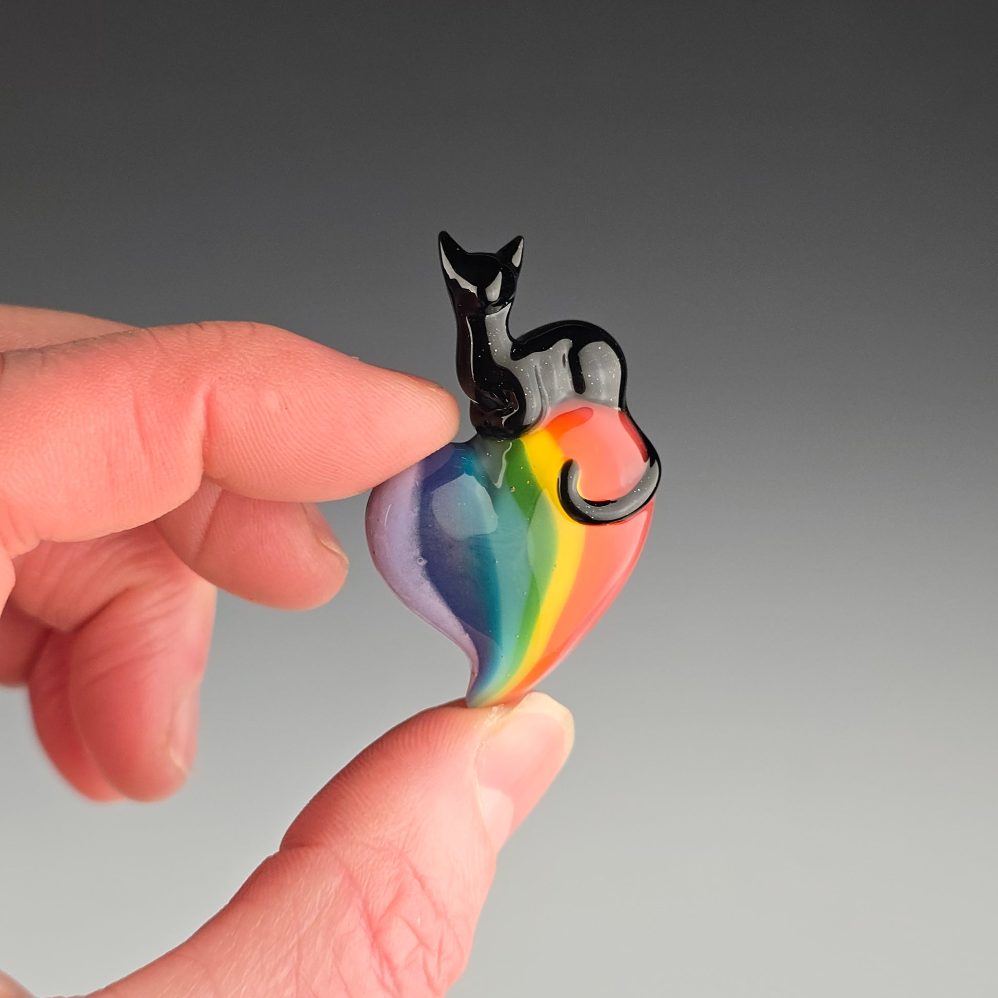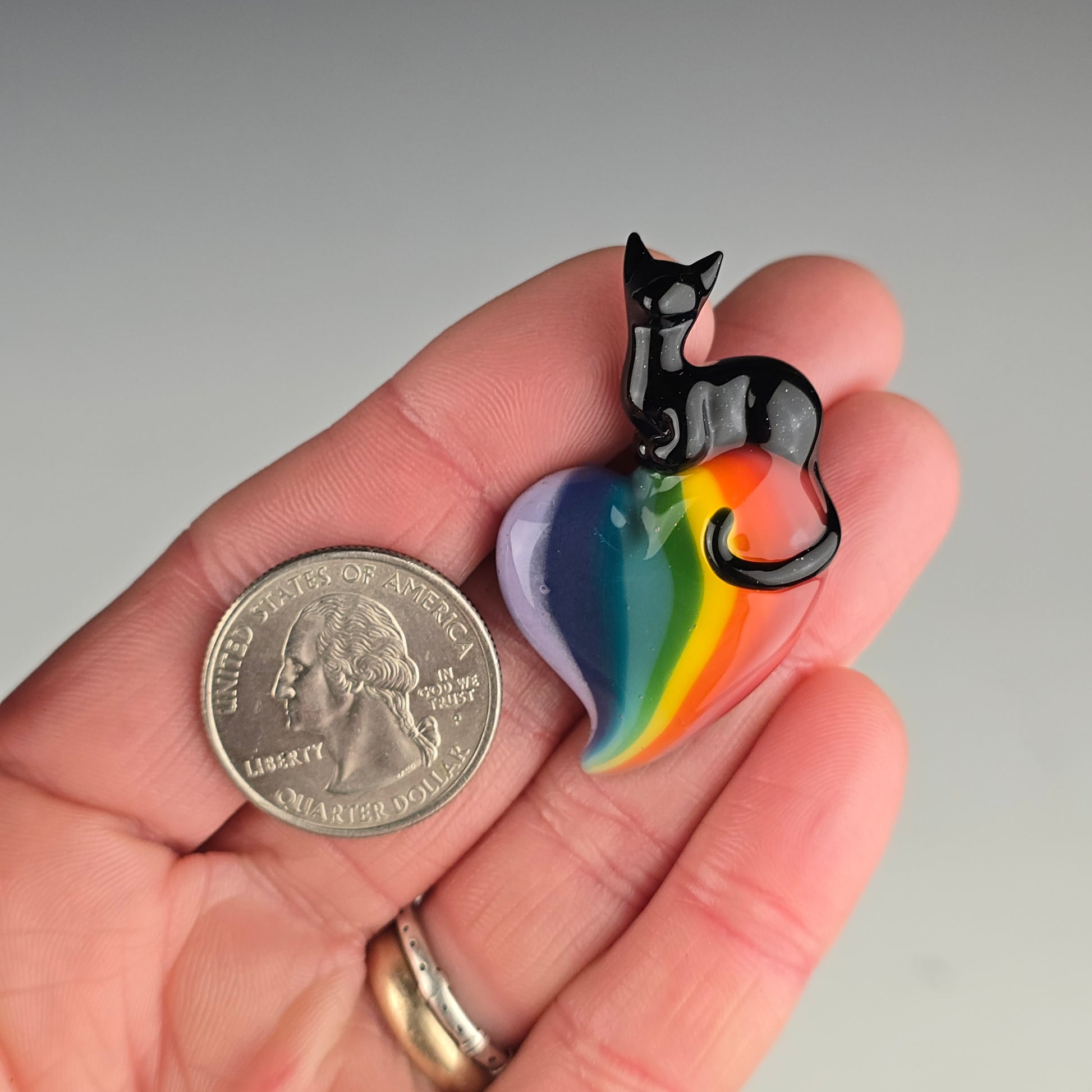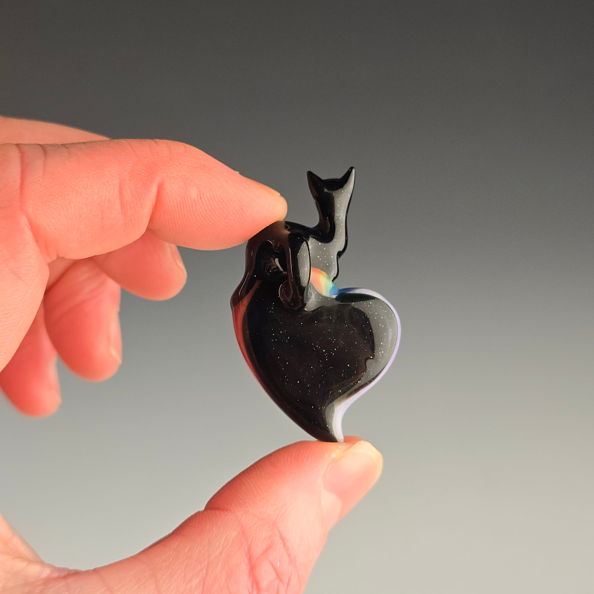 This shimmering Galaxy Black Kitty is loafing on a Rainbow Heart that is coated in UV reactive Lucy, so it glows pink under black light. See photos for size reference.