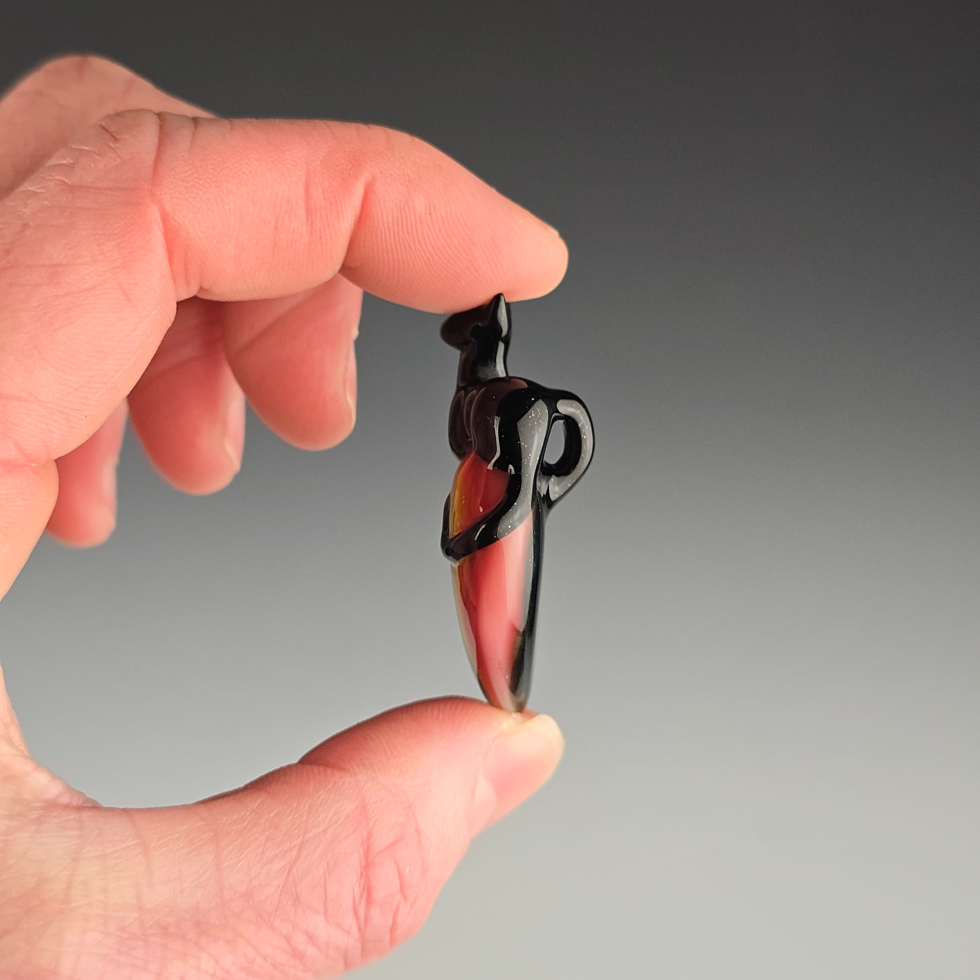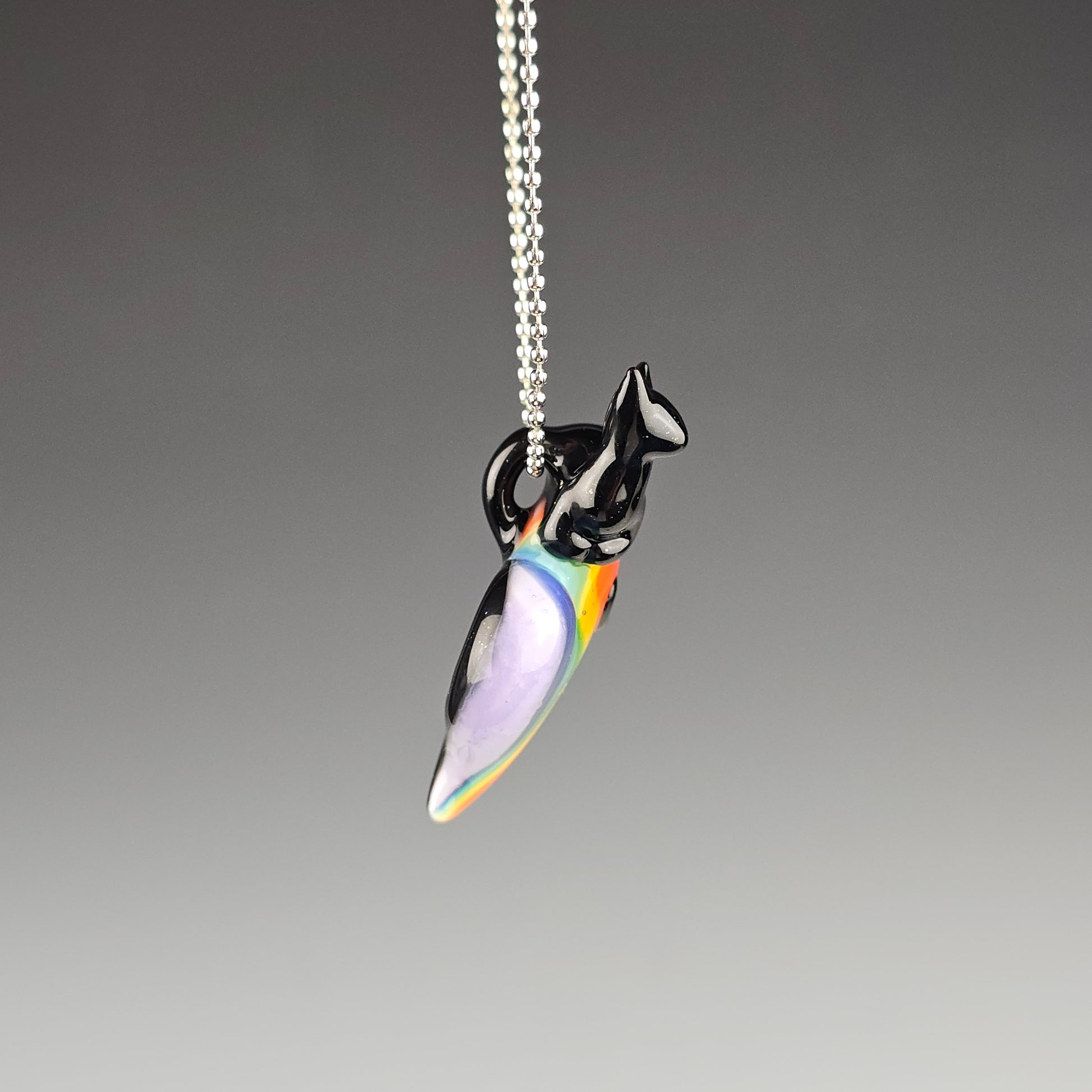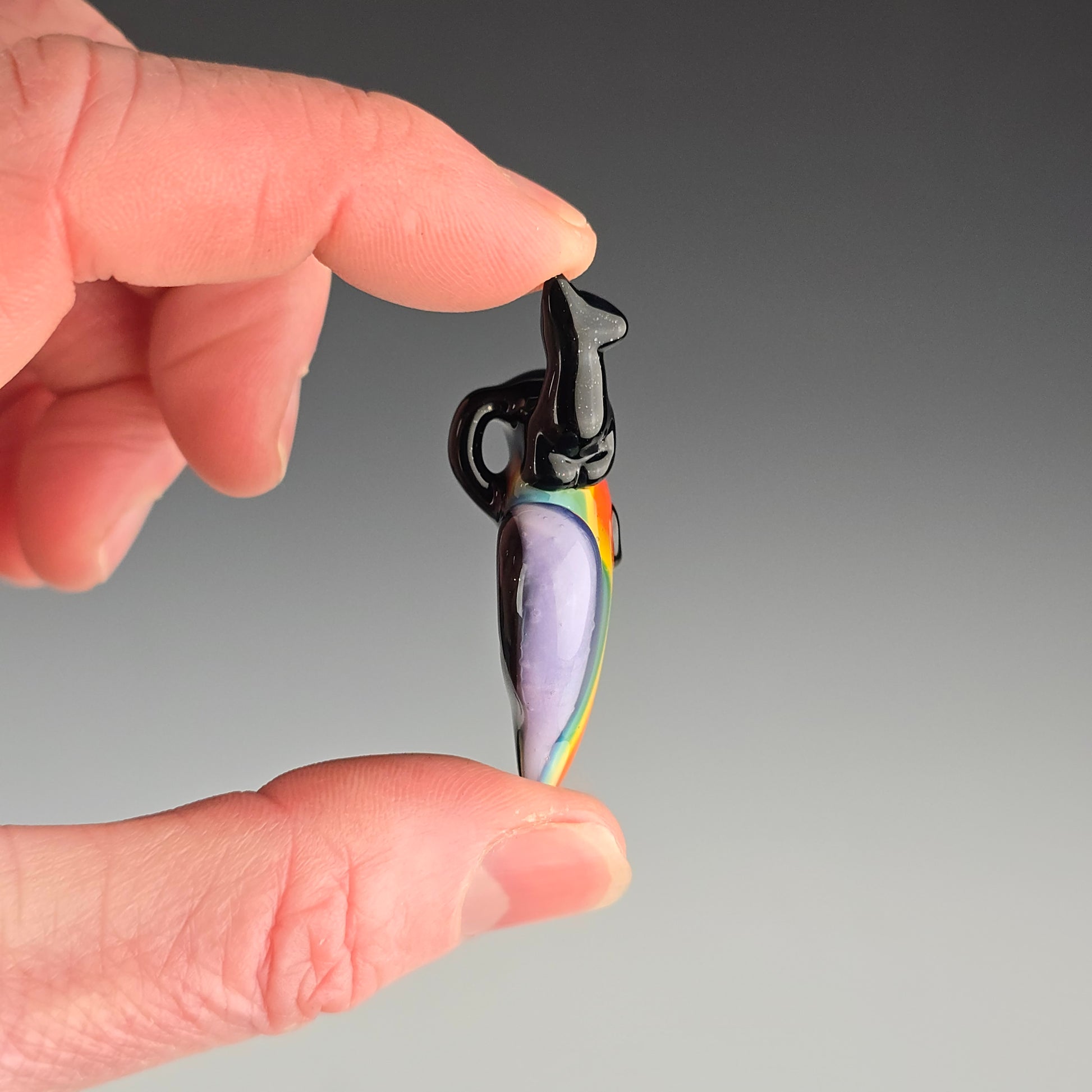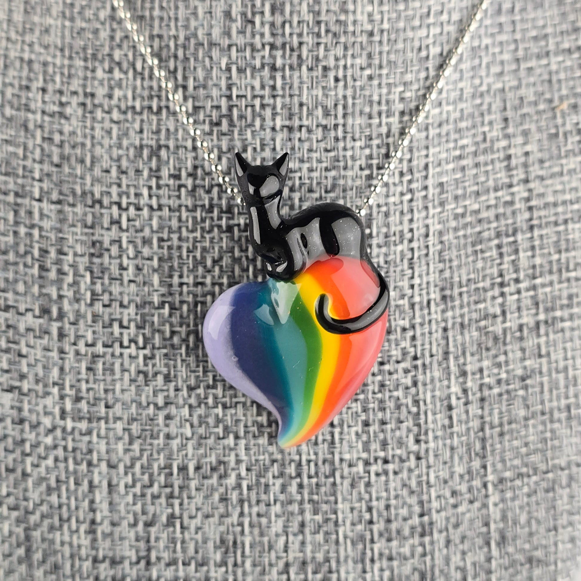 This shimmering Galaxy Black Kitty is loafing on a Rainbow Heart that is coated in UV reactive Lucy, so it glows pink under black light. See photos for size reference.
