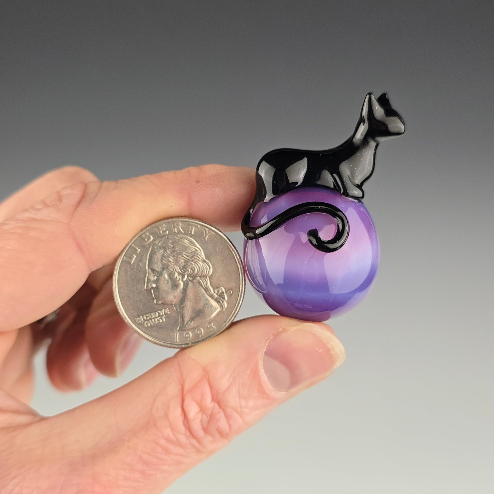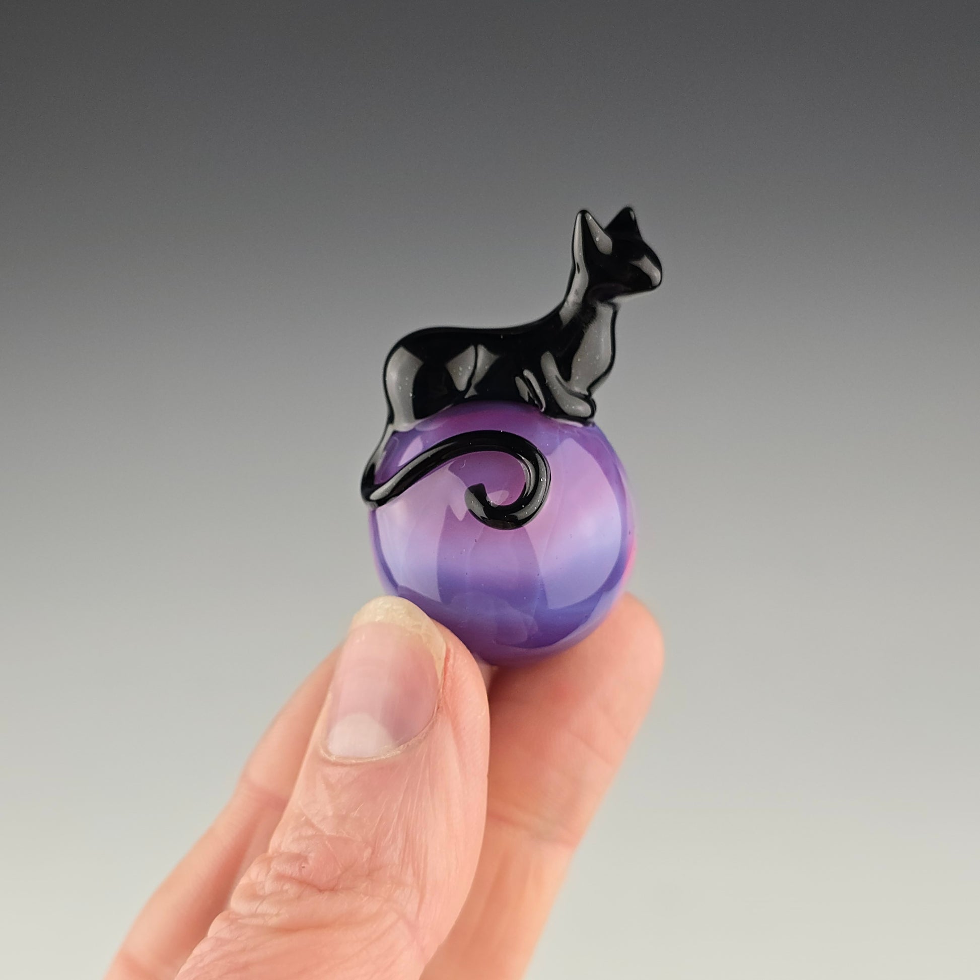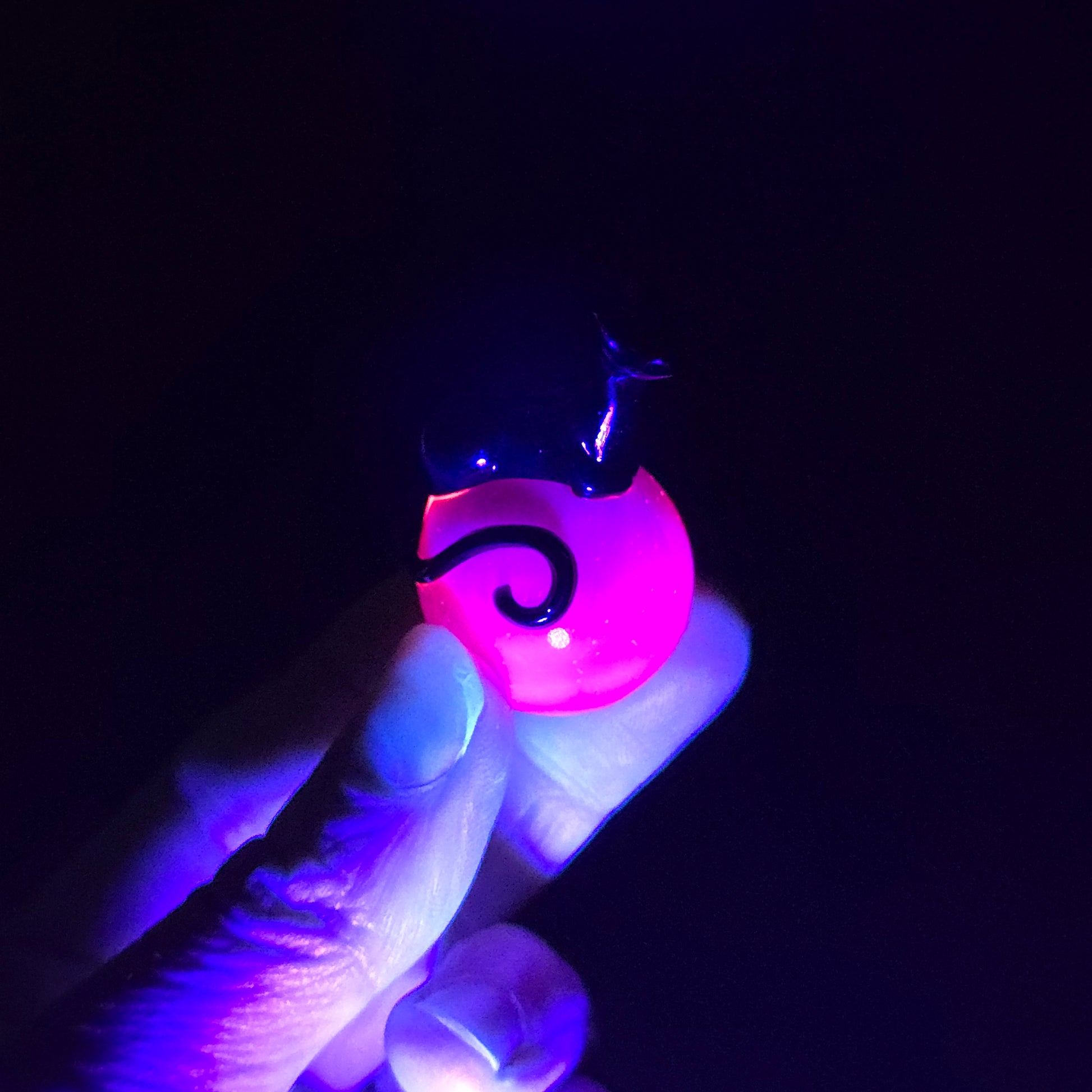 This 25mm Meowble is made with UV reactive Lucy over Royal Jelly with a Black Violet kitty loaf. The marble glows pink under UV light.