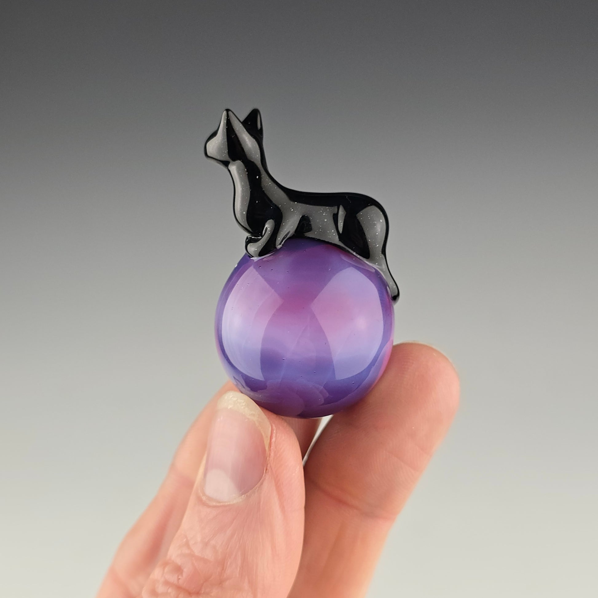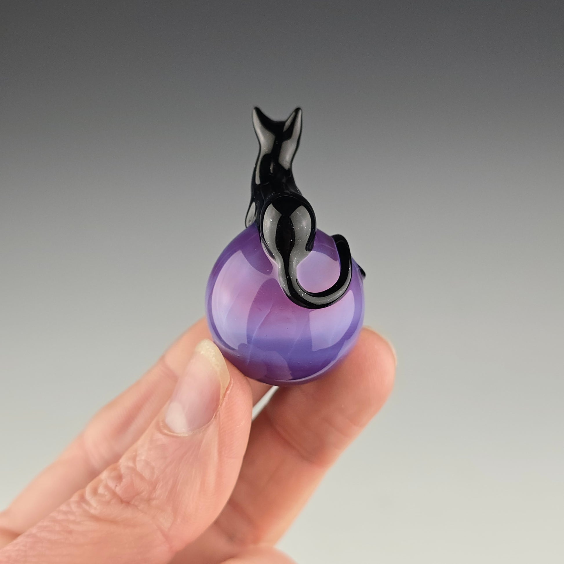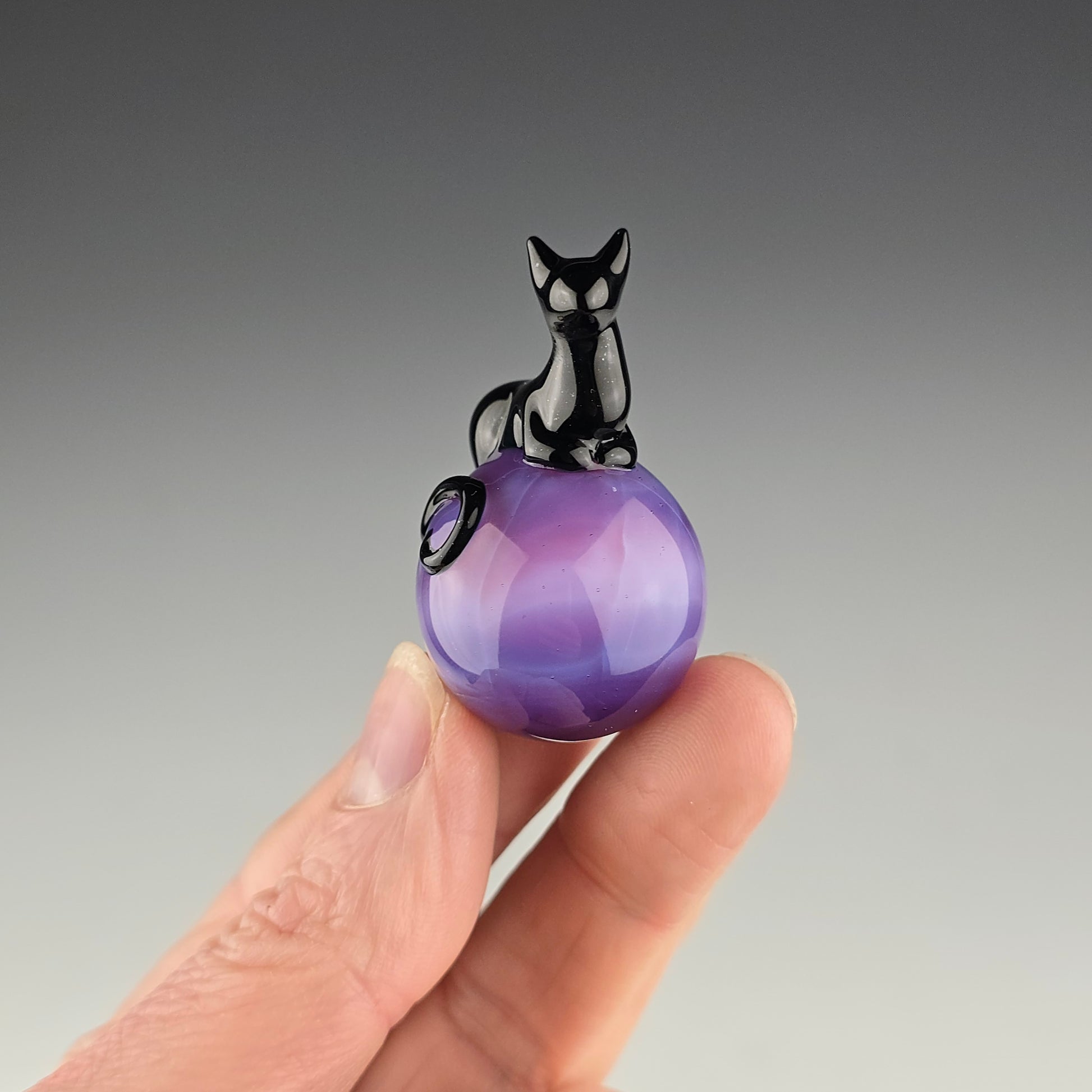 This 25mm Meowble is made with UV reactive Lucy over Royal Jelly with a Black Violet kitty loaf. The marble glows pink under UV light.